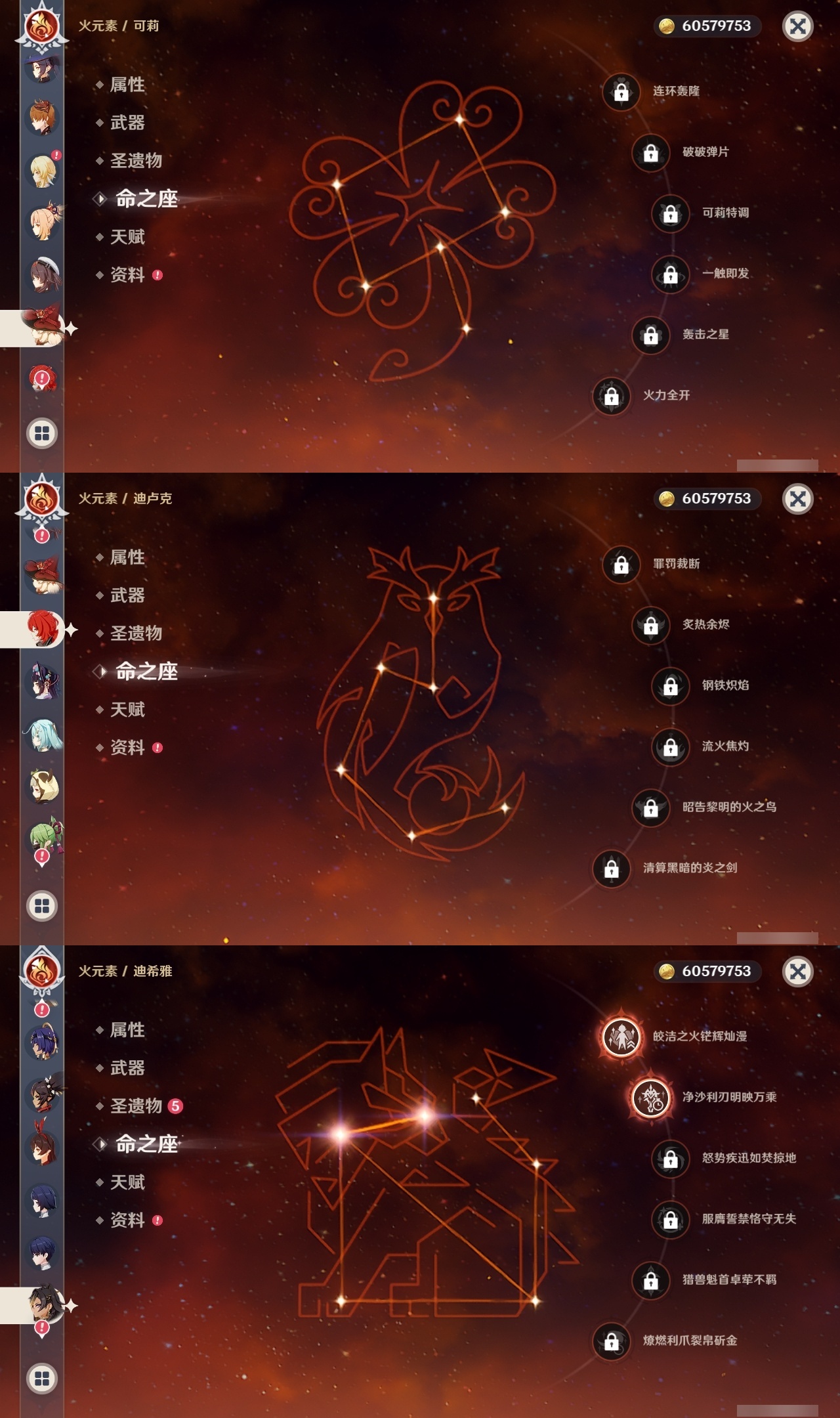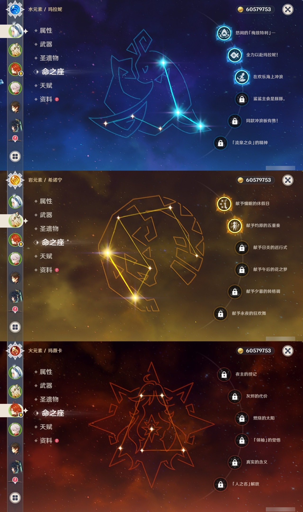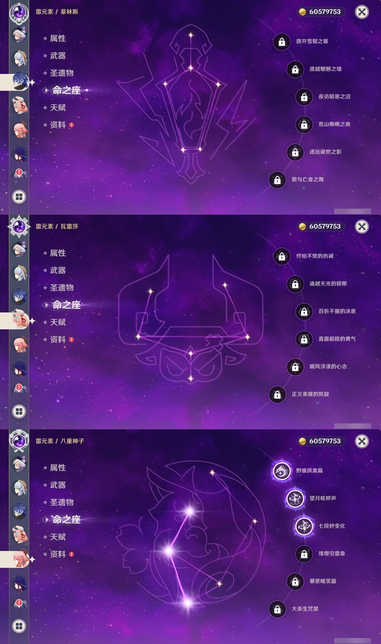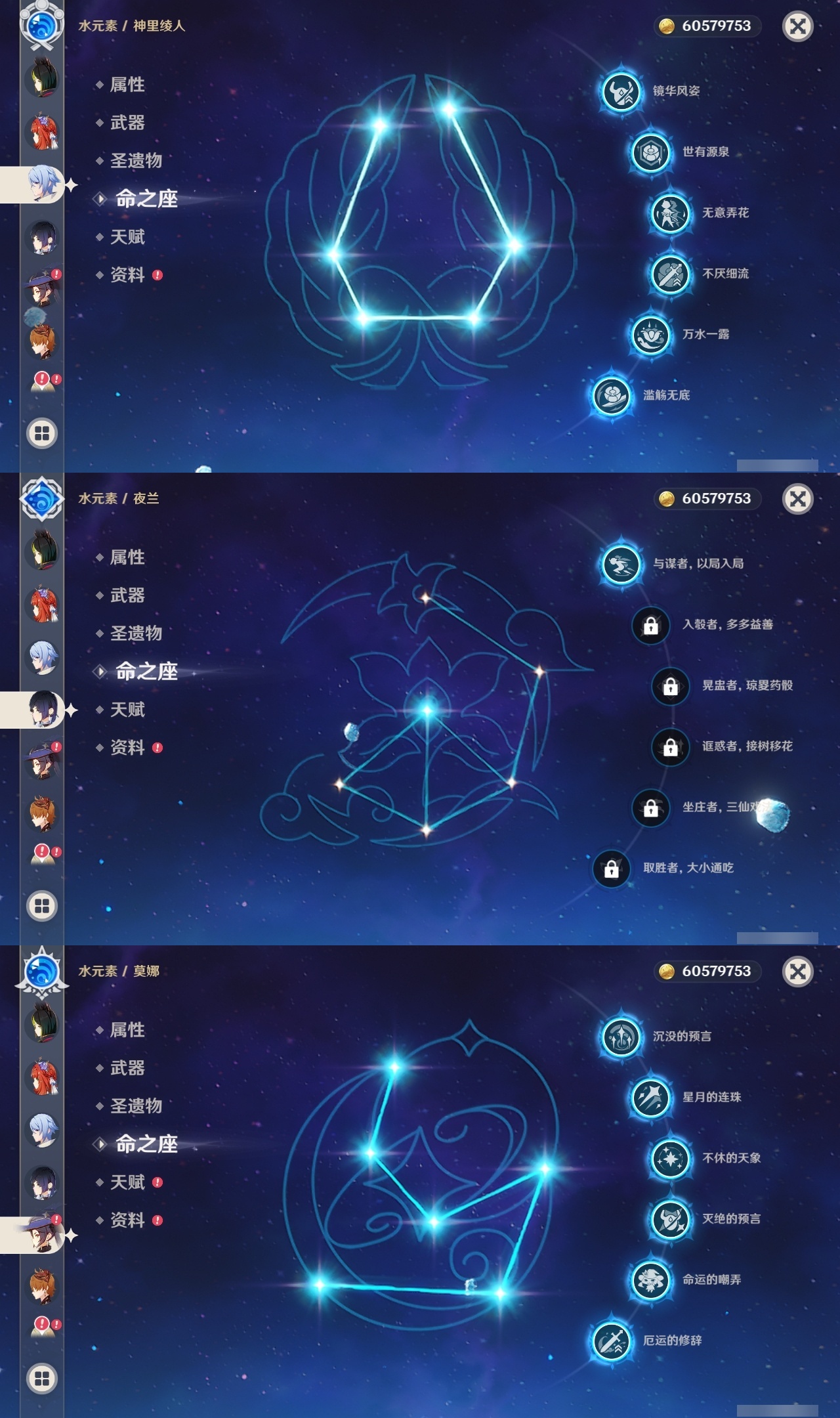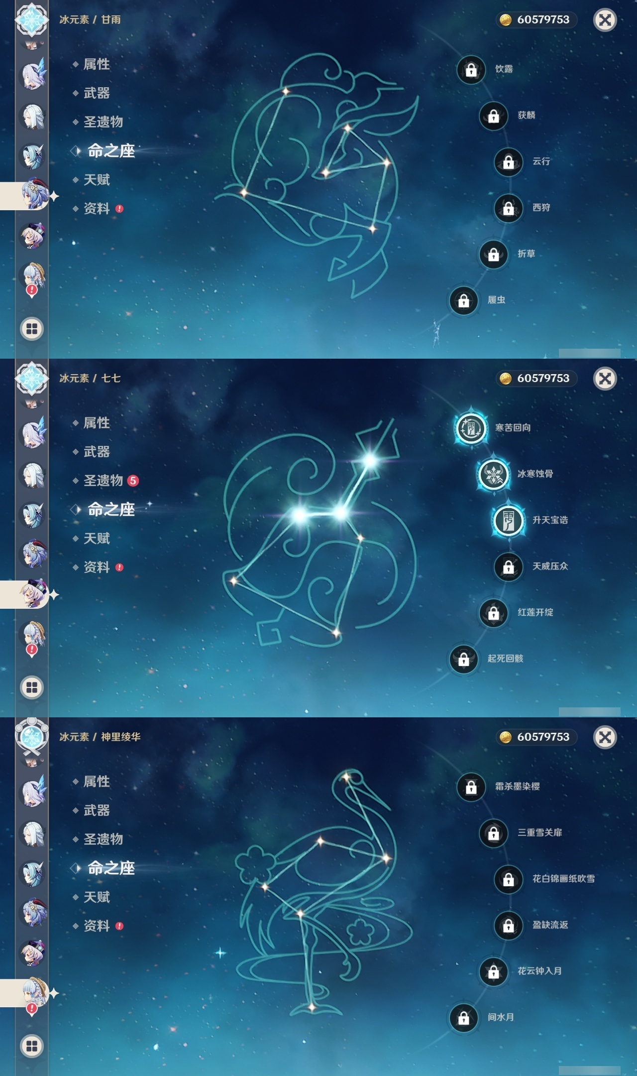 【原神】满命,冒险等级:60,五星数量:59,五星角色:刻晴 6命莫娜 6命神里绫人 6命玛拉妮 3命雷电将军 3命七七 3命申鹤 3命八重神子 3命希诺宁 2命迪希雅 2命枫原万叶 2命提纳里 2命胡桃 1命优菈 1命夜兰 1命琴神里绫华温迪玛薇卡宵宫钟离达达利亚瓦雷莎闲云丝柯克妮露纳西妲菲林斯艾尔海森流浪者迪卢克甘雨可莉__五星武器:无工之剑 5精冲浪时光岩峰巡歌鹤鸣余音阿莫斯之弓苍古自由之誓飞雷之弦振风鹰剑和璞鸢护摩之杖狼的末路磐岩结绿四风原典松籁响起之时天空之脊天空之刃天空之翼雾切之回光薙草之稻光终末嗟叹之诗若水圣显之钥千夜浮梦__四星角色:卡齐娜 6命班尼特 6命行秋 6命九条裟罗 6命香菱 6命鹿野院平藏 6命珐露珊 6命凝光 6命迪奥娜 6命砂糖 6命瑶瑶 6命莱依拉 6命多莉 6命柯莱 6命芭芭拉 6命云堇 6命早柚 6命托马 6命烟绯 6命重云 6命辛焱 6命诺艾尔 6命罗莎莉亚 6命雷泽 6命菲谢尔 6命北斗 6命夏沃蕾 6命嘉明 4命坎蒂丝 3命久岐忍 2命绮良良 2命米卡 2命五郎 2命夏洛蒂 2命欧洛伦 1命琳妮特 1命塔利雅 1命赛索斯 1命埃洛伊奇偶·女性奇偶·男性卡维蓝砚菲米尼伊法伊安珊