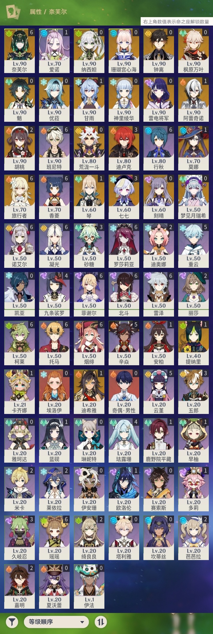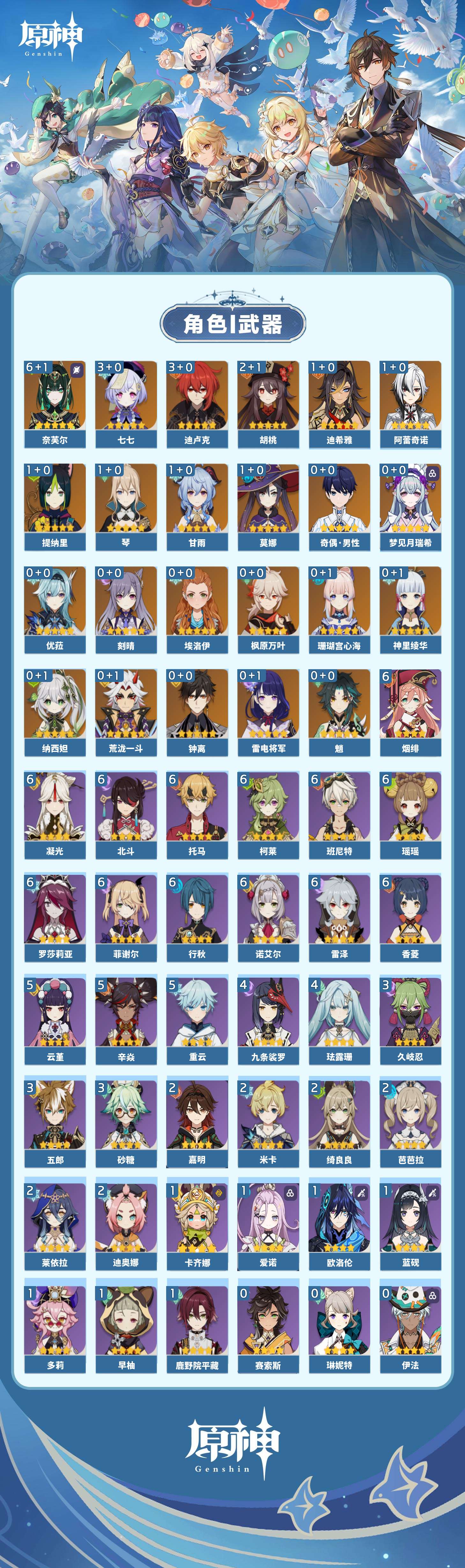 【原神】【lyys10950】冒险等级:59,五星数量:34,五星角色:奈芙尔 6命迪卢克 3命七七 3命胡桃 2命迪希雅 1命阿蕾奇诺 1命甘雨 1命莫娜 1命琴 1命提纳里 1命珊瑚宫心海神里绫华优菈钟离荒泷一斗梦见月瑞希纳西妲枫原万叶魈刻晴雷电将军__五星武器:天空之刃 2精真语秘匣不灭月华护摩之杖天空之傲天空之脊天空之翼雾切之回光薙草之稻光赤角石溃杵千夜浮梦__四星角色:班尼特 6命行秋 6命香菱 6命凝光 6命瑶瑶 6命柯莱 6命托马 6命烟绯 6命诺艾尔 6命罗莎莉亚 6命雷泽 6命菲谢尔 6命北斗 6命云堇 5命重云 5命辛焱 5命九条裟罗 4命珐露珊 4命久岐忍 3命砂糖 3命五郎 3命迪奥娜 2命绮良良 2命莱依拉 2命米卡 2命芭芭拉 2命嘉明 2命卡齐娜 1命鹿野院平藏 1命多莉 1命欧洛伦 1命蓝砚 1命早柚 1命爱诺 1命埃洛伊奇偶·男性坎蒂丝琳妮特夏沃蕾伊法伊安珊塔利雅赛索斯
