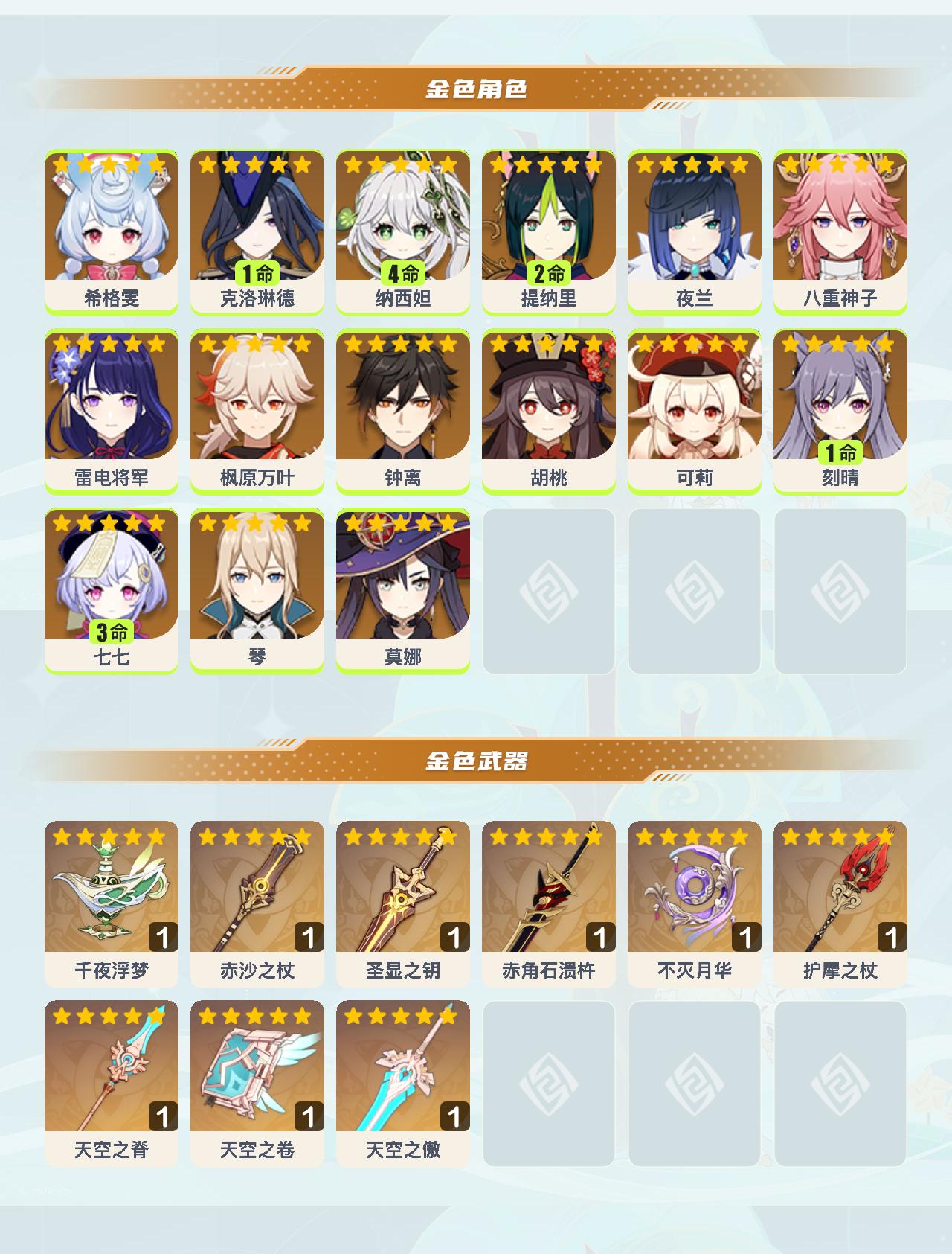 【ysyt683】60级/35黄/男主/15个五星角色/9个五星武器/4命纳西妲/0命可莉/0命雷电将军/0命胡桃/0命希格雯/0命钟离/0命枫原万叶/1命克洛琳德/0命八重神子/2命提纳里/0命夜兰/3命七七/0命琴/1命刻晴/0命莫娜/精1千夜浮梦/精1天空之卷/精1天空之脊/精1护摩之杖/精1赤沙之杖/精1赤角石溃杵/精1圣显之钥/精1不灭月华/精1天空之傲