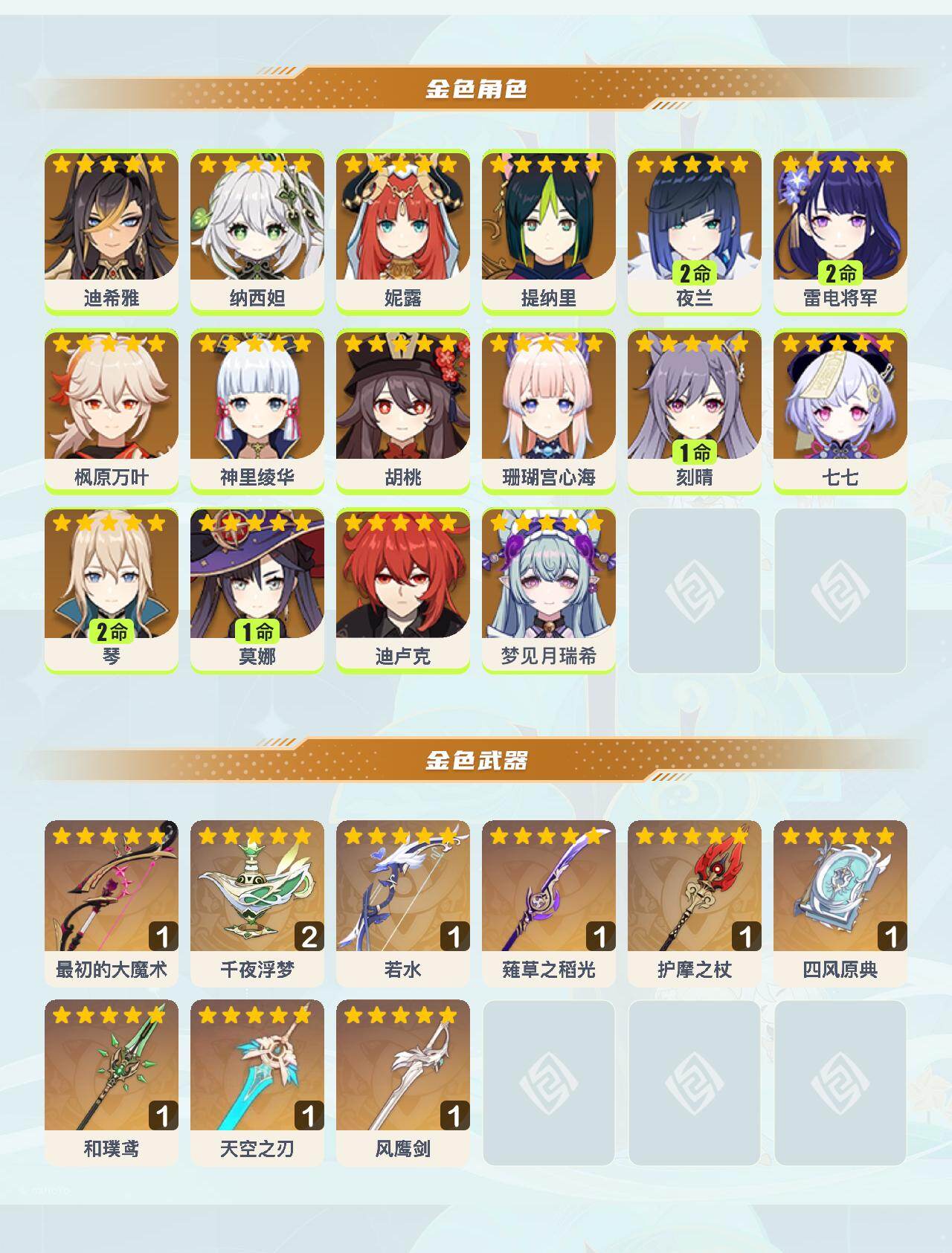 【ysyt678】58级/34黄/女主/16个五星角色/9个五星武器/2命雷电将军/2命夜兰/0命纳西妲/0命枫原万叶/0命神里绫华/0命胡桃/0命妮露/0命珊瑚宫心海/1命莫娜/0命梦见月瑞希/2命琴/0命提纳里/0命迪希雅/0命七七/0命迪卢克/1命刻晴/精1最初的大魔术/精1若水/精2千夜浮梦/精1和璞鸢/精1护摩之杖/精1薙草之稻光/精1天空之刃/精1风鹰剑/精1四风原典