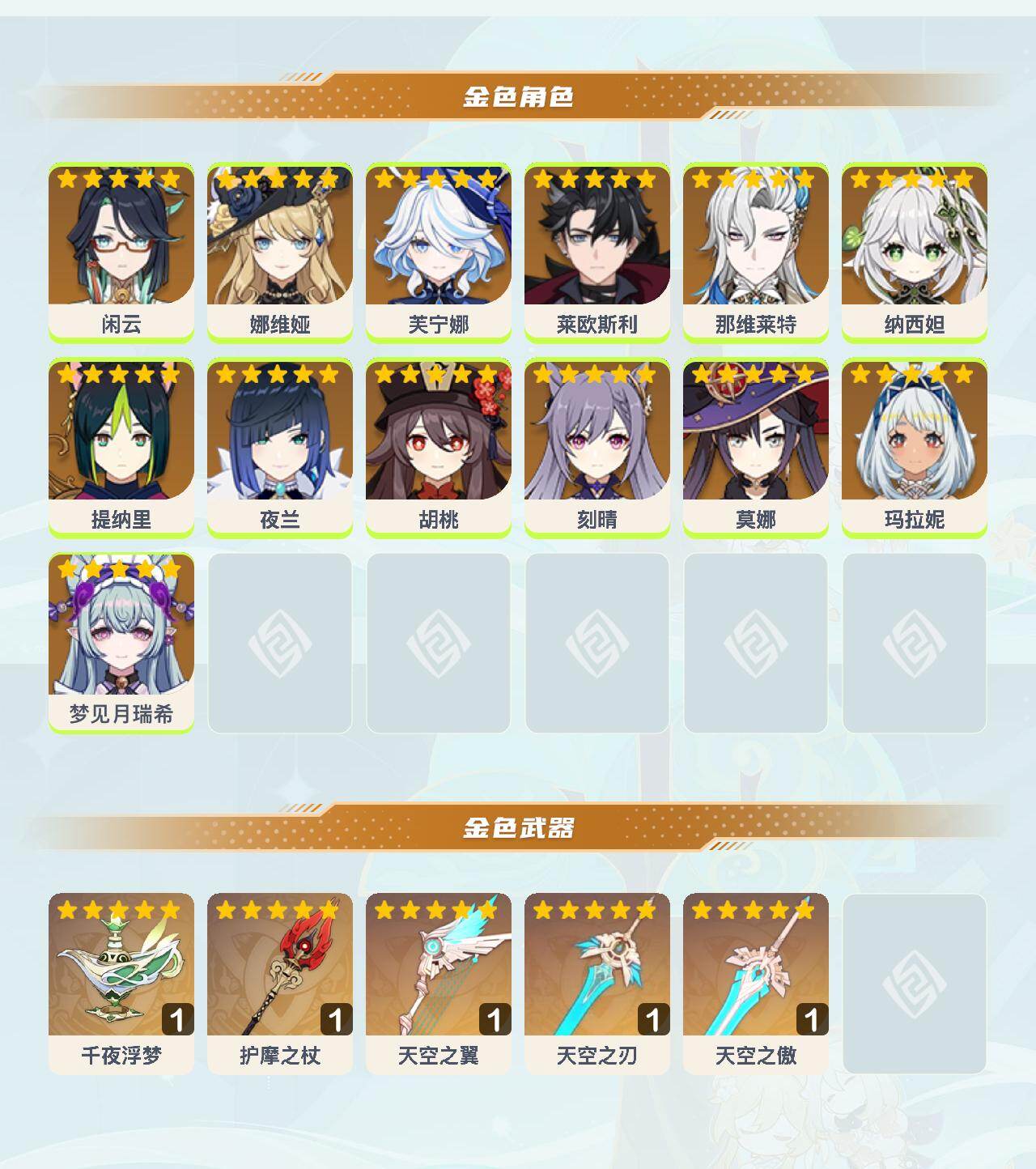 【ysyt652】55级/18黄/女主/13个五星角色/5个五星武器/0命胡桃/0命玛拉妮/0命莱欧斯利/0命那维莱特/0命芙宁娜/0命纳西妲/0命娜维娅/0命梦见月瑞希/0命夜兰/0命刻晴/0命莫娜/0命闲云/0命提纳里/精1护摩之杖/精1千夜浮梦/精1天空之翼/精1天空之刃/精1天空之傲