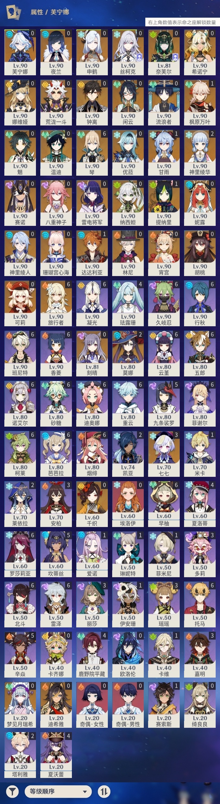 【原神】【lyys11002】冒险等级:60,五星数量:61,五星角色:琴 6命七七 3命莫娜 2命神里绫华 2命达达利亚 1命枫原万叶 1命甘雨 1命提纳里 1命珊瑚宫心海希诺宁温迪宵宫优菈迪希雅钟离荒泷一斗梦见月瑞希申鹤八重神子神里绫人林尼夜兰芙宁娜娜维娅闲云千织赛诺丝柯克妮露纳西妲奈芙尔流浪者魈胡桃可莉刻晴雷电将军__五星武器:天空之翼 3精尘世之锁 2精飞雷之弦振 2精天空之脊 2精天空之卷 2精天空之刃 2精雾切之回光 2精若水 2精裁断图莱杜拉的回忆阿莫斯之弓风鹰剑护摩之杖狼的末路磐岩结绿四风原典薙草之稻光终末嗟叹之诗息灾贯虹之槊圣显之钥__四星角色:班尼特 6命行秋 6命香菱 6命久岐忍 6命凝光 6命迪奥娜 6命砂糖 6命柯莱 6命芭芭拉 6命云堇 6命早柚 6命托马 6命五郎 6命烟绯 6命重云 6命诺艾尔 6命罗莎莉亚 6命雷泽 6命菲谢尔 6命北斗 6命九条裟罗 5命坎蒂丝 5命辛焱 5命鹿野院平藏 4命珐露珊 4命夏洛蒂 4命夏沃蕾 4命瑶瑶 3命多莉 3命嘉明 3命莱依拉 2命塔利雅 2命米卡 1命卡维 1命菲米尼 1命琳妮特 1命伊安珊 1命爱诺 1命赛索斯 1命埃洛伊奇偶·女性奇偶·男性卡齐娜绮良良欧洛伦