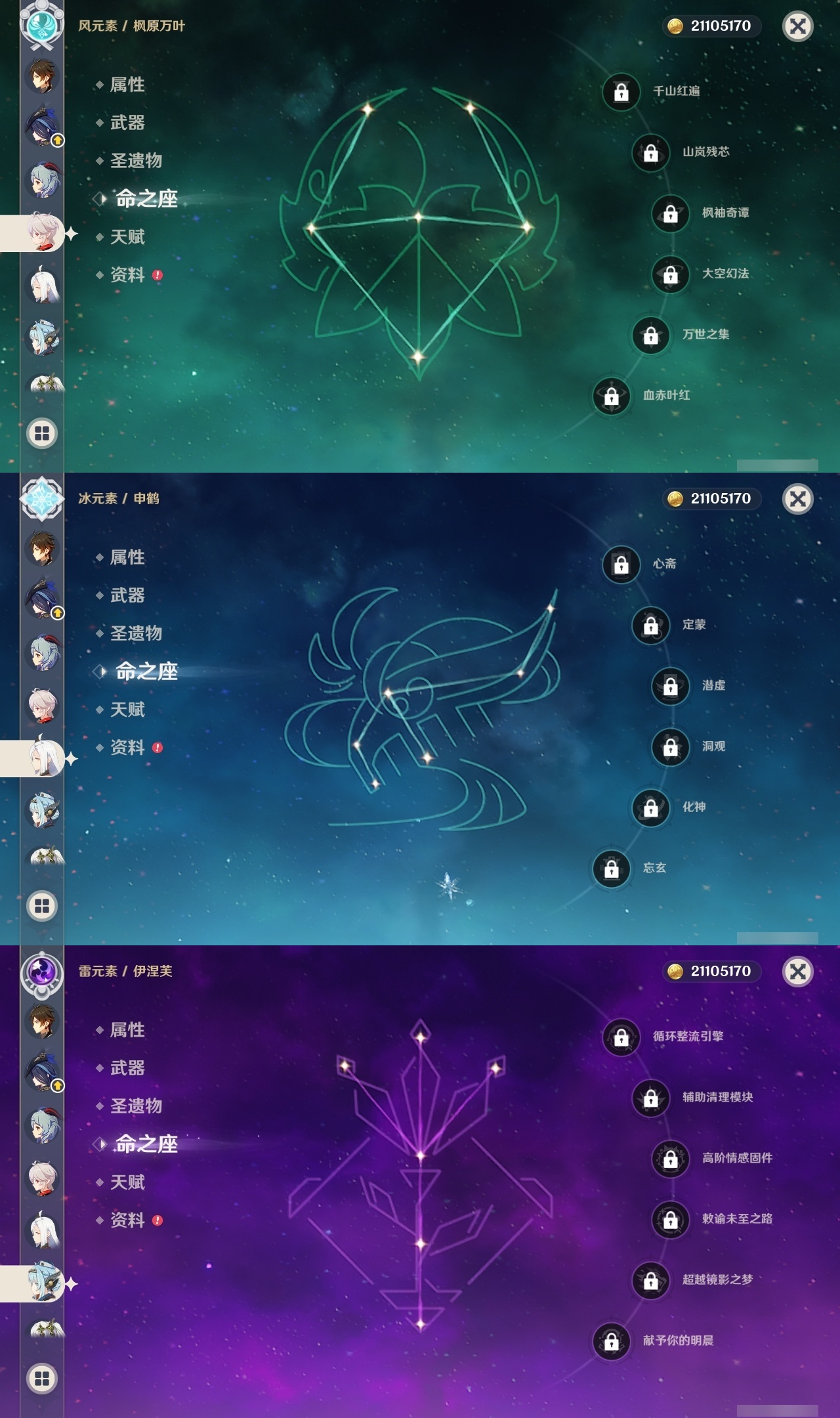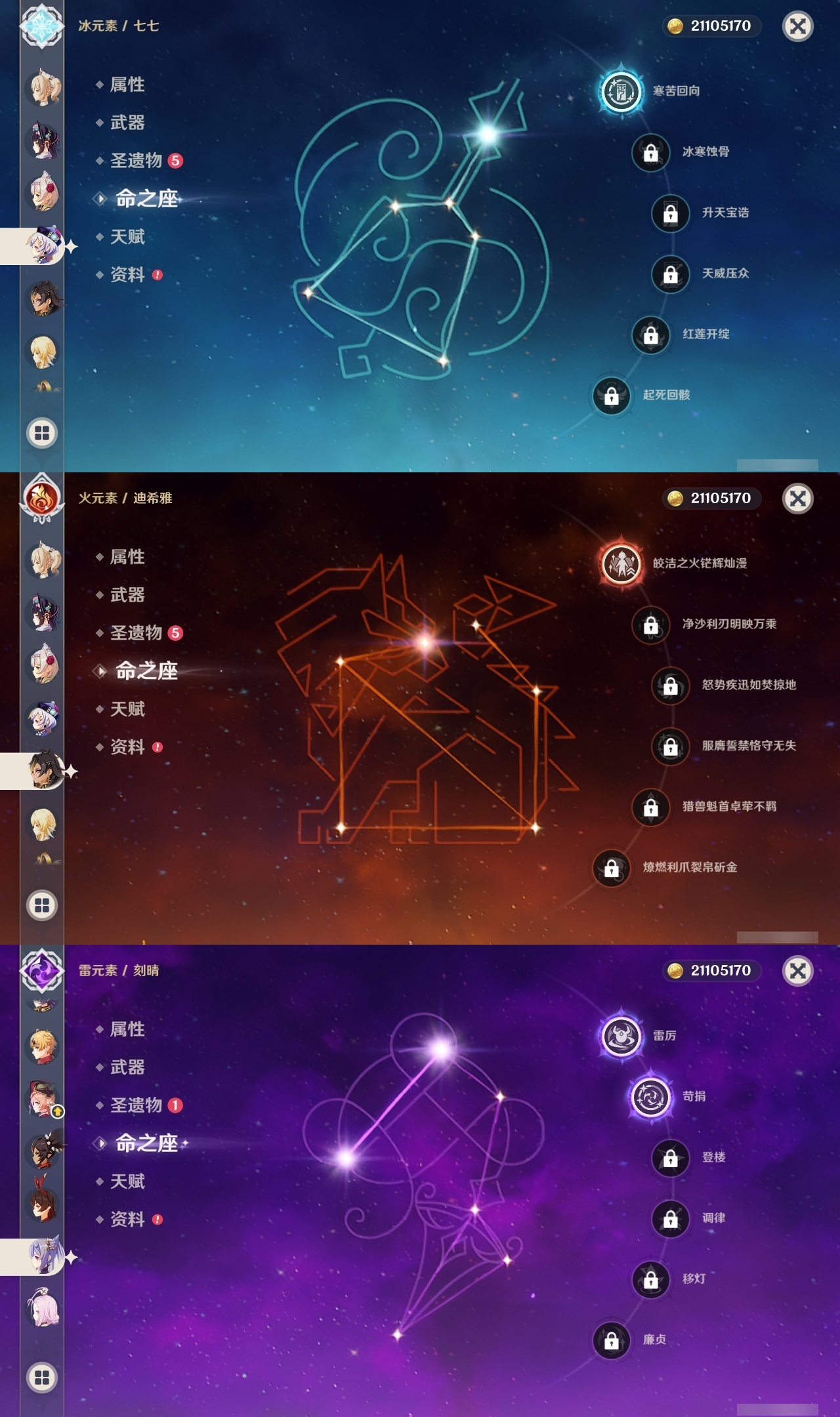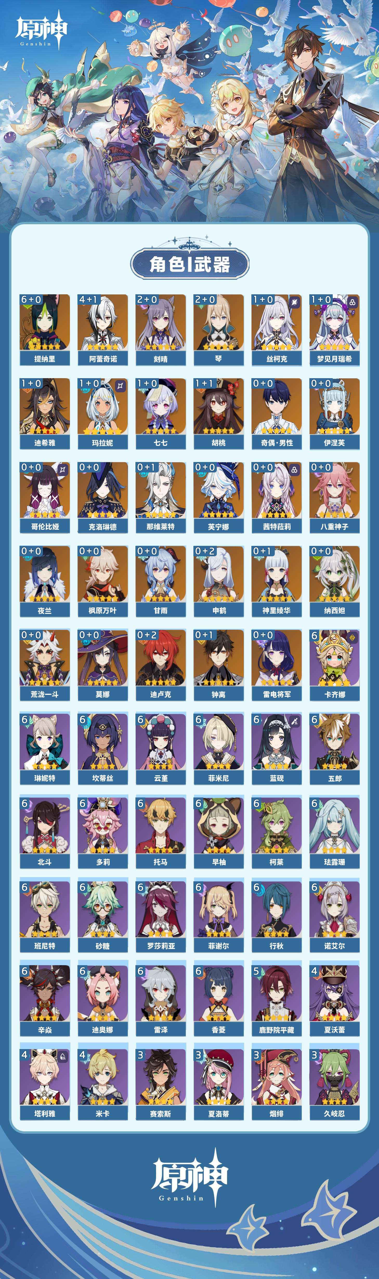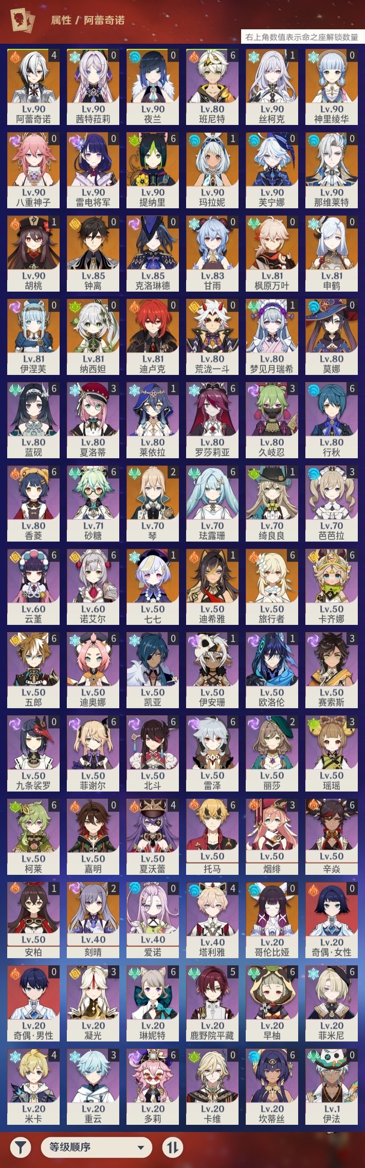 【原神】【lyys10998】冒险等级:60,五星数量:41,五星角色:提纳里 6命阿蕾奇诺 4命刻晴 2命琴 2命玛拉妮 1命迪希雅 1命梦见月瑞希 1命丝柯克 1命胡桃 1命七七 1命莫娜神里绫华茜特菈莉钟离荒泷一斗申鹤八重神子那维莱特夜兰芙宁娜伊涅芙纳西妲迪卢克哥伦比娅枫原万叶甘雨克洛琳德雷电将军__五星武器:狼的末路 2精四风原典 2精息灾 2精万世流涌大典赤月之形和璞鸢护摩之杖天空之刃雾切之回光冬极白星贯虹之槊__四星角色:卡齐娜 6命班尼特 6命行秋 6命香菱 6命珐露珊 6命迪奥娜 6命砂糖 6命坎蒂丝 6命多莉 6命柯莱 6命云堇 6命蓝砚 6命早柚 6命托马 6命五郎 6命辛焱 6命诺艾尔 6命罗莎莉亚 6命雷泽 6命菲谢尔 6命北斗 6命菲米尼 6命琳妮特 6命鹿野院平藏 5命米卡 4命夏沃蕾 4命塔利雅 4命久岐忍 3命凝光 3命瑶瑶 3命芭芭拉 3命烟绯 3命重云 3命夏洛蒂 3命赛索斯 3命绮良良 1命莱依拉 1命欧洛伦 1命伊安珊 1命奇偶·女性奇偶·男性九条裟罗卡维嘉明伊法爱诺