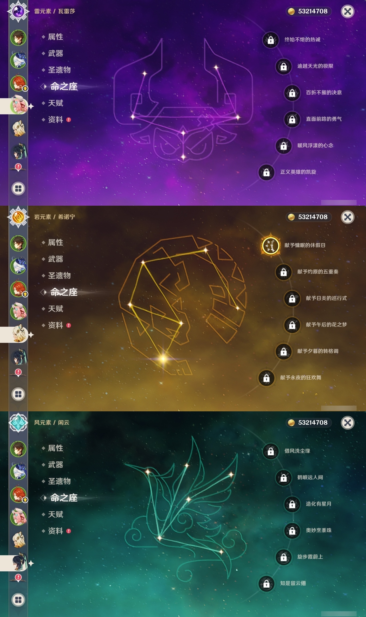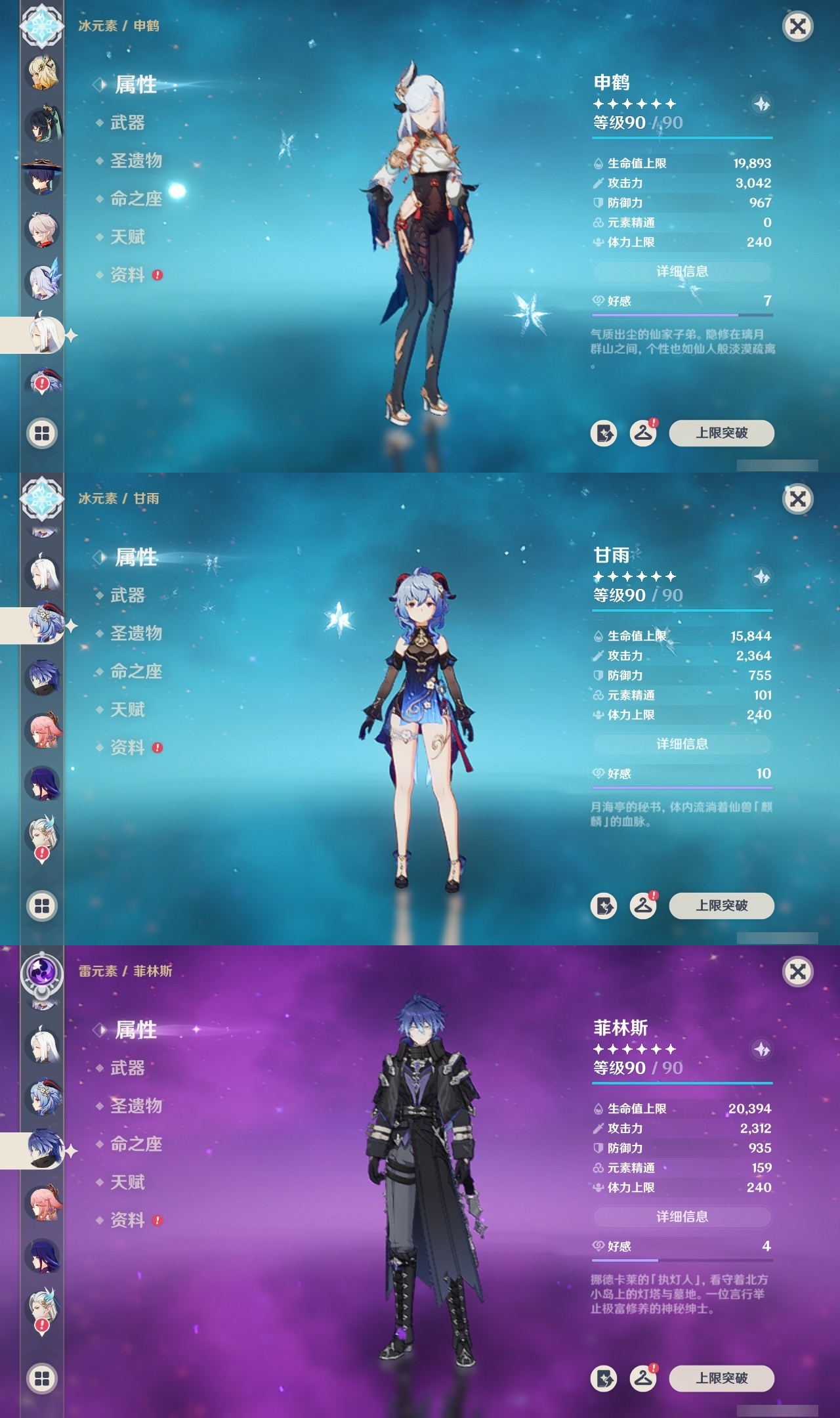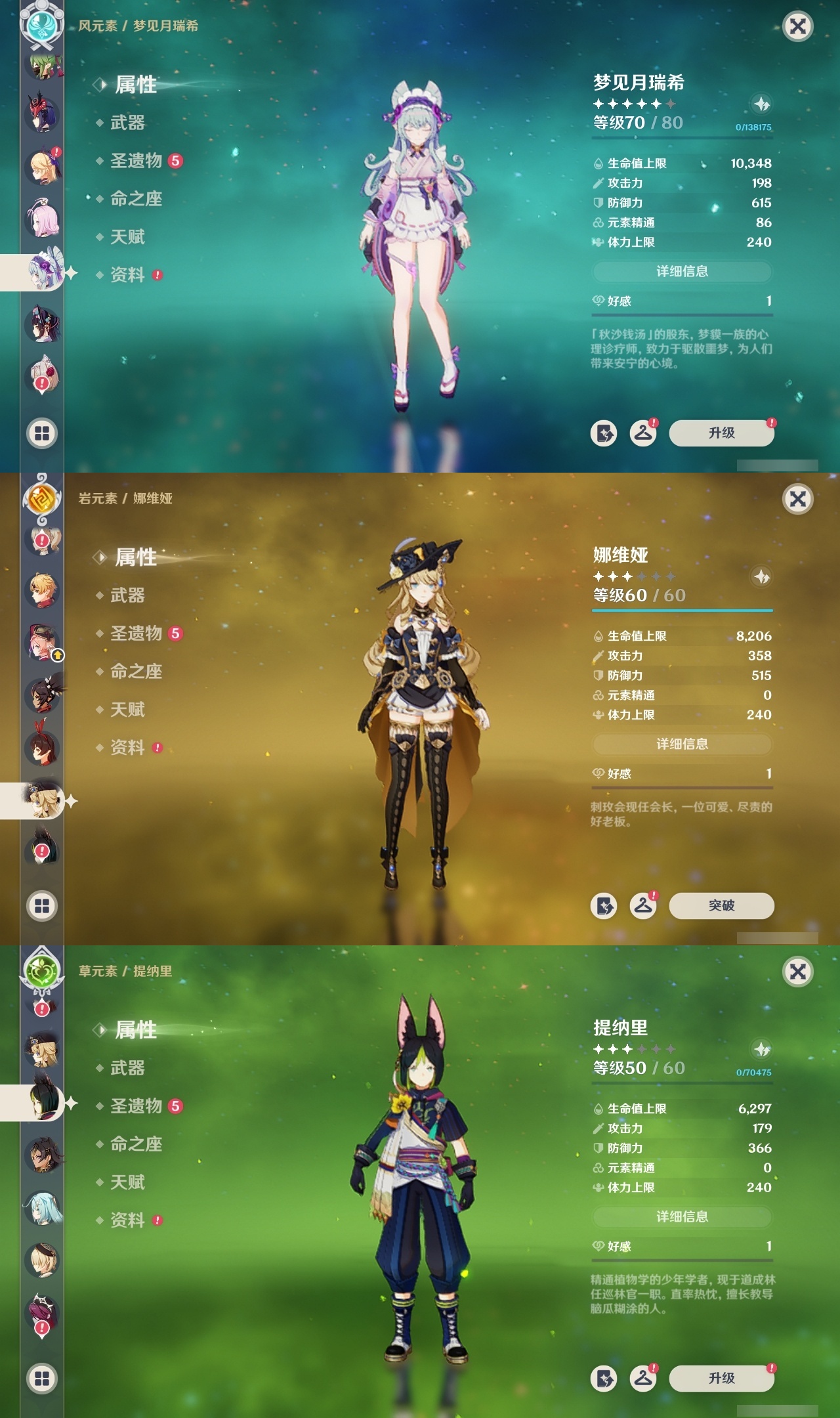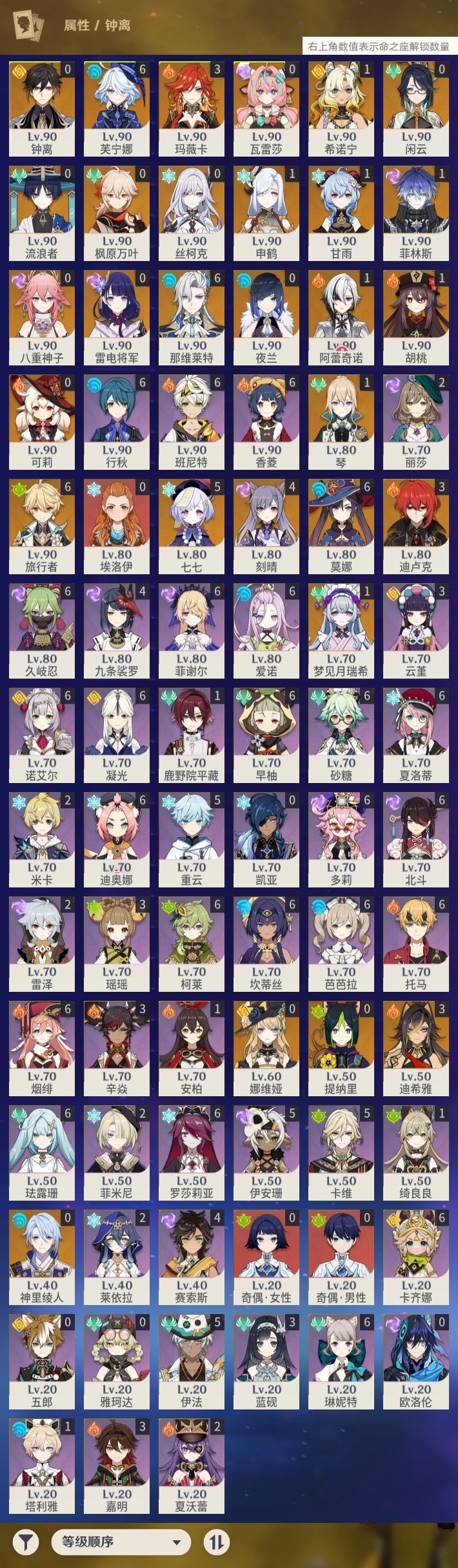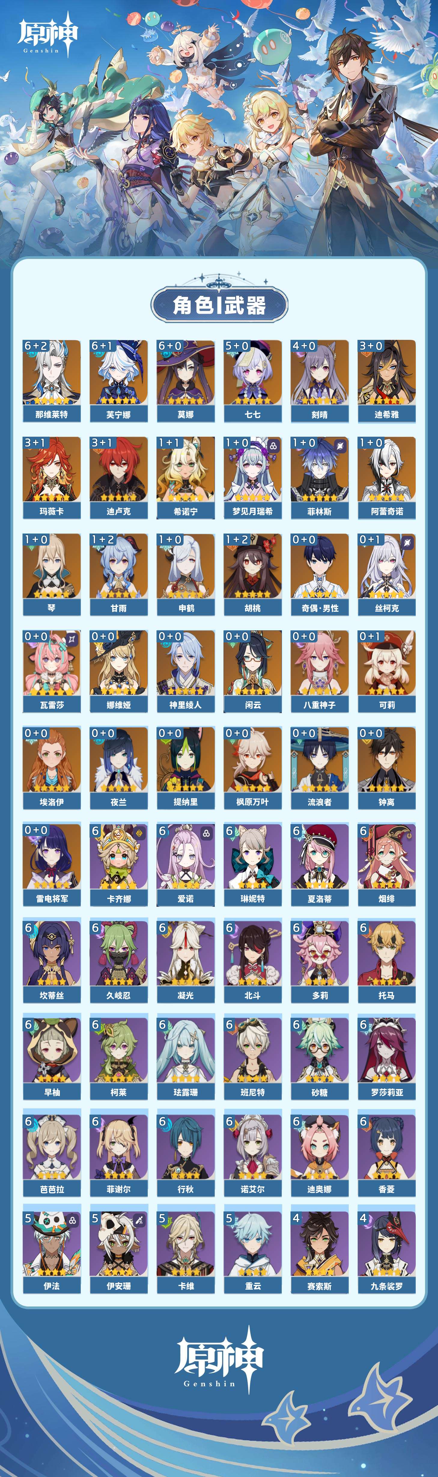 【原神】满命,冒险等级:60,五星数量:46,五星角色:那维莱特 6命芙宁娜 6命莫娜 6命七七 5命刻晴 4命玛薇卡 3命迪希雅 3命迪卢克 3命希诺宁 1命梦见月瑞希 1命阿蕾奇诺 1命菲林斯 1命甘雨 1命胡桃 1命琴 1命申鹤 1命钟离瓦雷莎八重神子神里绫人夜兰娜维娅提纳里闲云丝柯克流浪者枫原万叶可莉雷电将军__五星武器:万世流涌大典 2精阿莫斯之弓 2精风鹰剑 2精护摩之杖 2精岩峰巡歌祭星者之望焚曜千阳静水流涌之辉苍耀狼的末路四风原典天空之刃天空之翼终末嗟叹之诗__四星角色:卡齐娜 6命班尼特 6命行秋 6命香菱 6命久岐忍 6命珐露珊 6命凝光 6命迪奥娜 6命砂糖 6命坎蒂丝 6命多莉 6命柯莱 6命芭芭拉 6命早柚 6命托马 6命烟绯 6命诺艾尔 6命罗莎莉亚 6命菲谢尔 6命北斗 6命琳妮特 6命夏洛蒂 6命爱诺 6命卡维 5命重云 5命伊法 5命伊安珊 5命九条裟罗 4命赛索斯 4命瑶瑶 3命云堇 3命蓝砚 3命辛焱 3命嘉明 3命莱依拉 2命米卡 2命雷泽 2命菲米尼 2命夏沃蕾 2命鹿野院平藏 1命绮良良 1命塔利雅 1命埃洛伊奇偶·女性奇偶·男性欧洛伦五郎