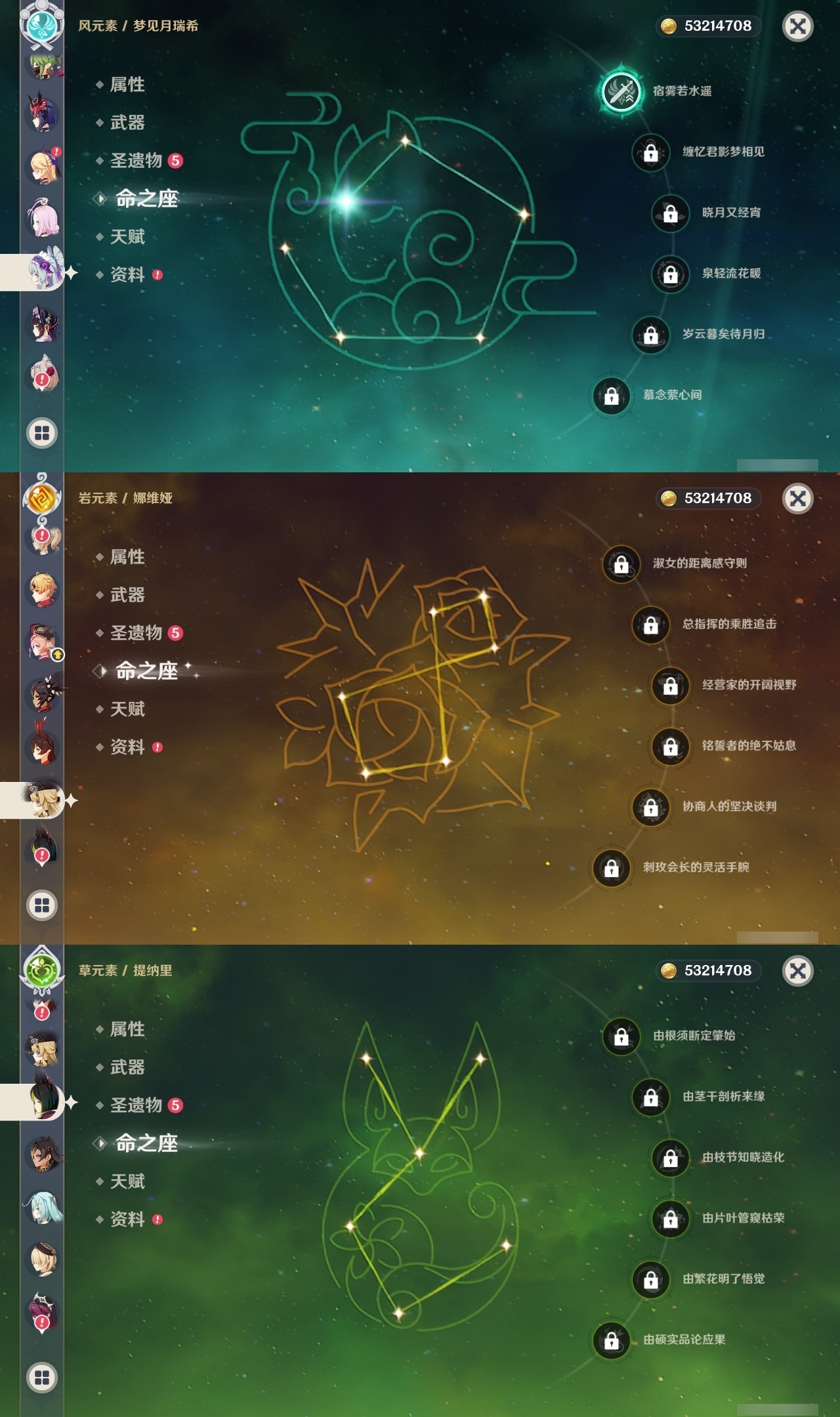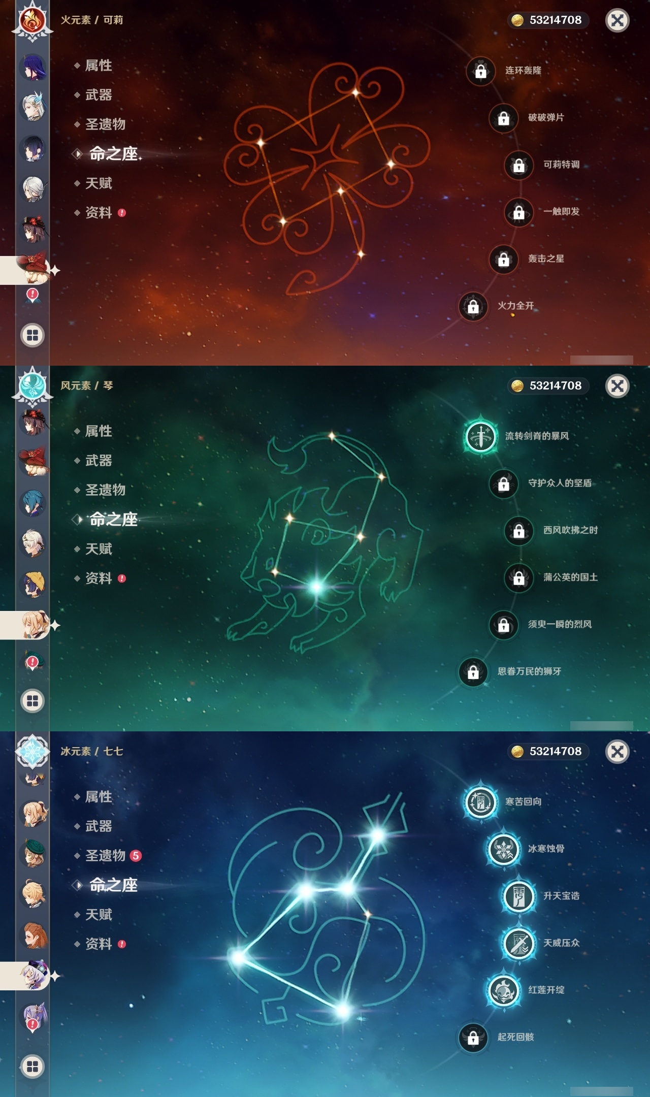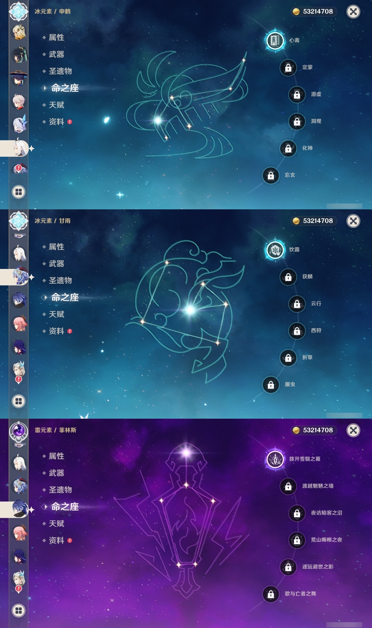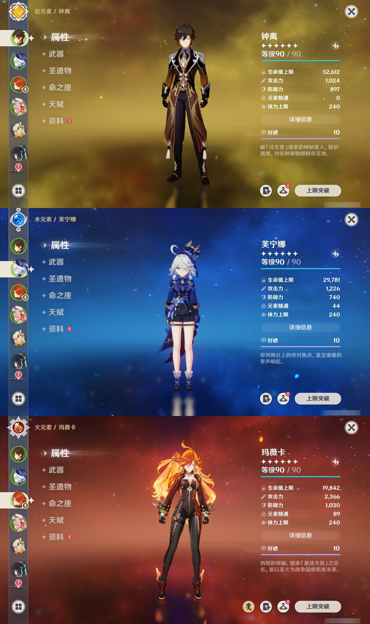 【原神】满命,冒险等级:60,五星数量:46,五星角色:那维莱特 6命芙宁娜 6命莫娜 6命七七 5命刻晴 4命玛薇卡 3命迪希雅 3命迪卢克 3命希诺宁 1命梦见月瑞希 1命阿蕾奇诺 1命菲林斯 1命甘雨 1命胡桃 1命琴 1命申鹤 1命钟离瓦雷莎八重神子神里绫人夜兰娜维娅提纳里闲云丝柯克流浪者枫原万叶可莉雷电将军__五星武器:万世流涌大典 2精阿莫斯之弓 2精风鹰剑 2精护摩之杖 2精岩峰巡歌祭星者之望焚曜千阳静水流涌之辉苍耀狼的末路四风原典天空之刃天空之翼终末嗟叹之诗__四星角色:卡齐娜 6命班尼特 6命行秋 6命香菱 6命久岐忍 6命珐露珊 6命凝光 6命迪奥娜 6命砂糖 6命坎蒂丝 6命多莉 6命柯莱 6命芭芭拉 6命早柚 6命托马 6命烟绯 6命诺艾尔 6命罗莎莉亚 6命菲谢尔 6命北斗 6命琳妮特 6命夏洛蒂 6命爱诺 6命卡维 5命重云 5命伊法 5命伊安珊 5命九条裟罗 4命赛索斯 4命瑶瑶 3命云堇 3命蓝砚 3命辛焱 3命嘉明 3命莱依拉 2命米卡 2命雷泽 2命菲米尼 2命夏沃蕾 2命鹿野院平藏 1命绮良良 1命塔利雅 1命埃洛伊奇偶·女性奇偶·男性欧洛伦五郎