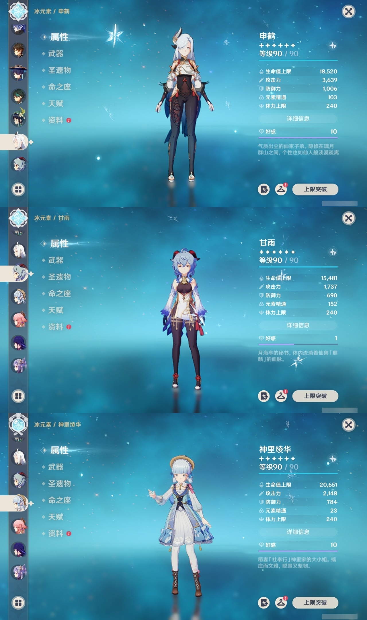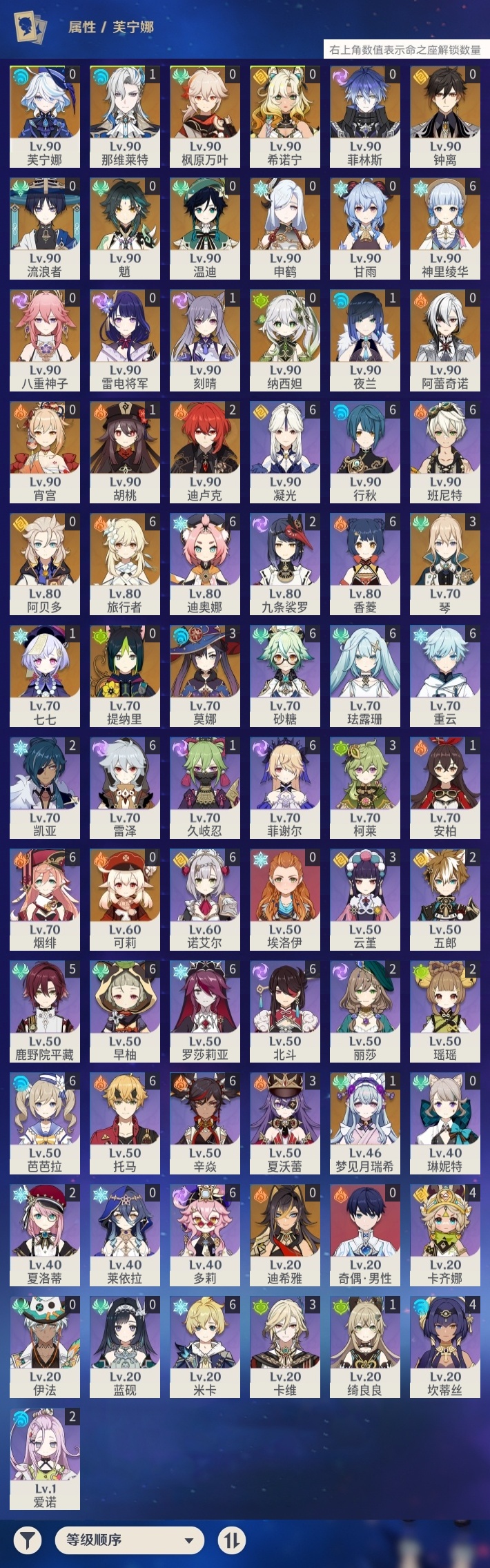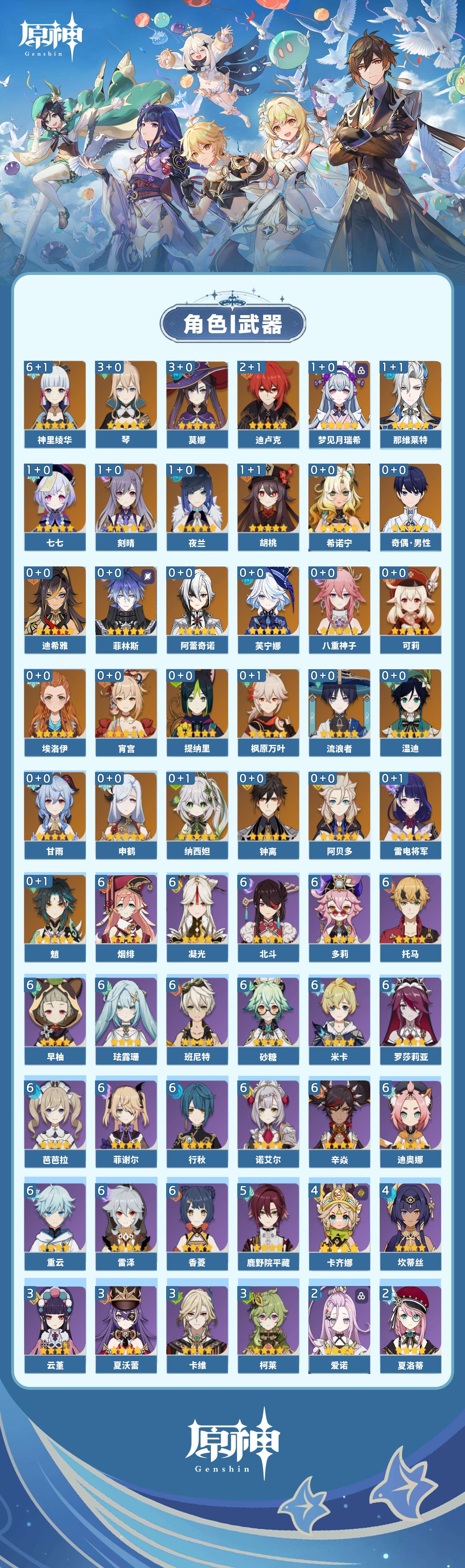 【原神】【lyys10996】冒险等级:60,五星数量:47,五星角色:神里绫华 6命莫娜 3命琴 3命迪卢克 2命梦见月瑞希 1命那维莱特 1命胡桃 1命刻晴 1命七七 1命夜兰 1命希诺宁温迪宵宫迪希雅钟离申鹤八重神子阿贝多芙宁娜提纳里阿蕾奇诺纳西妲菲林斯流浪者枫原万叶甘雨魈可莉雷电将军__五星武器:最初的大魔术万世流涌大典苍古自由之誓风鹰剑和璞鸢护摩之杖狼的末路磐岩结绿天空之傲天空之脊天空之卷天空之翼雾切之回光薙草之稻光赤角石溃杵千夜浮梦__四星角色:班尼特 6命行秋 6命香菱 6命珐露珊 6命凝光 6命迪奥娜 6命砂糖 6命米卡 6命多莉 6命芭芭拉 6命早柚 6命托马 6命烟绯 6命重云 6命辛焱 6命诺艾尔 6命罗莎莉亚 6命雷泽 6命菲谢尔 6命北斗 6命鹿野院平藏 5命卡齐娜 4命坎蒂丝 4命柯莱 3命卡维 3命云堇 3命夏沃蕾 3命九条裟罗 2命瑶瑶 2命五郎 2命夏洛蒂 2命爱诺 2命久岐忍 1命绮良良 1命埃洛伊奇偶·男性莱依拉蓝砚琳妮特伊法