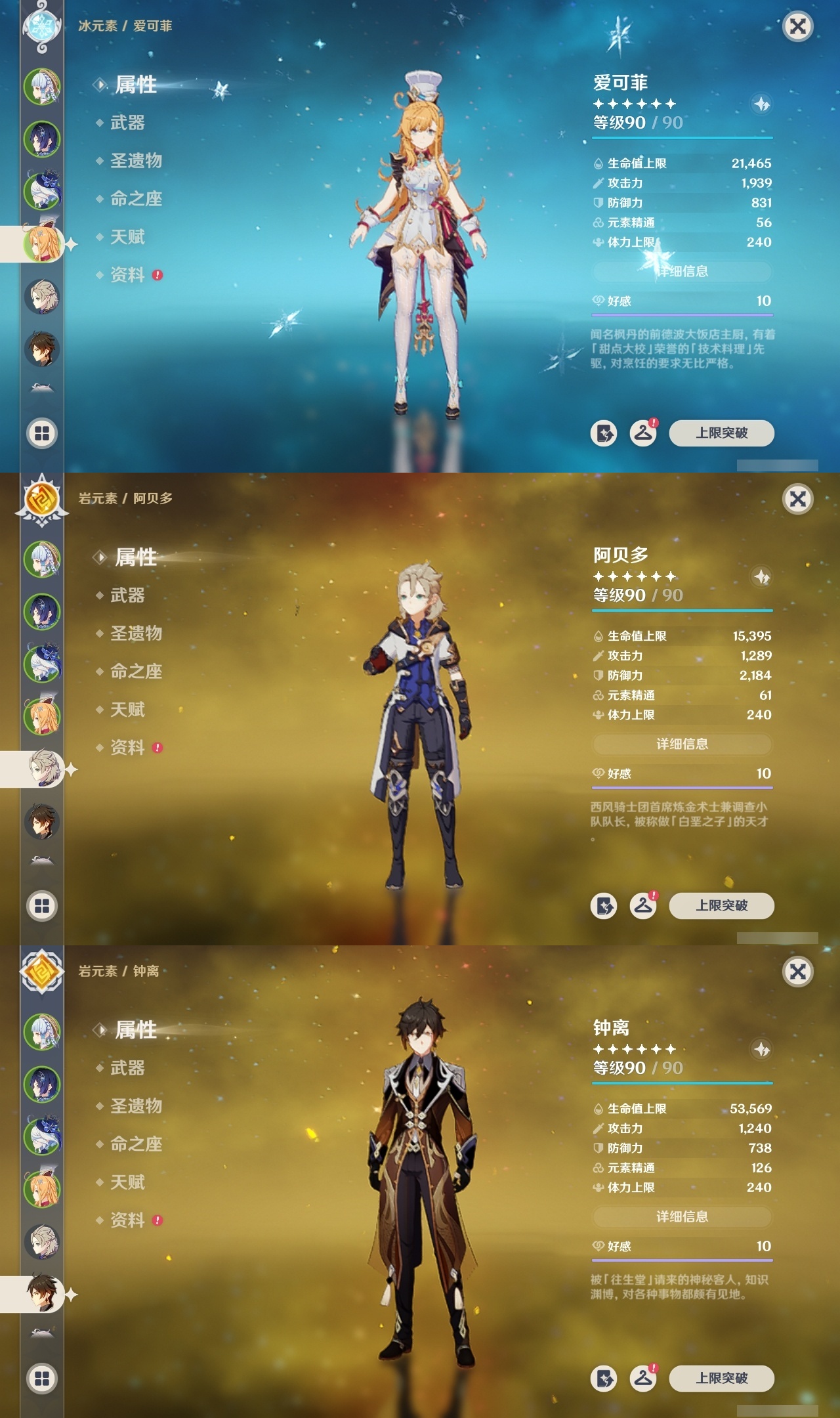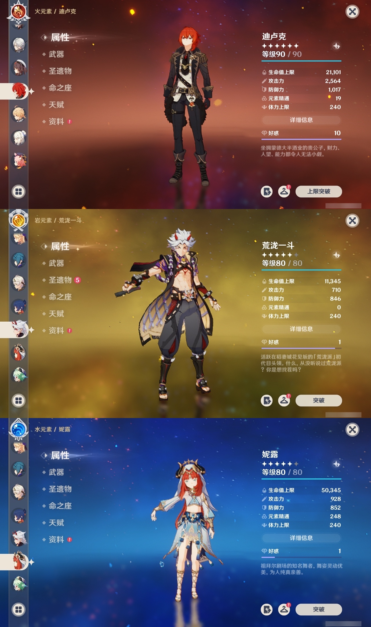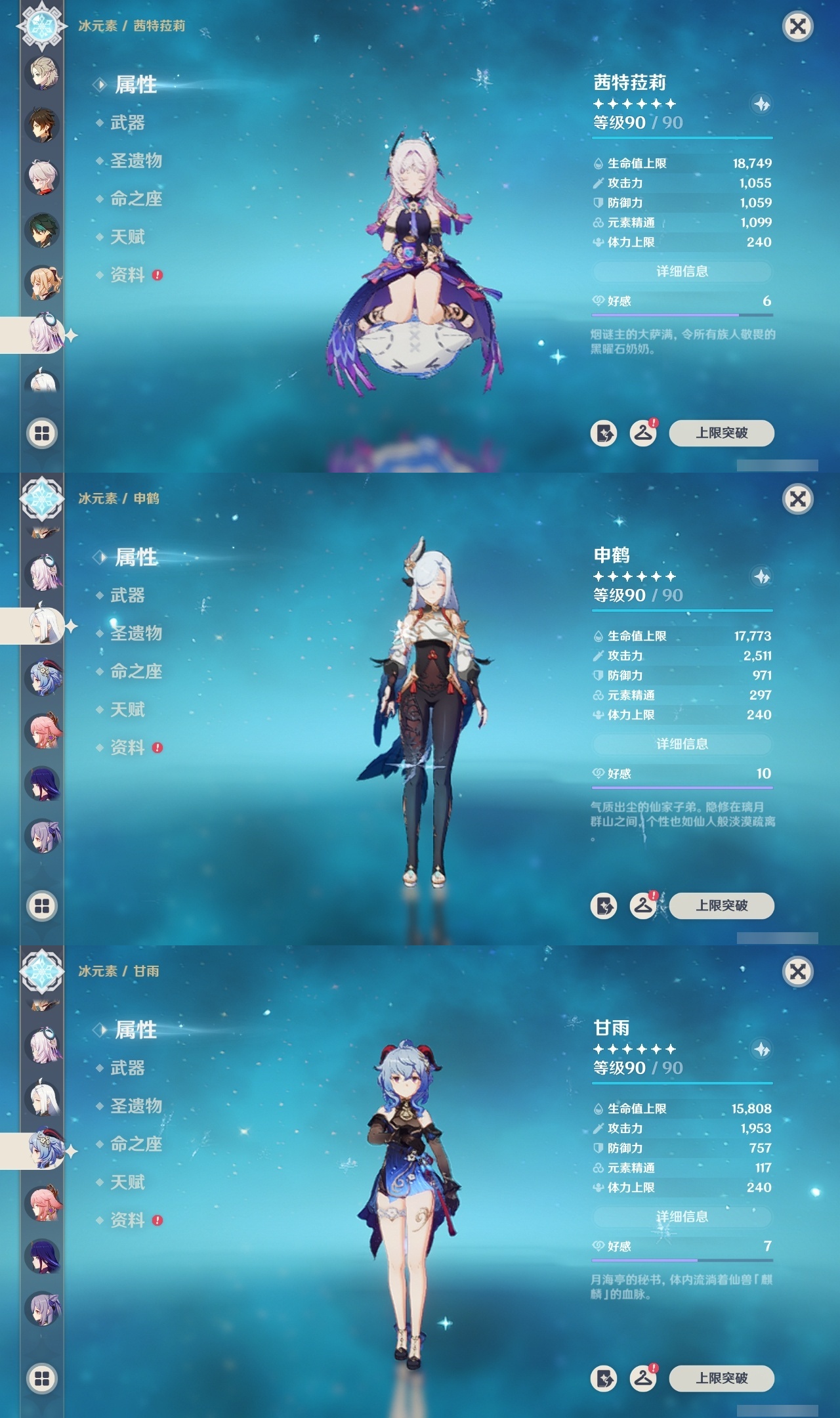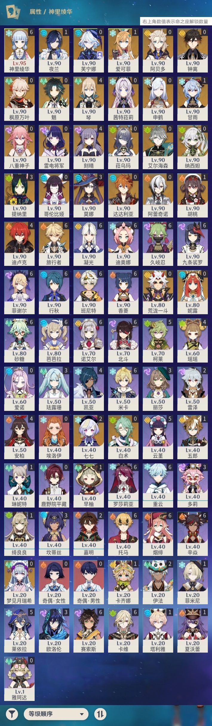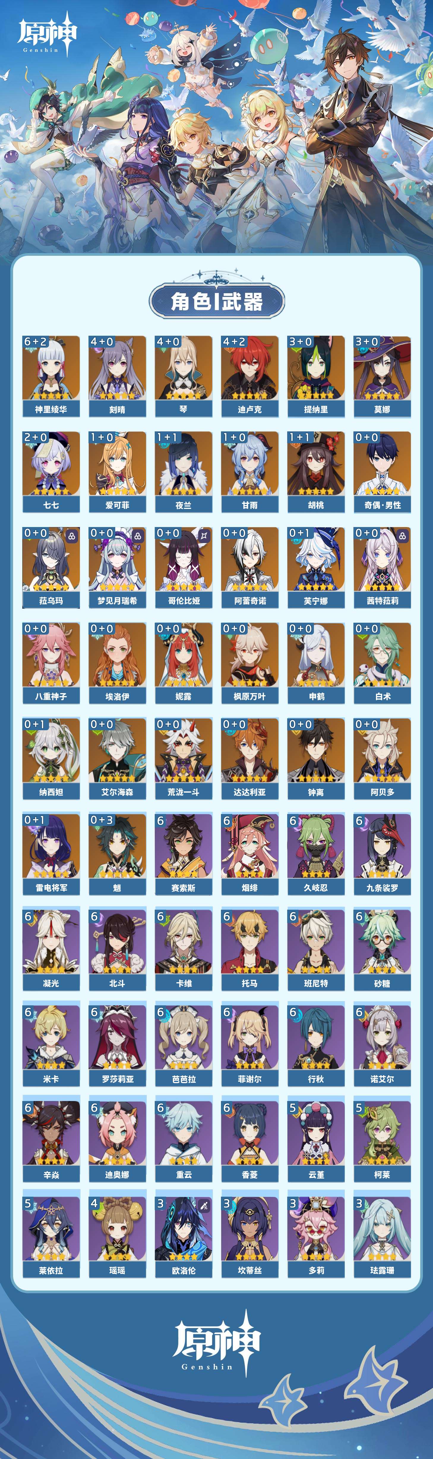 【原神】【lyys10988】冒险等级:60,五星数量:46,五星角色:神里绫华 6命迪卢克 4命刻晴 4命琴 4命莫娜 3命提纳里 3命七七 2命爱可菲 1命甘雨 1命胡桃 1命夜兰 1命白术茜特菈莉钟离荒泷一斗达达利亚梦见月瑞希申鹤八重神子阿贝多芙宁娜阿蕾奇诺妮露纳西妲菈乌玛艾尔海森哥伦比娅枫原万叶魈雷电将军__五星武器:和璞鸢 3精狼的末路 2精雾切之回光 2精静水流涌之辉真语秘匣护摩之杖四风原典天空之脊天空之卷天空之翼薙草之稻光若水千夜浮梦__四星角色:班尼特 6命行秋 6命九条裟罗 6命香菱 6命久岐忍 6命凝光 6命迪奥娜 6命砂糖 6命米卡 6命卡维 6命芭芭拉 6命托马 6命烟绯 6命重云 6命辛焱 6命诺艾尔 6命罗莎莉亚 6命菲谢尔 6命北斗 6命赛索斯 6命莱依拉 5命柯莱 5命云堇 5命瑶瑶 4命珐露珊 3命坎蒂丝 3命多莉 3命欧洛伦 3命雷泽 2命嘉明 2命伊法 2命卡齐娜 1命绮良良 1命早柚 1命五郎 1命菲米尼 1命琳妮特 1命夏沃蕾 1命塔利雅 1命埃洛伊奇偶·女性奇偶·男性鹿野院平藏爱诺