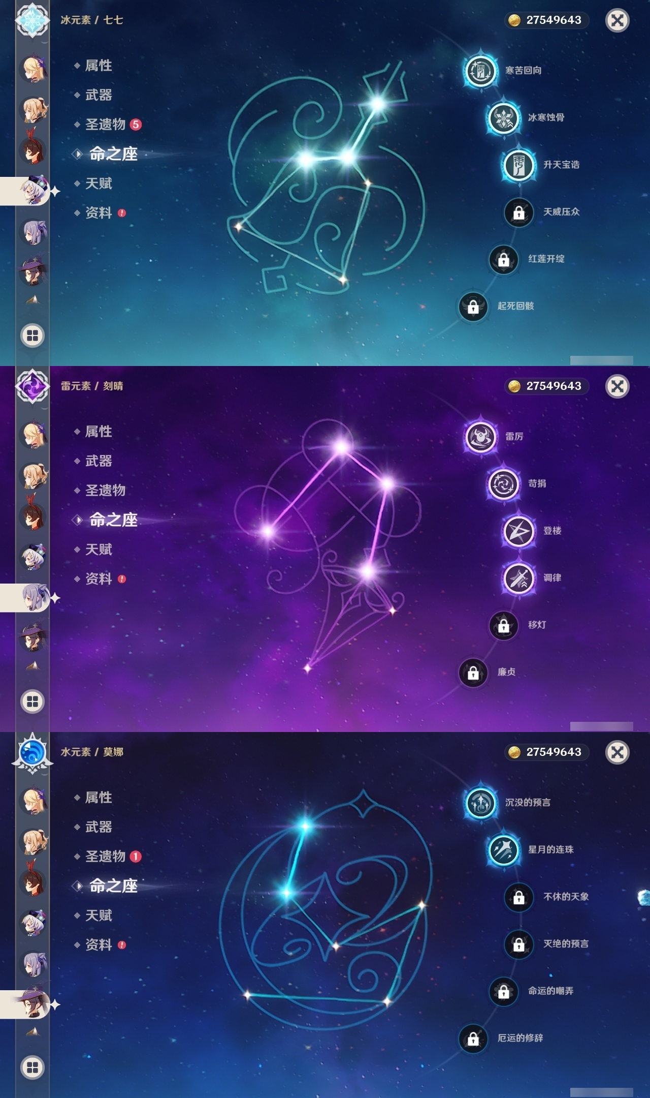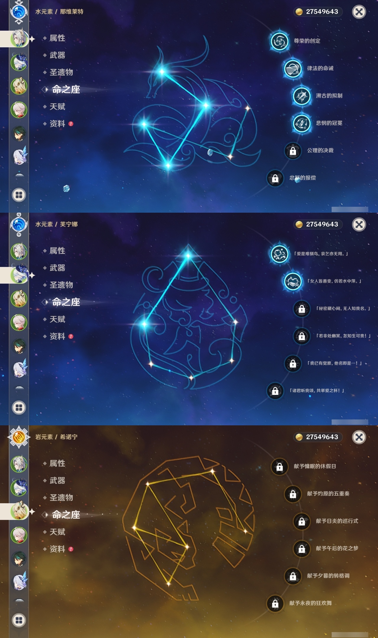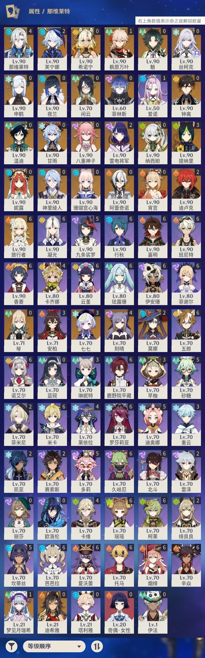 【原神】【lyys10981】冒险等级:60,五星数量:52,五星角色:那维莱特 4命刻晴 4命七七 3命提纳里 3命芙宁娜 2命迪卢克 2命雷电将军 2命莫娜 2命梦见月瑞希 1命枫原万叶 1命琴珊瑚宫心海希诺宁温迪宵宫迪希雅钟离申鹤八重神子神里绫人夜兰闲云阿蕾奇诺丝柯克妮露纳西妲菲林斯甘雨魈__五星武器:天空之卷 3精碧落之珑 2精和璞鸢 2精岩峰巡歌星鹫赤羽最初的大魔术万世流涌大典静水流涌之辉裁断赤月之形阿莫斯之弓苍古自由之誓风鹰剑四风原典天空之脊天空之刃天空之翼终末嗟叹之诗息灾猎人之径圣显之钥千夜浮梦__四星角色:班尼特 6命行秋 6命香菱 6命久岐忍 6命鹿野院平藏 6命珐露珊 6命凝光 6命瑶瑶 6命米卡 6命柯莱 6命芭芭拉 6命云堇 6命托马 6命五郎 6命烟绯 6命辛焱 6命诺艾尔 6命罗莎莉亚 6命菲谢尔 6命北斗 6命夏沃蕾 6命嘉明 6命伊安珊 6命九条裟罗 5命迪奥娜 5命砂糖 5命坎蒂丝 5命多莉 5命卡齐娜 4命莱依拉 4命卡维 4命早柚 3命重云 3命琳妮特 3命绮良良 2命雷泽 2命菲米尼 2命赛索斯 2命爱诺 1命奇偶·女性欧洛伦蓝砚伊法塔利雅