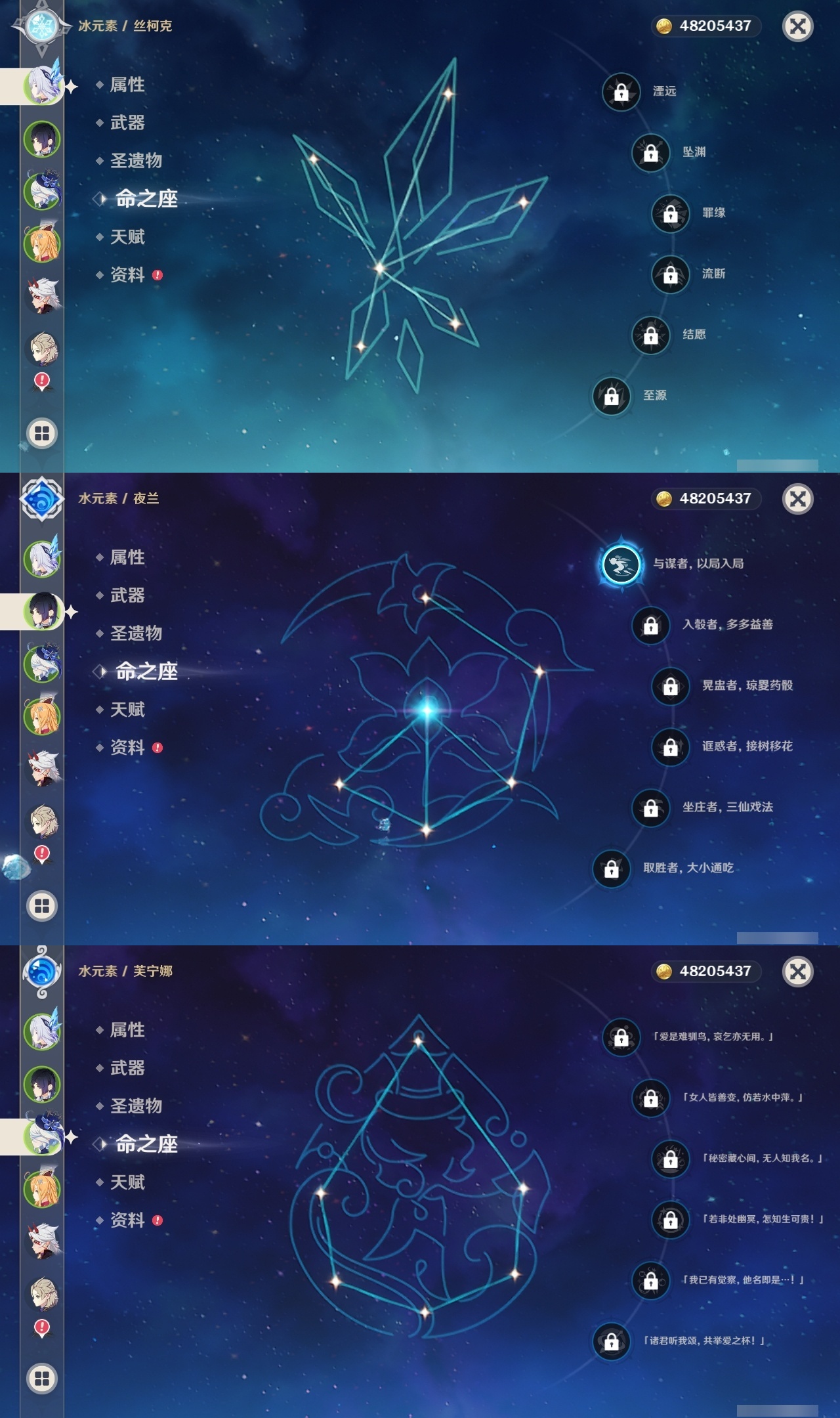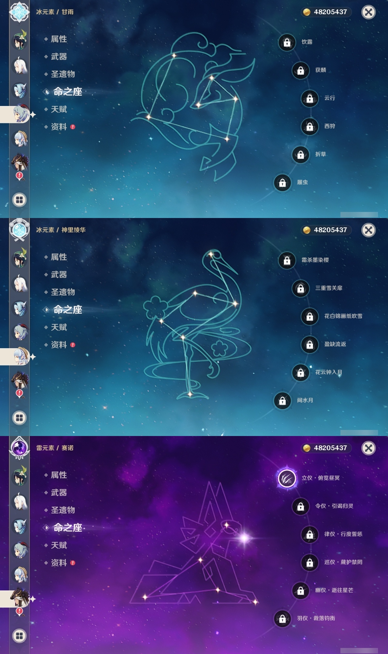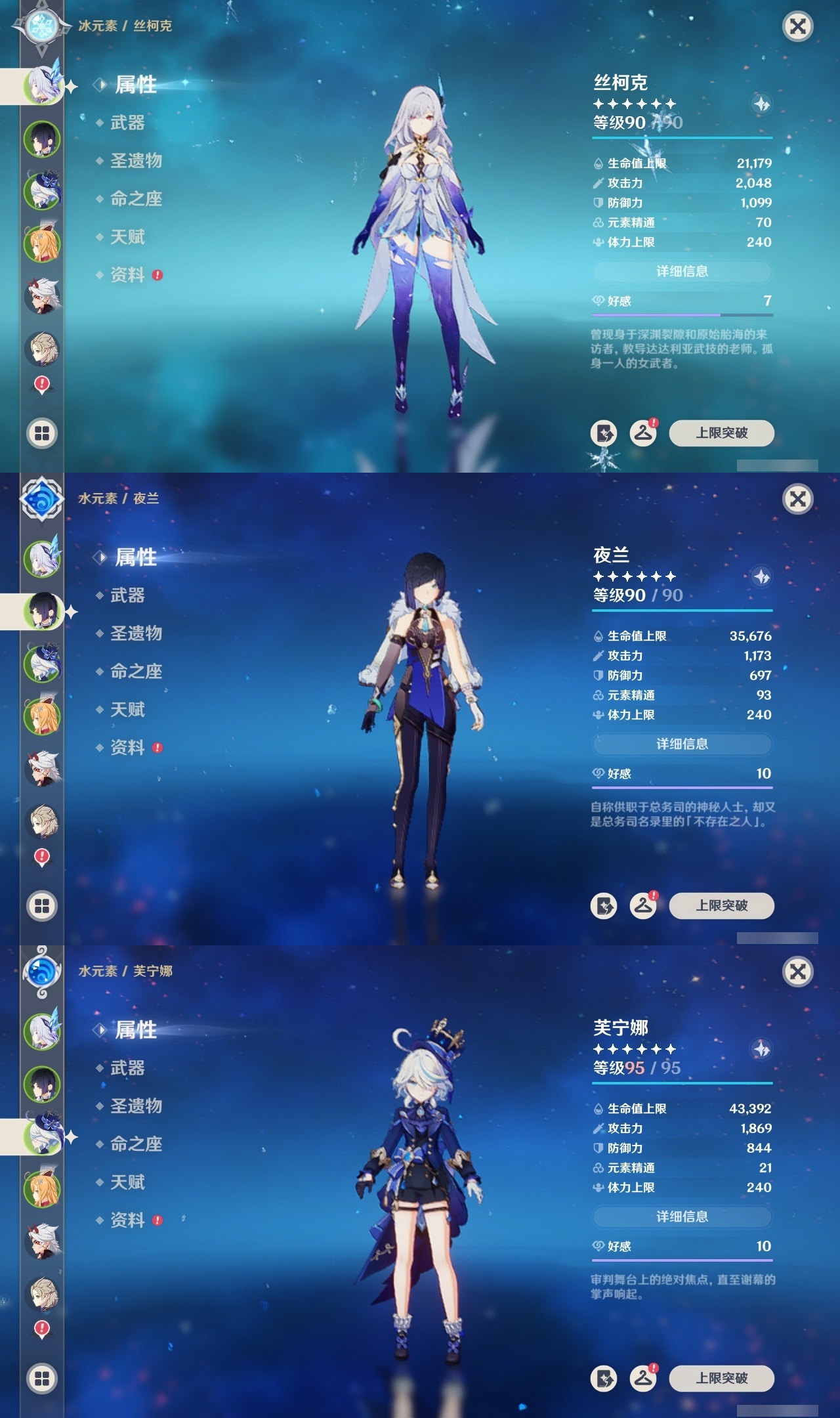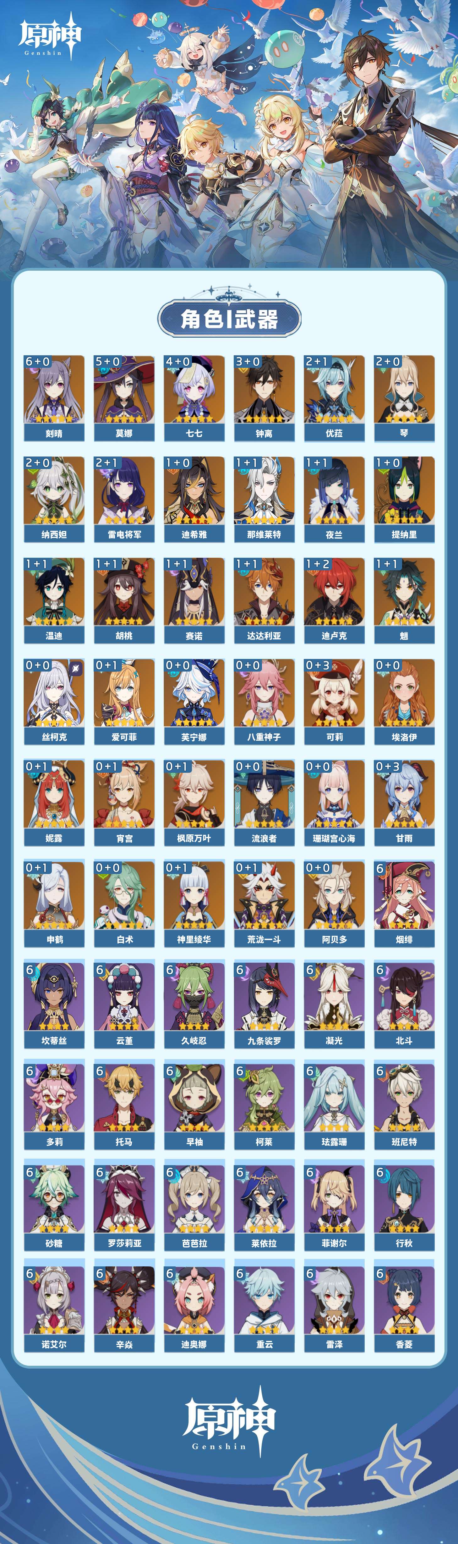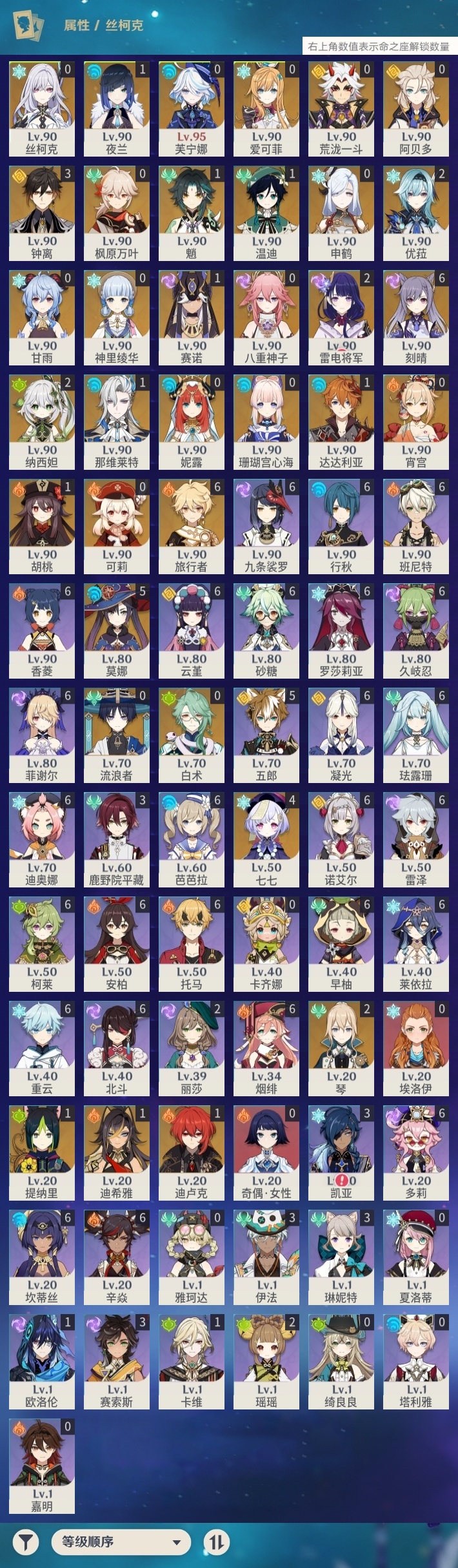 【原神】【lyys10975】冒险等级:60,五星数量:63,五星角色:刻晴 6命莫娜 5命七七 4命钟离 3命雷电将军 2命琴 2命优菈 2命纳西妲 2命迪希雅 1命那维莱特 1命达达利亚 1命迪卢克 1命魈 1命胡桃 1命温迪 1命夜兰 1命提纳里 1命赛诺 1命珊瑚宫心海白术神里绫华宵宫荒泷一斗申鹤八重神子阿贝多芙宁娜爱可菲丝柯克妮露流浪者枫原万叶甘雨可莉__五星武器:天空之刃 5精天空之脊 4精阿莫斯之弓 3精四风原典 3精狼的末路 2精天空之卷 2精天空之翼 2精万世流涌大典香韵奏者苍古自由之誓飞雷之弦振风鹰剑和璞鸢护摩之杖磐岩结绿松籁响起之时天空之傲无工之剑雾切之回光薙草之稻光终末嗟叹之诗赤角石溃杵冬极白星息灾若水赤沙之杖圣显之钥__四星角色:班尼特 6命行秋 6命九条裟罗 6命香菱 6命久岐忍 6命珐露珊 6命凝光 6命迪奥娜 6命砂糖 6命莱依拉 6命坎蒂丝 6命多莉 6命柯莱 6命芭芭拉 6命云堇 6命早柚 6命托马 6命烟绯 6命重云 6命辛焱 6命诺艾尔 6命罗莎莉亚 6命雷泽 6命菲谢尔 6命北斗 6命五郎 5命鹿野院平藏 3命琳妮特 3命伊法 3命赛索斯 3命瑶瑶 2命卡维 1命欧洛伦 1命埃洛伊奇偶·女性卡齐娜绮良良夏洛蒂嘉明塔利雅