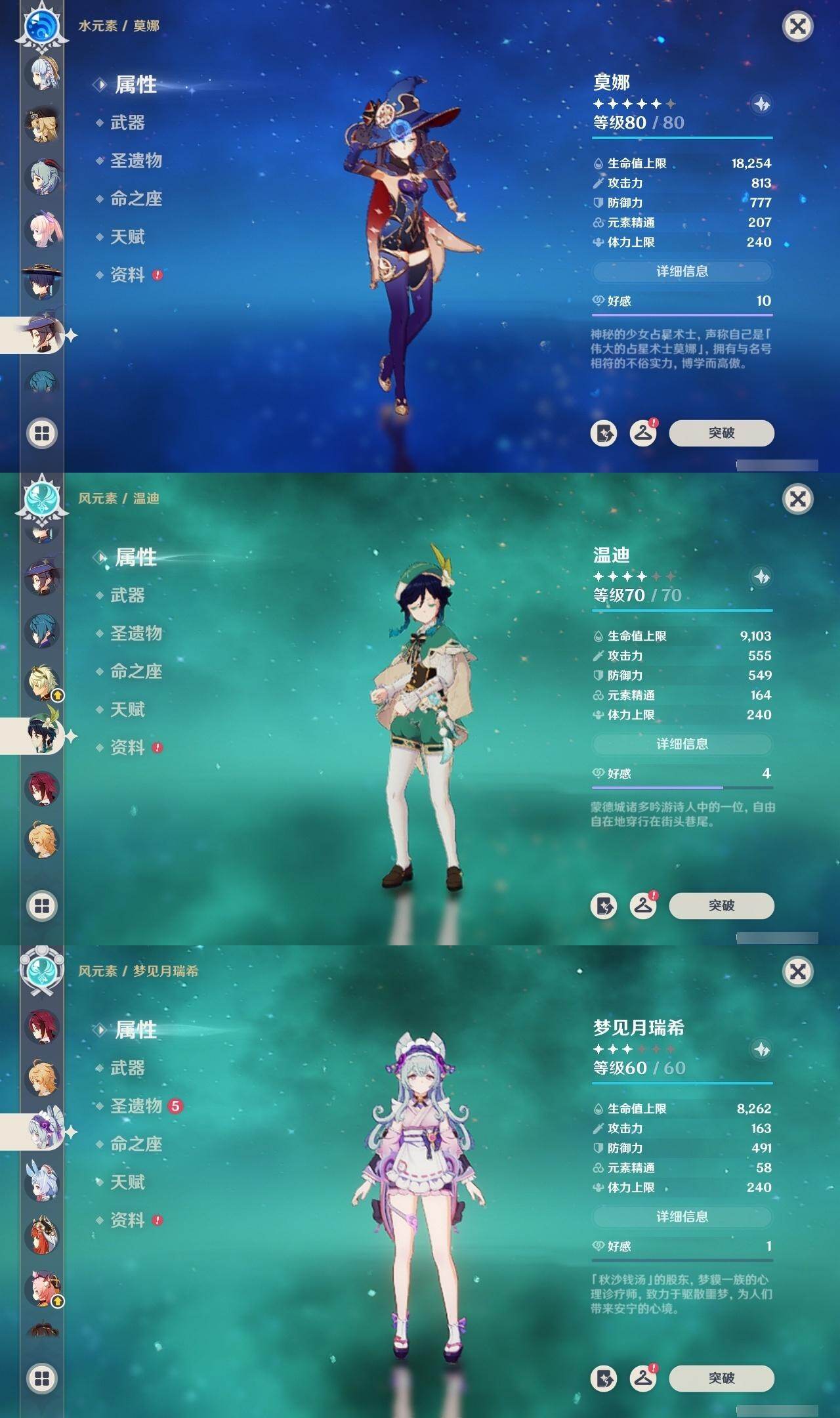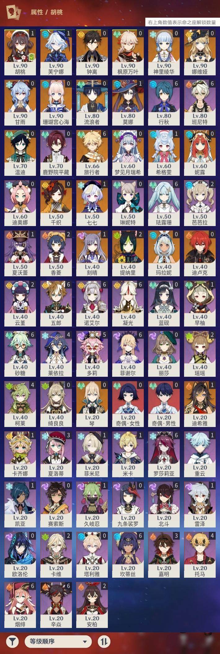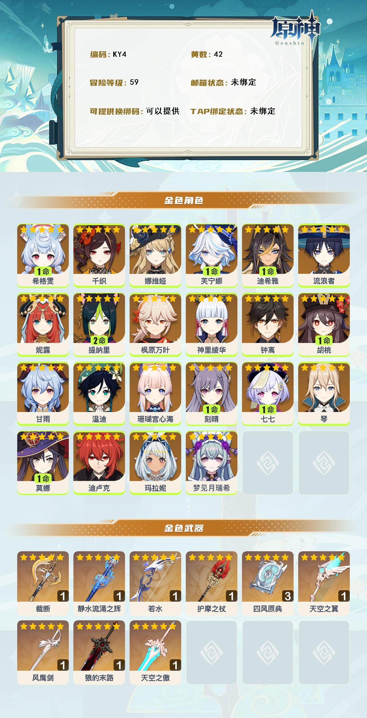 [16047857]邮箱: 未绑定 总黄数: 42 冒险等级: 59 2命金色角色: 二命提纳里 1命金色角色: 一命七七一命刻晴一命莫娜一命胡桃一命迪希雅一命芙宁娜一命希格雯 0命金色角色: 迪卢克温迪枫原万叶神里绫华钟离琴甘雨珊瑚宫心海妮露流浪者娜维娅千织玛拉妮梦见月瑞希 拥有武器: 狼的末路天空之翼四风原典天空之傲风鹰剑护摩之杖若水静水流涌之辉裁断 3精武器: 四风原典 1精武器: 狼的末路天空之翼天空之傲风鹰剑护摩之杖若水静水流涌之辉裁断