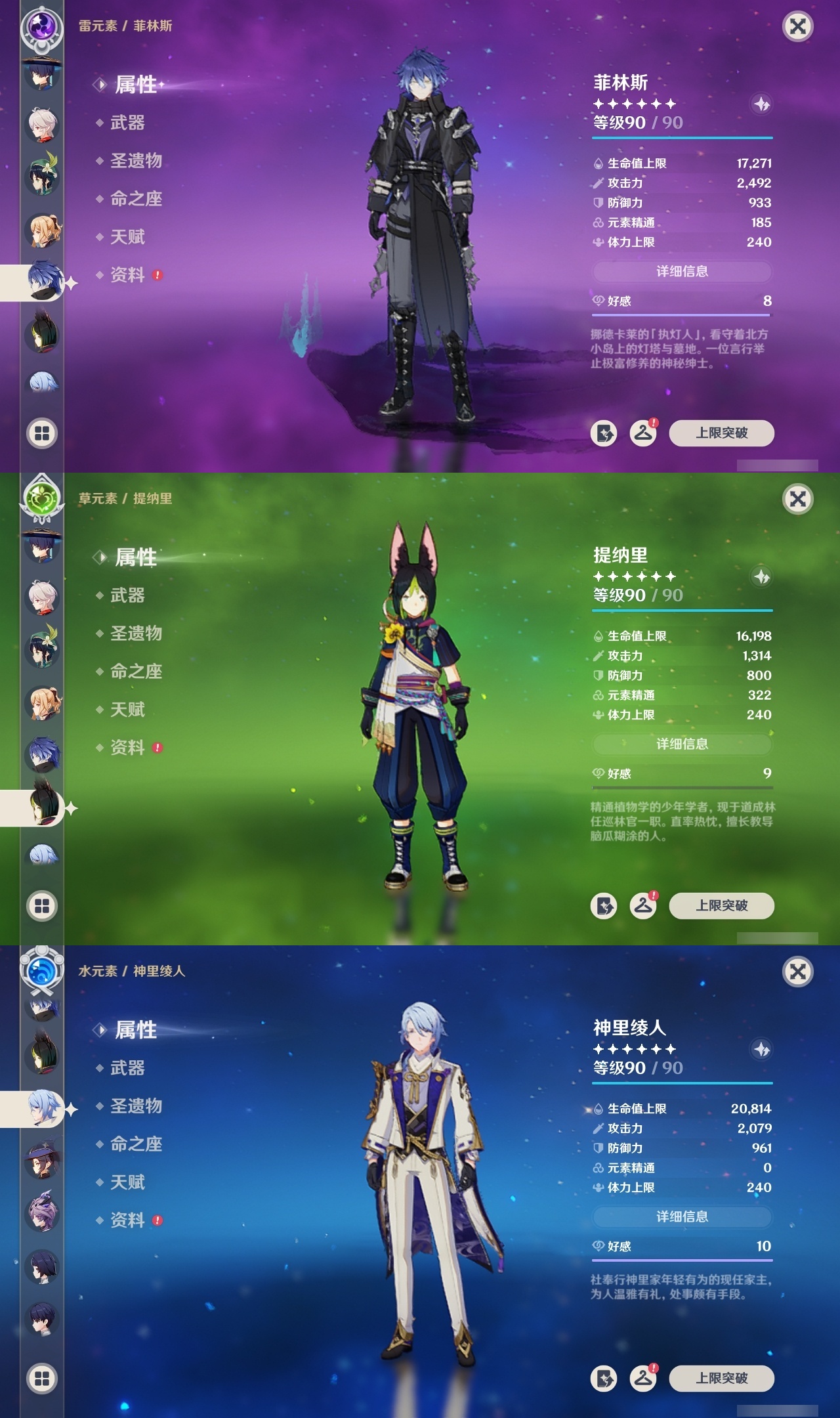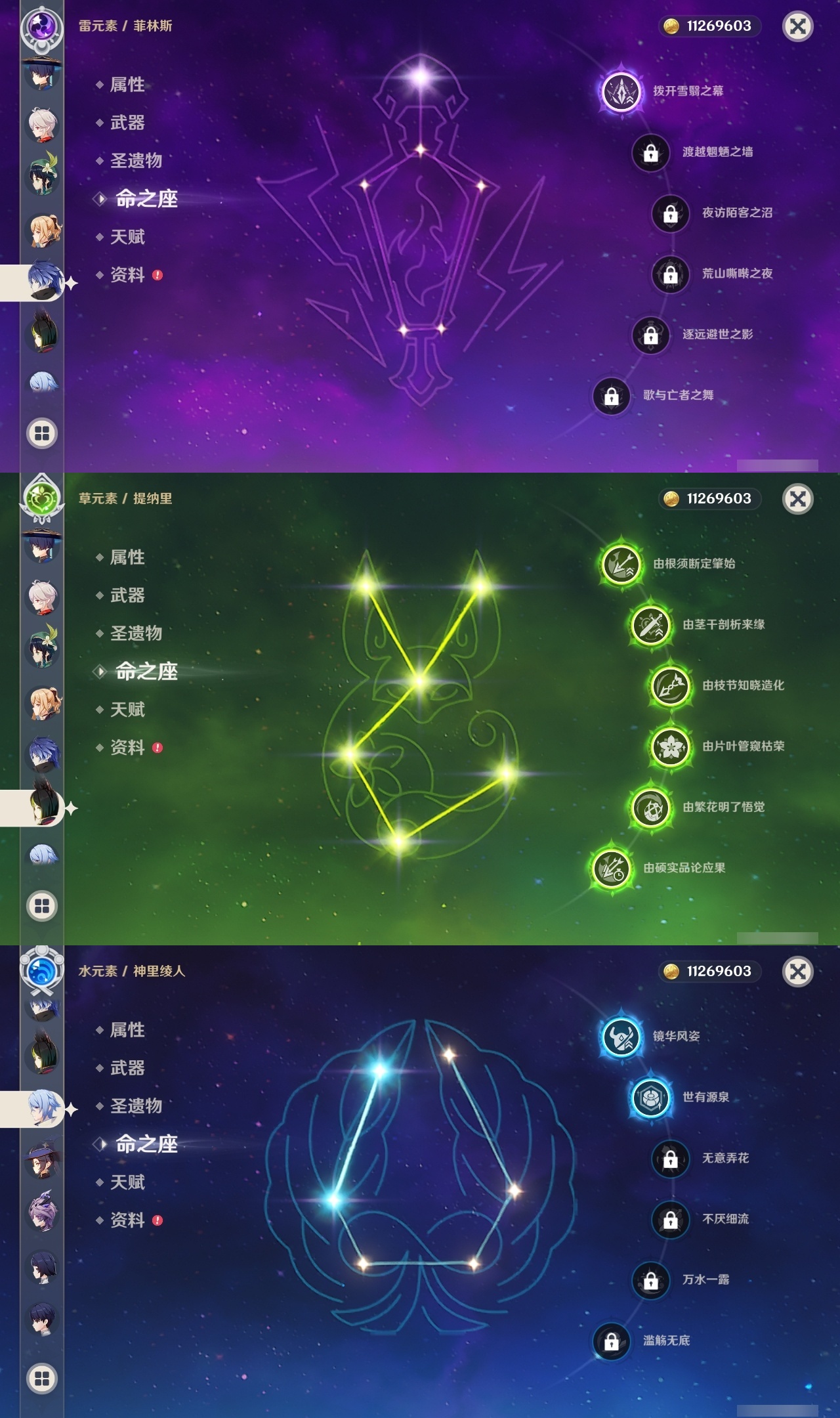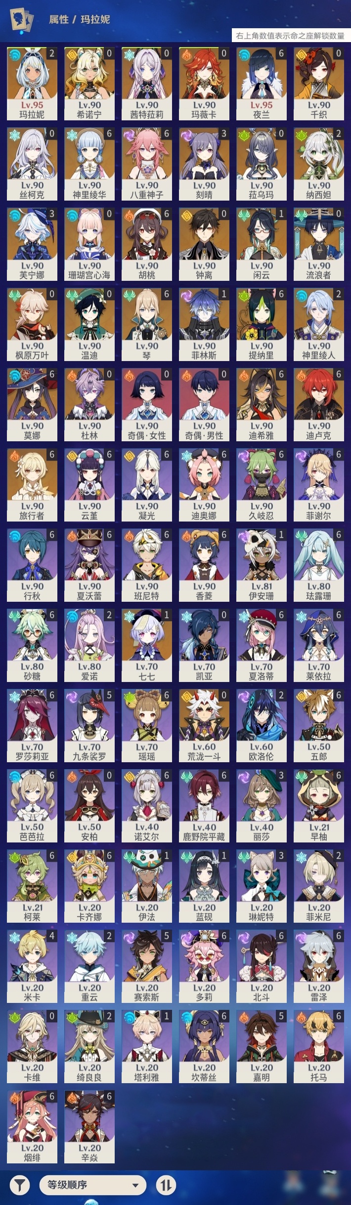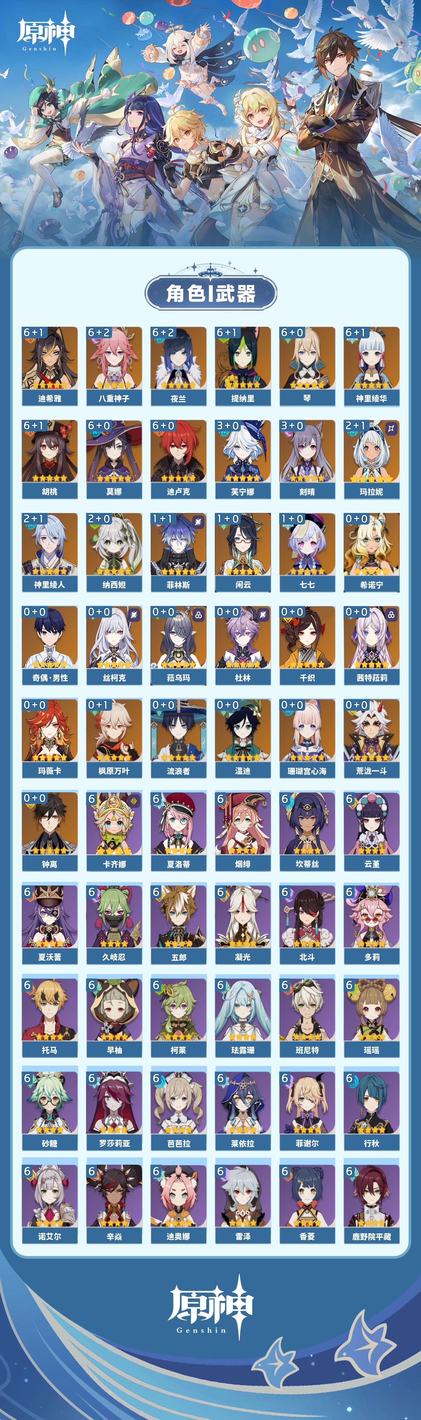 【原神】满命,冒险等级:60,五星数量:47,五星角色:迪希雅 6命迪卢克 6命胡桃 6命莫娜 6命琴 6命神里绫华 6命八重神子 6命夜兰 6命提纳里 6命芙宁娜 3命刻晴 3命玛拉妮 2命神里绫人 2命纳西妲 2命闲云 1命菲林斯 1命七七 1命珊瑚宫心海希诺宁温迪玛薇卡茜特菈莉钟离荒泷一斗千织丝柯克菈乌玛流浪者杜林枫原万叶__五星武器:四风原典 3精和璞鸢 2精神乐之真意 2精若水 2精冲浪时光苇海信标血染荒城苍古自由之誓护摩之杖天空之傲无工之剑雾切之回光冬极白星波乱月白经津猎人之径__四星角色:卡齐娜 6命班尼特 6命行秋 6命香菱 6命久岐忍 6命鹿野院平藏 6命珐露珊 6命凝光 6命迪奥娜 6命砂糖 6命瑶瑶 6命莱依拉 6命坎蒂丝 6命多莉 6命柯莱 6命芭芭拉 6命云堇 6命早柚 6命托马 6命五郎 6命烟绯 6命辛焱 6命诺艾尔 6命罗莎莉亚 6命雷泽 6命菲谢尔 6命北斗 6命夏洛蒂 6命夏沃蕾 6命九条裟罗 5命嘉明 5命赛索斯 5命米卡 4命琳妮特 3命绮良良 2命欧洛伦 2命重云 2命菲米尼 2命爱诺 2命蓝砚 1命伊法 1命伊安珊 1命塔利雅 1命奇偶·女性奇偶·男性卡维