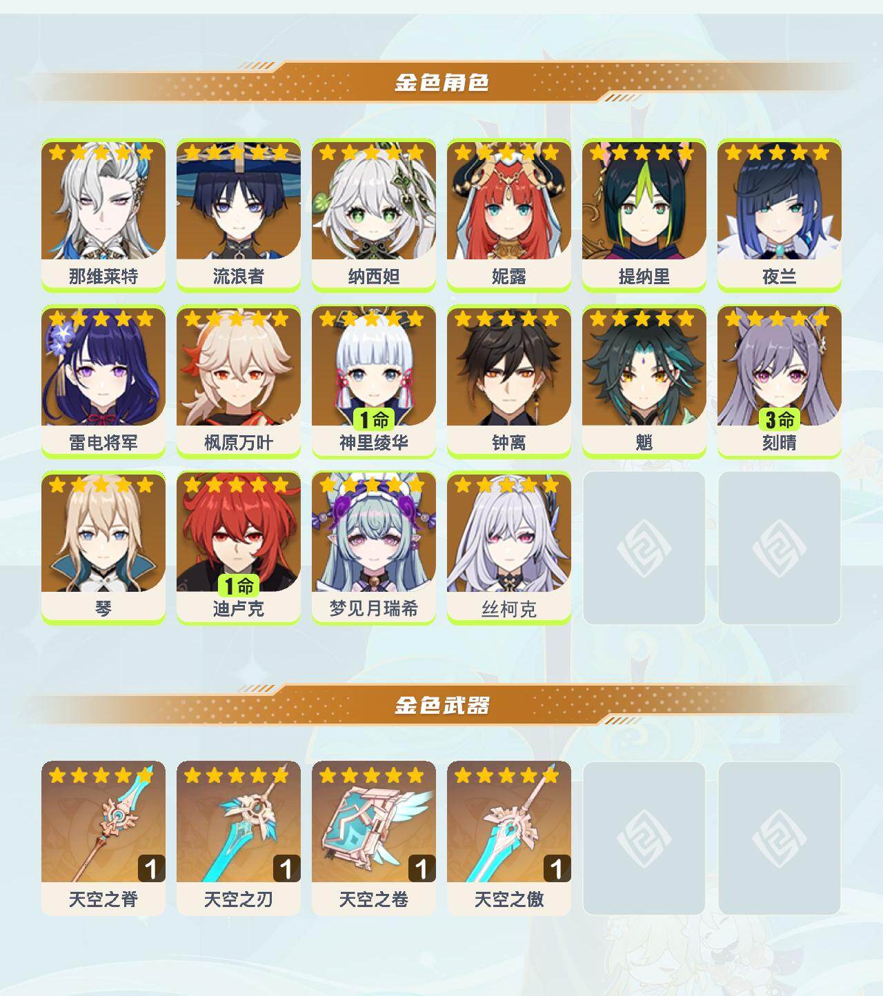 【店主推荐捡漏号】56级/25黄/女主/16个五星角色/4个五星武器 0命那维莱特0命流浪者0命纳西妲0命妮露0命提纳里0命夜兰0命雷电将军0命枫原万叶1命神里绫华0命钟离0命魈3命刻晴0命琴1命迪卢克0命梦见月瑞希0命丝柯克精1天空之脊精1天空之刃精1天空之卷精1天空之傲