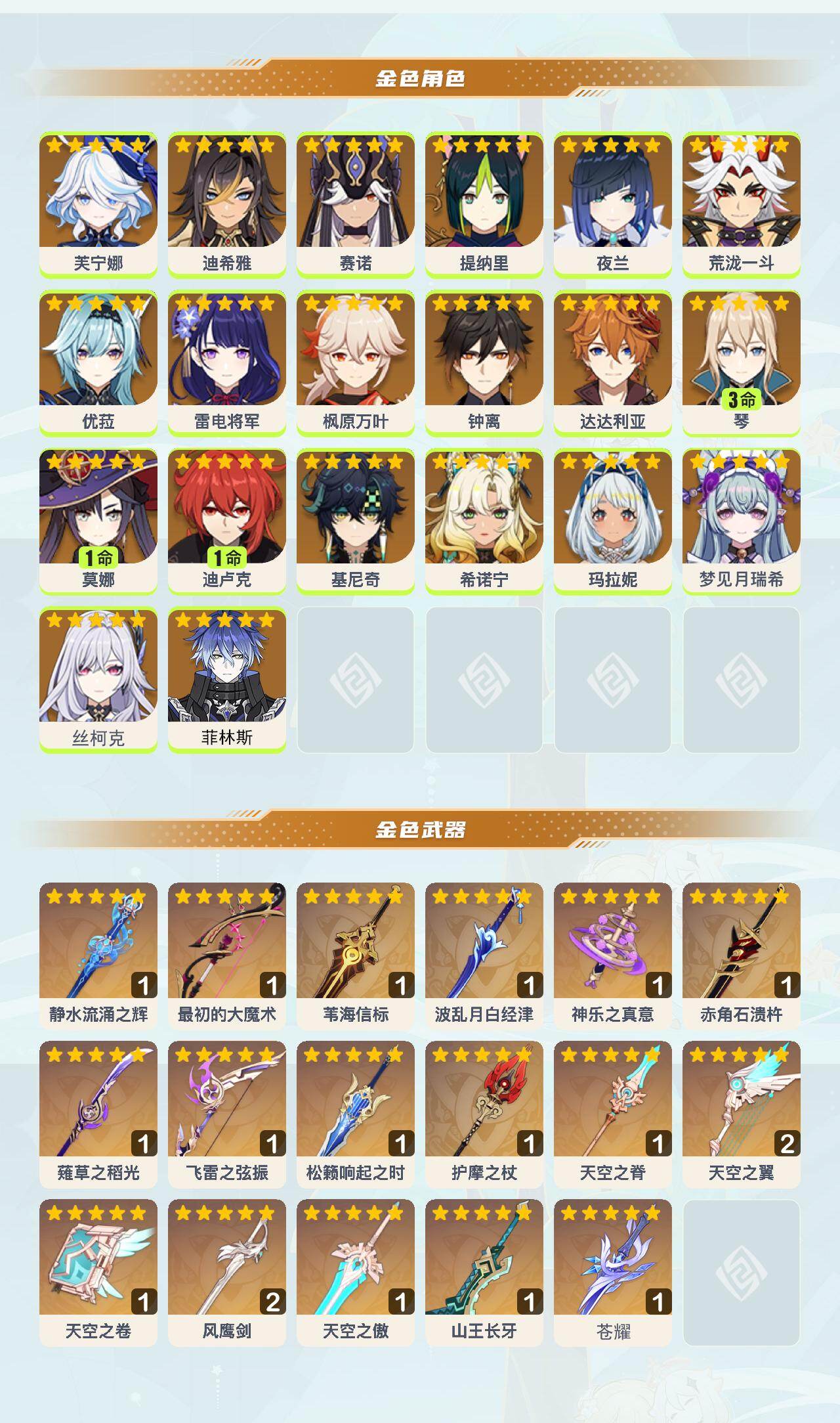 【ysyt693】60级/44黄/女主/20个五星角色/17个五星武器/0命丝柯克/0命芙宁娜/0命菲林斯/0命钟离/0命达达利亚/0命玛拉妮/0命荒泷一斗/0命枫原万叶/0命优菈/0命雷电将军/0命夜兰/0命基尼奇/0命赛诺/1命莫娜/0命希诺宁/3命琴/1命迪卢克/0命迪希雅/0命梦见月瑞希/0命提纳里/精1最初的大魔术/精1飞雷之弦振/精1薙草之稻光/精1护摩之杖/精1苇海信标/精1赤角石溃杵/精1松籁响起之时/精1苍耀/精1静水流涌之辉/精1波乱月白经津/精2风鹰剑/精1神乐之真意/精1天空之脊/精1山王长牙/精1天空之卷/精2天空之翼/精1天空之傲