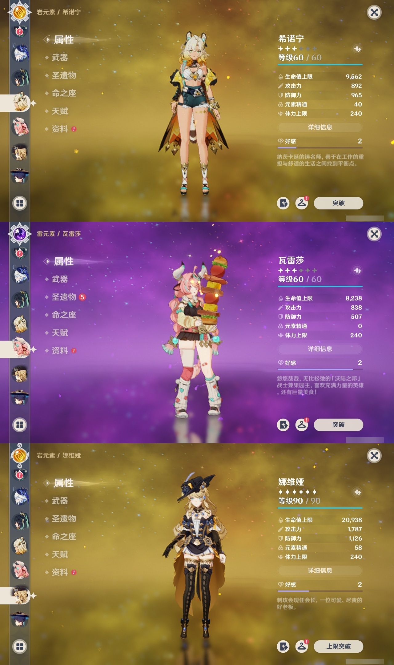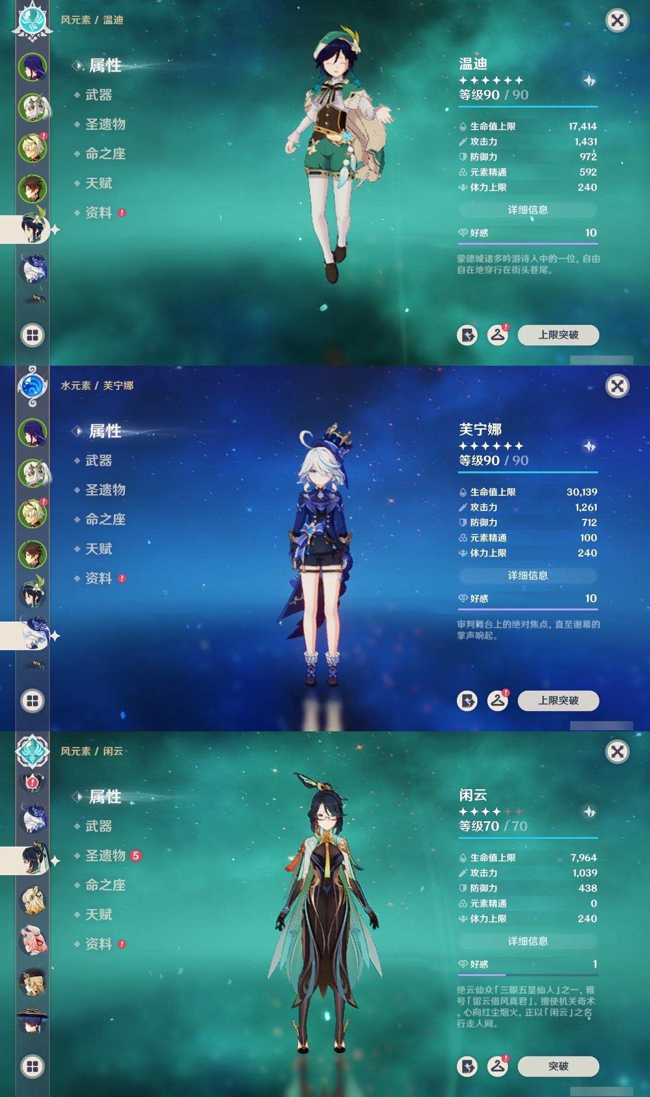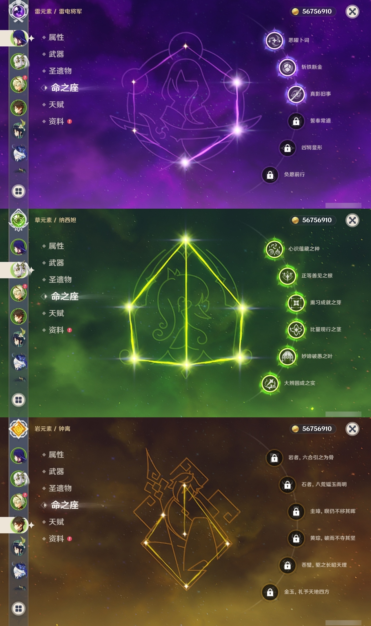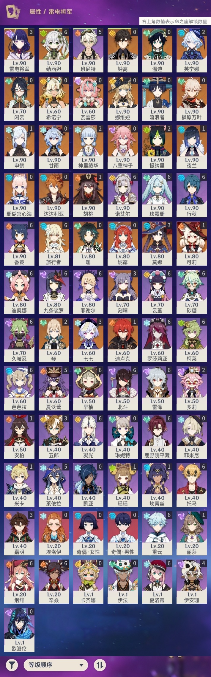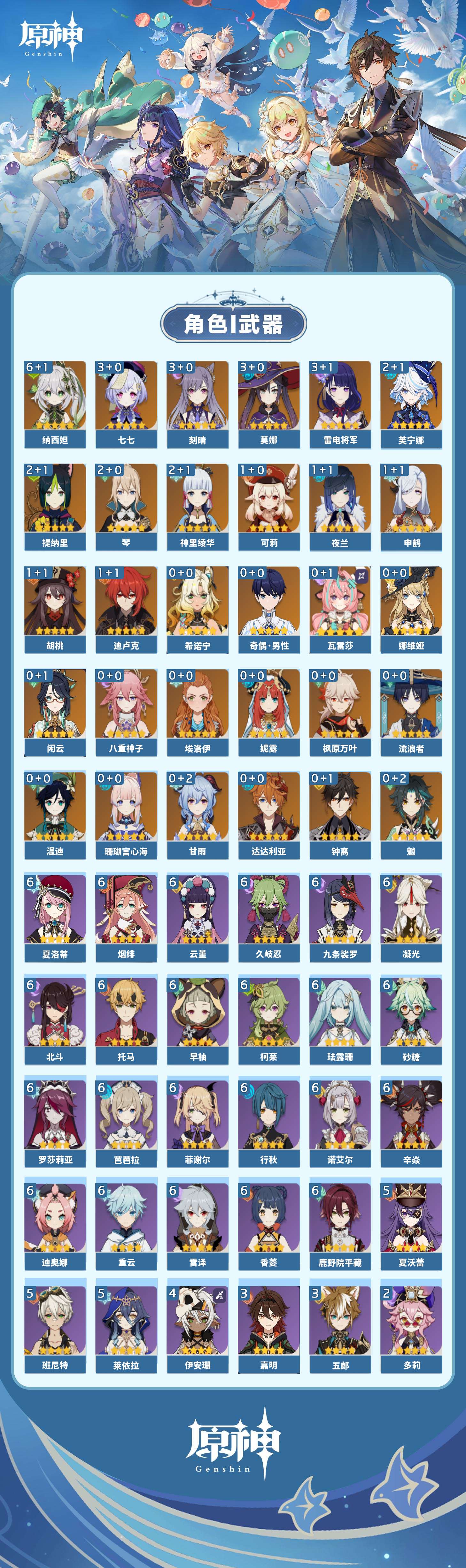 【原神】【lyys11019】冒险等级:60,五星数量:52,五星角色:纳西妲 6命刻晴 3命雷电将军 3命莫娜 3命七七 3命芙宁娜 2命琴 2命神里绫华 2命提纳里 2命迪卢克 1命胡桃 1命可莉 1命申鹤 1命夜兰 1命珊瑚宫心海希诺宁温迪钟离达达利亚瓦雷莎八重神子娜维娅闲云妮露流浪者枫原万叶甘雨魈__五星武器:阿莫斯之弓 2精和璞鸢 2精溢彩心念静水流涌之辉鹤鸣余音风鹰剑护摩之杖狼的末路天空之傲天空之脊天空之卷天空之刃无工之剑雾切之回光薙草之稻光赤角石溃杵息灾贯虹之槊若水猎人之径千夜浮梦__四星角色:行秋 6命九条裟罗 6命香菱 6命久岐忍 6命鹿野院平藏 6命珐露珊 6命凝光 6命迪奥娜 6命砂糖 6命柯莱 6命芭芭拉 6命云堇 6命早柚 6命托马 6命烟绯 6命重云 6命辛焱 6命诺艾尔 6命罗莎莉亚 6命雷泽 6命菲谢尔 6命北斗 6命夏洛蒂 6命班尼特 5命莱依拉 5命夏沃蕾 5命伊安珊 4命五郎 3命嘉明 3命多莉 2命瑶瑶 1命米卡 1命坎蒂丝 1命埃洛伊奇偶·女性奇偶·男性卡齐娜欧洛伦菲米尼琳妮特伊法