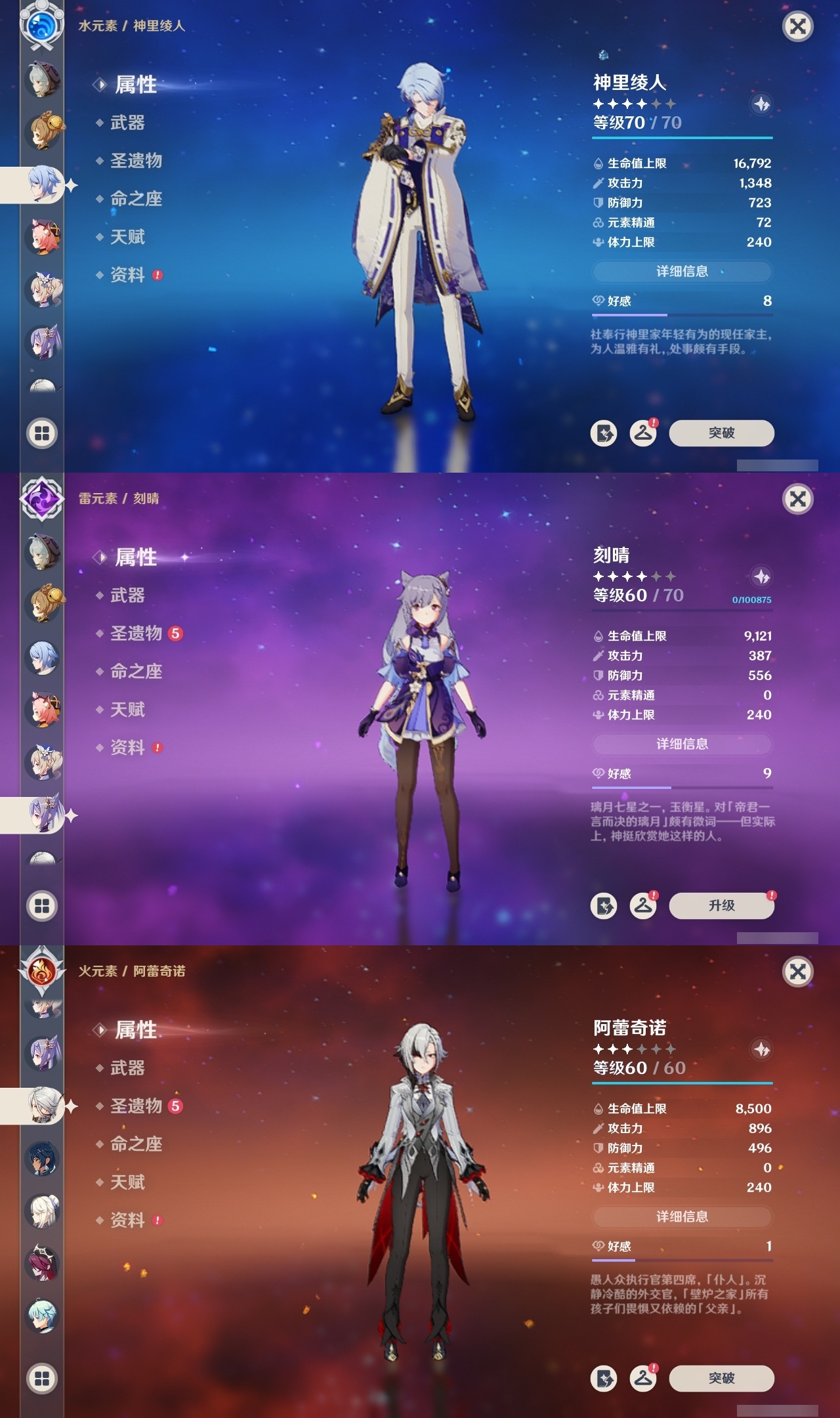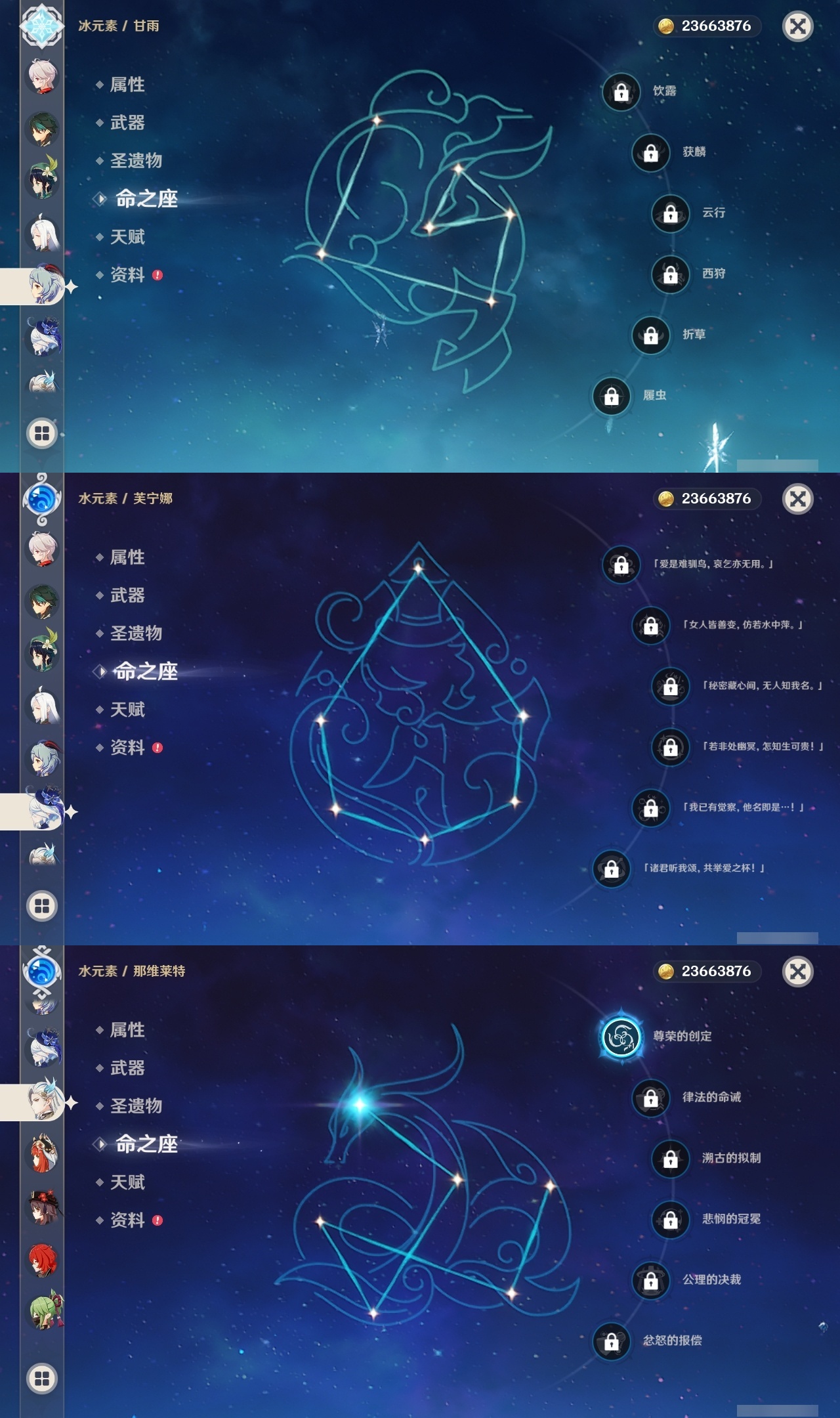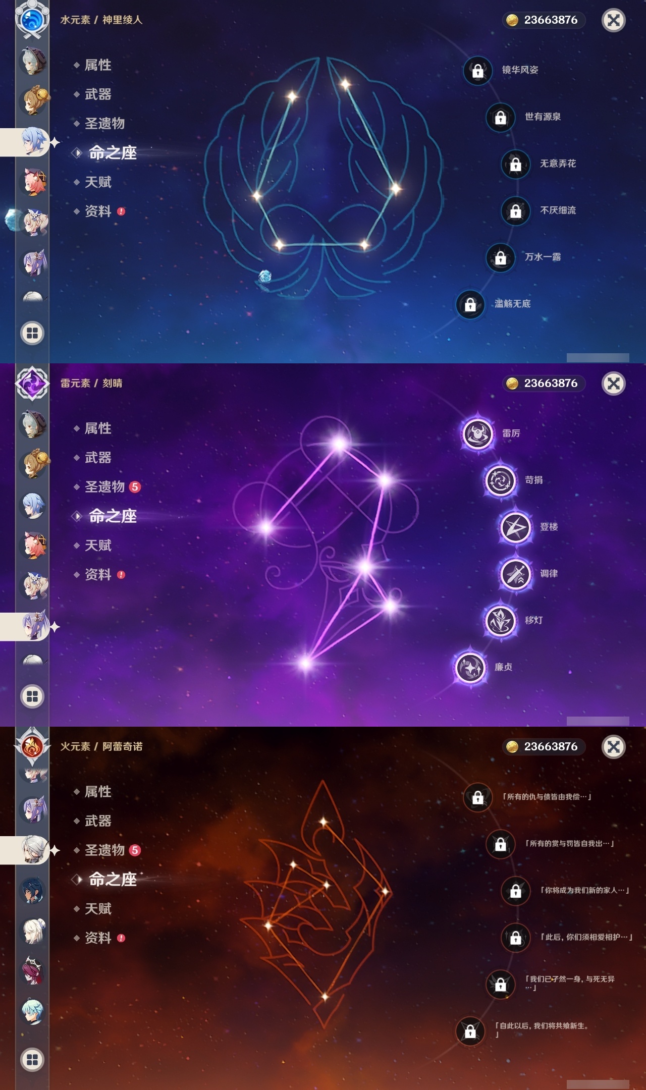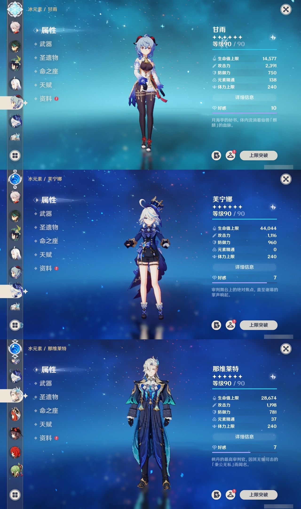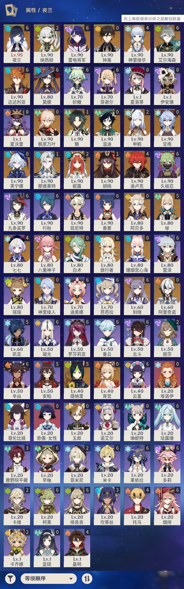 【原神】满命,冒险等级:60,五星数量:55,五星角色:达达利亚 6命刻晴 6命雷电将军 6命莫娜 6命夜兰 6命艾尔海森 6命琴 5命提纳里 5命迪卢克 4命七七 4命神里绫华 4命申鹤 2命妮露 2命纳西妲 2命那维莱特 1命魈 1命胡桃 1命珊瑚宫心海白术温迪宵宫钟离八重神子神里绫人阿贝多芙宁娜阿蕾奇诺哥伦比娅枫原万叶甘雨__五星武器:天空之脊 3精天空之翼 3精若水 3精阿莫斯之弓 2精和璞鸢 2精护摩之杖 2精冬极白星 2精万世流涌大典裁叶萃光苍古自由之誓尘世之锁飞雷之弦振狼的末路四风原典天空之傲天空之卷天空之刃雾切之回光薙草之稻光终末嗟叹之诗息灾圣显之钥千夜浮梦__四星角色:班尼特 6命行秋 6命九条裟罗 6命香菱 6命久岐忍 6命珐露珊 6命凝光 6命迪奥娜 6命砂糖 6命绮良良 6命瑶瑶 6命莱依拉 6命米卡 6命多莉 6命柯莱 6命芭芭拉 6命云堇 6命早柚 6命烟绯 6命重云 6命辛焱 6命诺艾尔 6命罗莎莉亚 6命雷泽 6命菲谢尔 6命北斗 6命托马 4命嘉明 4命鹿野院平藏 3命坎蒂丝 3命卡齐娜 2命卡维 2命菲米尼 2命埃洛伊奇偶·女性蓝砚五郎琳妮特夏洛蒂夏沃蕾伊安珊
