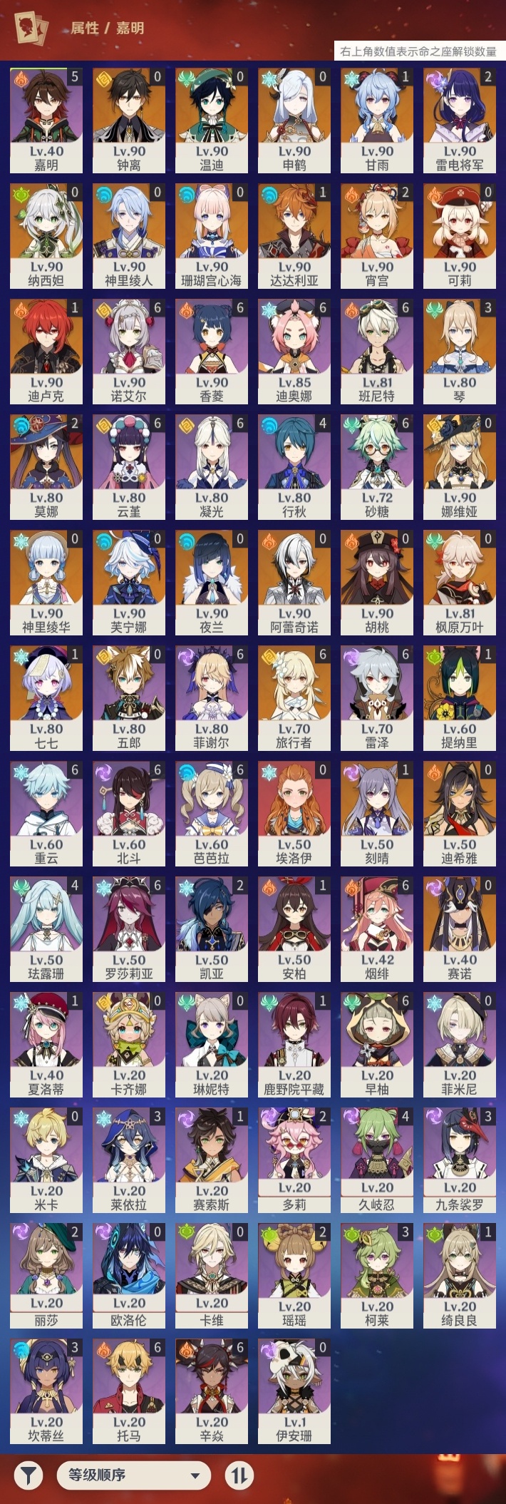 【原神】【lyys11034】冒险等级:60,五星数量:41,五星角色:琴 3命雷电将军 2命莫娜 2命宵宫 2命达达利亚 1命迪卢克 1命甘雨 1命刻晴 1命七七 1命提纳里 1命珊瑚宫心海神里绫华温迪迪希雅钟离申鹤神里绫人夜兰芙宁娜娜维娅赛诺阿蕾奇诺纳西妲枫原万叶胡桃可莉__五星武器:最初的大魔术裁断阿莫斯之弓飞雷之弦振风鹰剑和璞鸢护摩之杖天空之傲天空之脊天空之刃天空之翼赤角石溃杵若水千夜浮梦__四星角色:班尼特 6命香菱 6命凝光 6命迪奥娜 6命砂糖 6命芭芭拉 6命云堇 6命早柚 6命托马 6命烟绯 6命重云 6命辛焱 6命诺艾尔 6命罗莎莉亚 6命雷泽 6命菲谢尔 6命北斗 6命嘉明 5命行秋 4命久岐忍 4命珐露珊 4命九条裟罗 3命莱依拉 3命坎蒂丝 3命柯莱 3命瑶瑶 2命多莉 2命鹿野院平藏 1命绮良良 1命夏洛蒂 1命赛索斯 1命埃洛伊卡齐娜米卡卡维欧洛伦五郎菲米尼琳妮特伊安珊