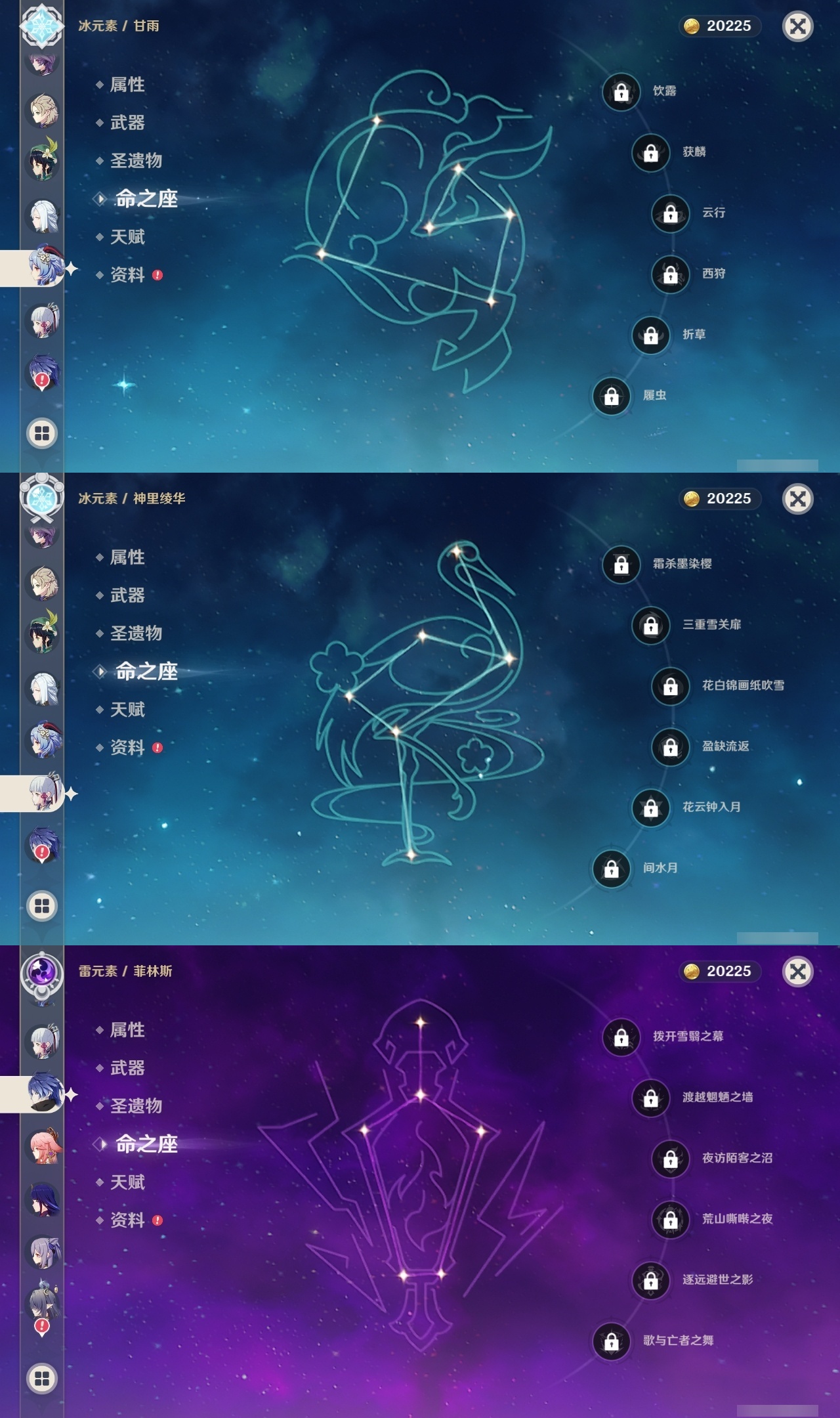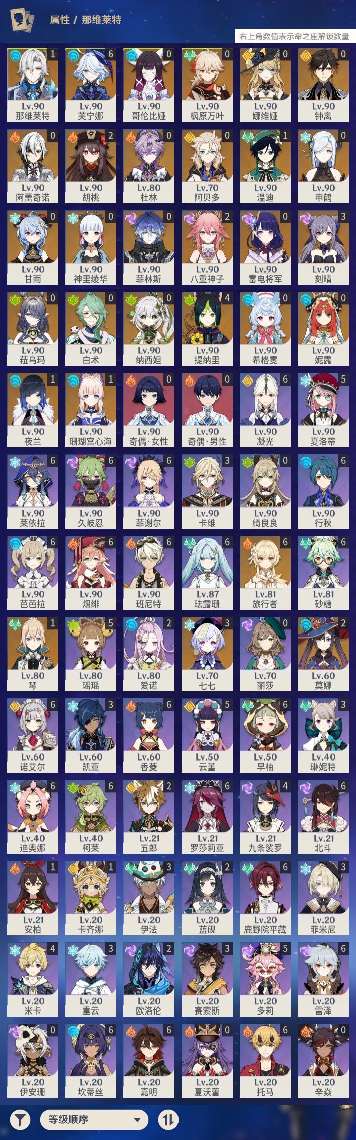 【原神】【lyys11046】冒险等级:60,五星数量:50,五星角色:芙宁娜 6命提纳里 4命刻晴 3命七七 3命胡桃 2命莫娜 2命八重神子 2命那维莱特 1命琴 1命珊瑚宫心海 1命温迪 1命夜兰 1命白术神里绫华钟离申鹤阿贝多娜维娅阿蕾奇诺妮露纳西妲菈乌玛菲林斯杜林哥伦比娅枫原万叶甘雨希格雯雷电将军__五星武器:四风原典 3精静水流涌之辉 2精阿莫斯之弓 2精碧落之珑万世流涌大典裁断支离轮光纺夜天镜帷间夜曲风鹰剑护摩之杖狼的末路天空之傲天空之翼神乐之真意贯虹之槊若水猎人之径圣显之钥__四星角色:班尼特 6命行秋 6命香菱 6命久岐忍 6命鹿野院平藏 6命珐露珊 6命凝光 6命迪奥娜 6命砂糖 6命莱依拉 6命坎蒂丝 6命柯莱 6命芭芭拉 6命早柚 6命托马 6命烟绯 6命诺艾尔 6命罗莎莉亚 6命雷泽 6命菲谢尔 6命北斗 6命嘉明 6命瑶瑶 5命多莉 5命云堇 5命夏洛蒂 5命九条裟罗 4命米卡 4命卡维 3命重云 3命菲米尼 3命琳妮特 3命伊法 3命赛索斯 3命欧洛伦 2命蓝砚 2命五郎 2命爱诺 2命卡齐娜 1命奇偶·女性奇偶·男性绮良良辛焱夏沃蕾伊安珊
