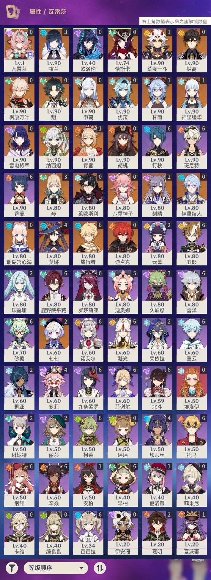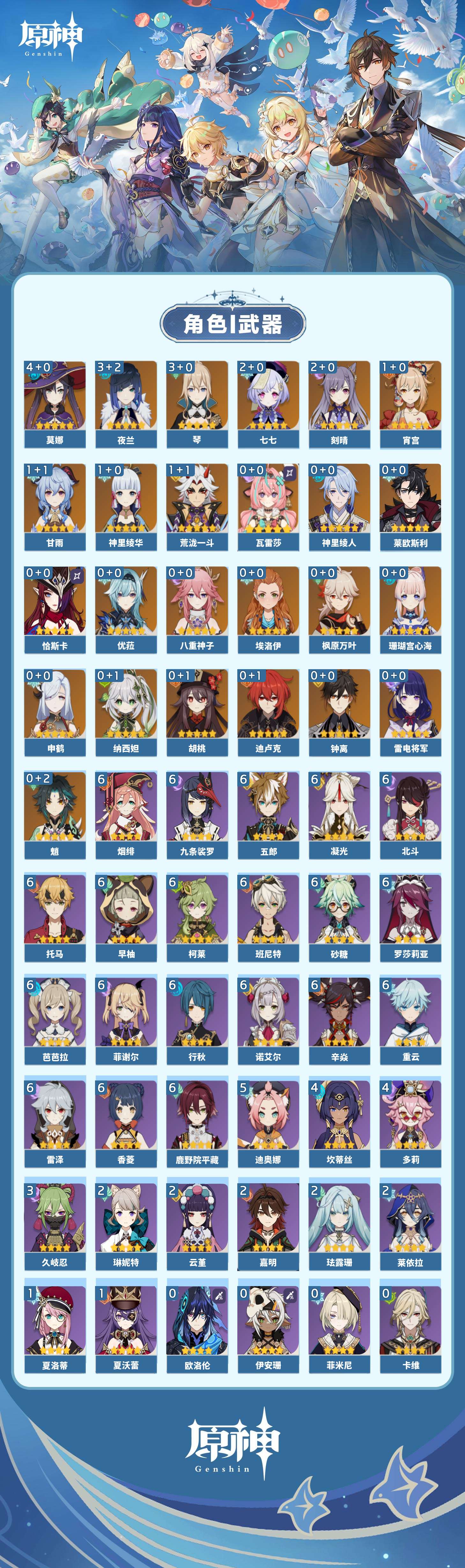 【原神】【lyys11028】冒险等级:59,五星数量:35,五星角色:莫娜 4命琴 3命夜兰 3命刻晴 2命七七 2命甘雨 1命神里绫华 1命宵宫 1命荒泷一斗 1命珊瑚宫心海恰斯卡优菈钟离申鹤瓦雷莎八重神子神里绫人莱欧斯利纳西妲迪卢克枫原万叶魈胡桃雷电将军__五星武器:和璞鸢 2精若水 2精阿莫斯之弓风鹰剑护摩之杖狼的末路天空之脊天空之翼赤角石溃杵千夜浮梦__四星角色:班尼特 6命行秋 6命九条裟罗 6命香菱 6命鹿野院平藏 6命凝光 6命砂糖 6命柯莱 6命芭芭拉 6命早柚 6命托马 6命五郎 6命烟绯 6命重云 6命辛焱 6命诺艾尔 6命罗莎莉亚 6命雷泽 6命菲谢尔 6命北斗 6命迪奥娜 5命坎蒂丝 4命多莉 4命久岐忍 3命珐露珊 2命莱依拉 2命云堇 2命琳妮特 2命嘉明 2命夏洛蒂 1命夏沃蕾 1命埃洛伊绮良良瑶瑶卡维欧洛伦菲米尼伊安珊