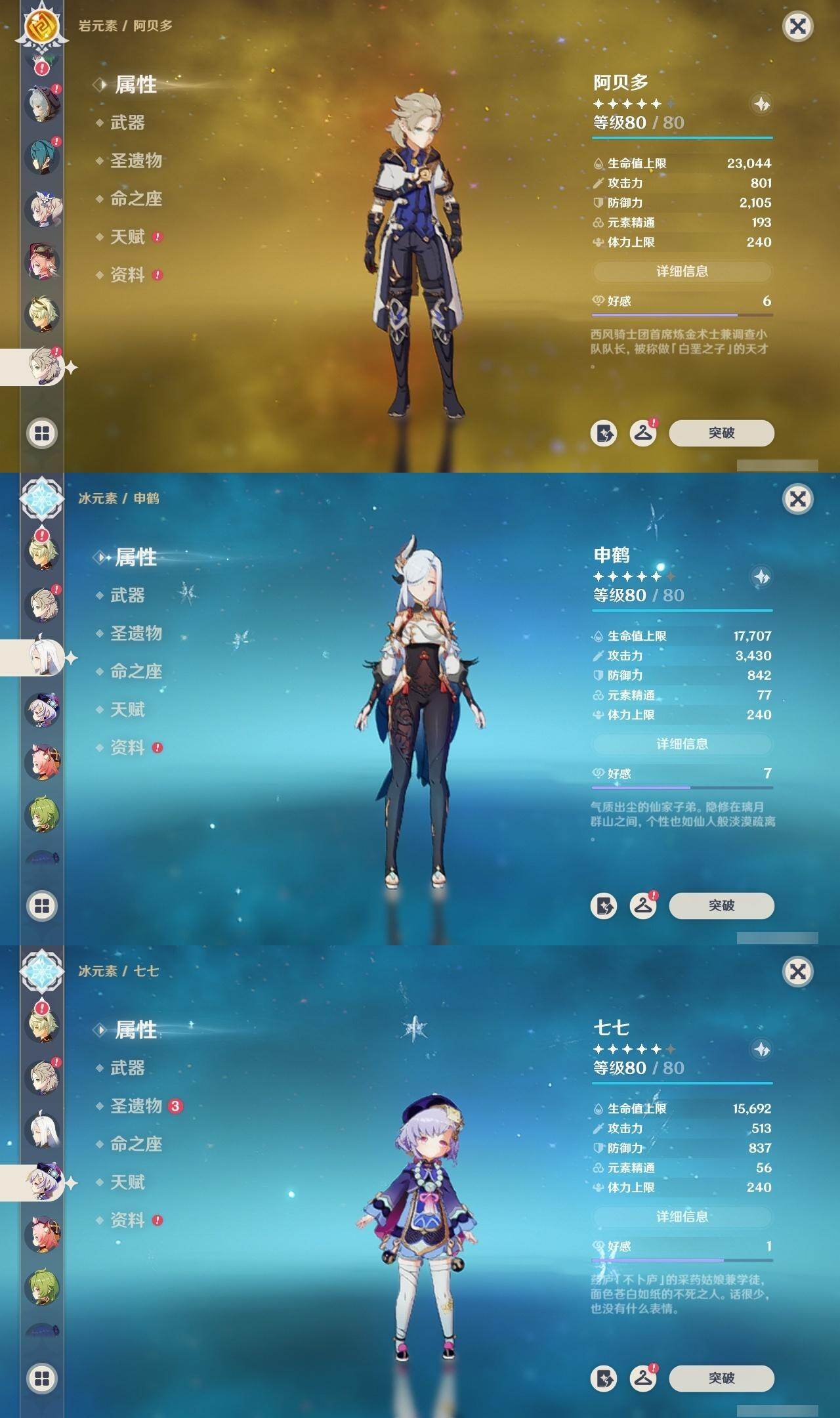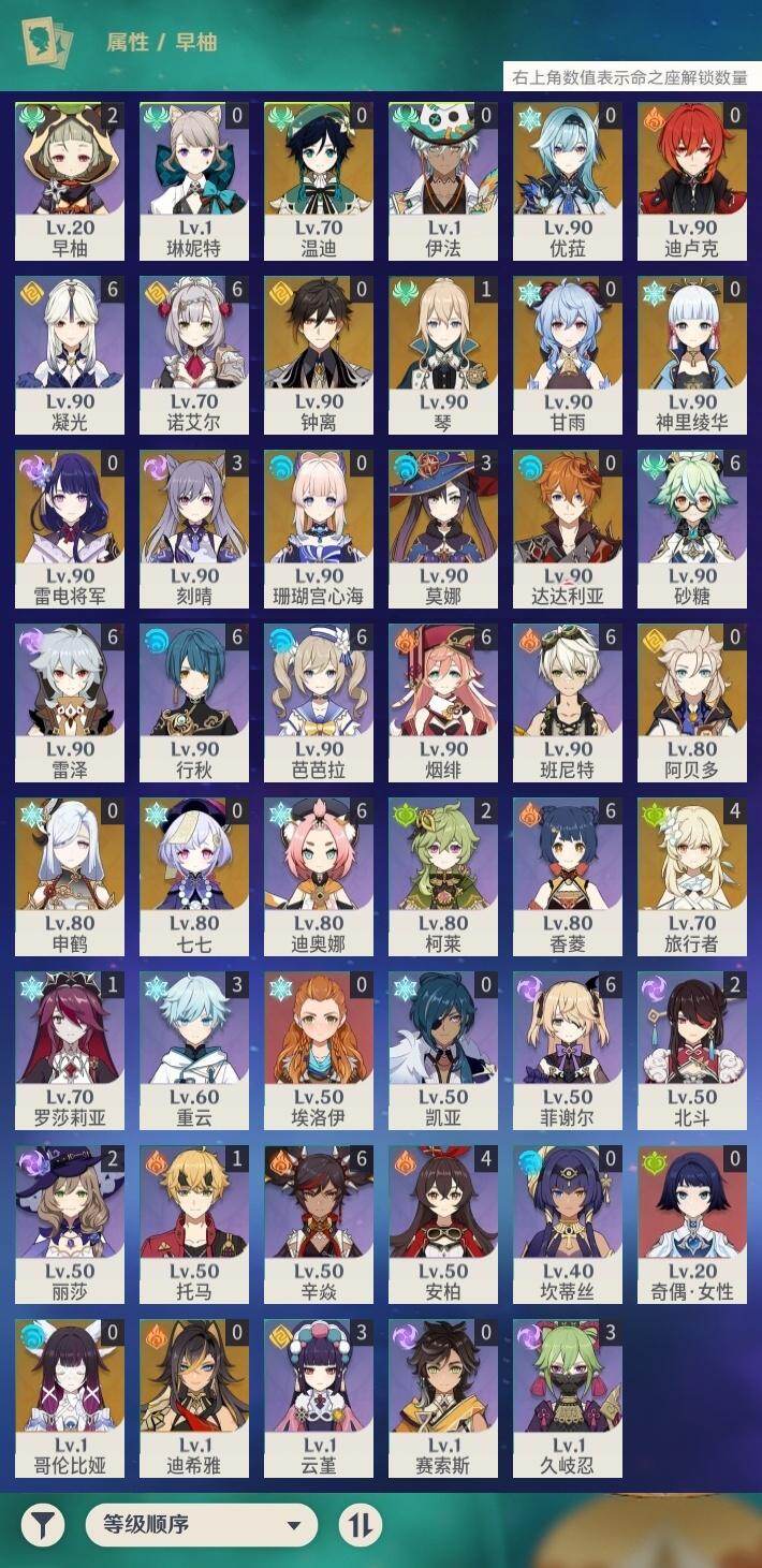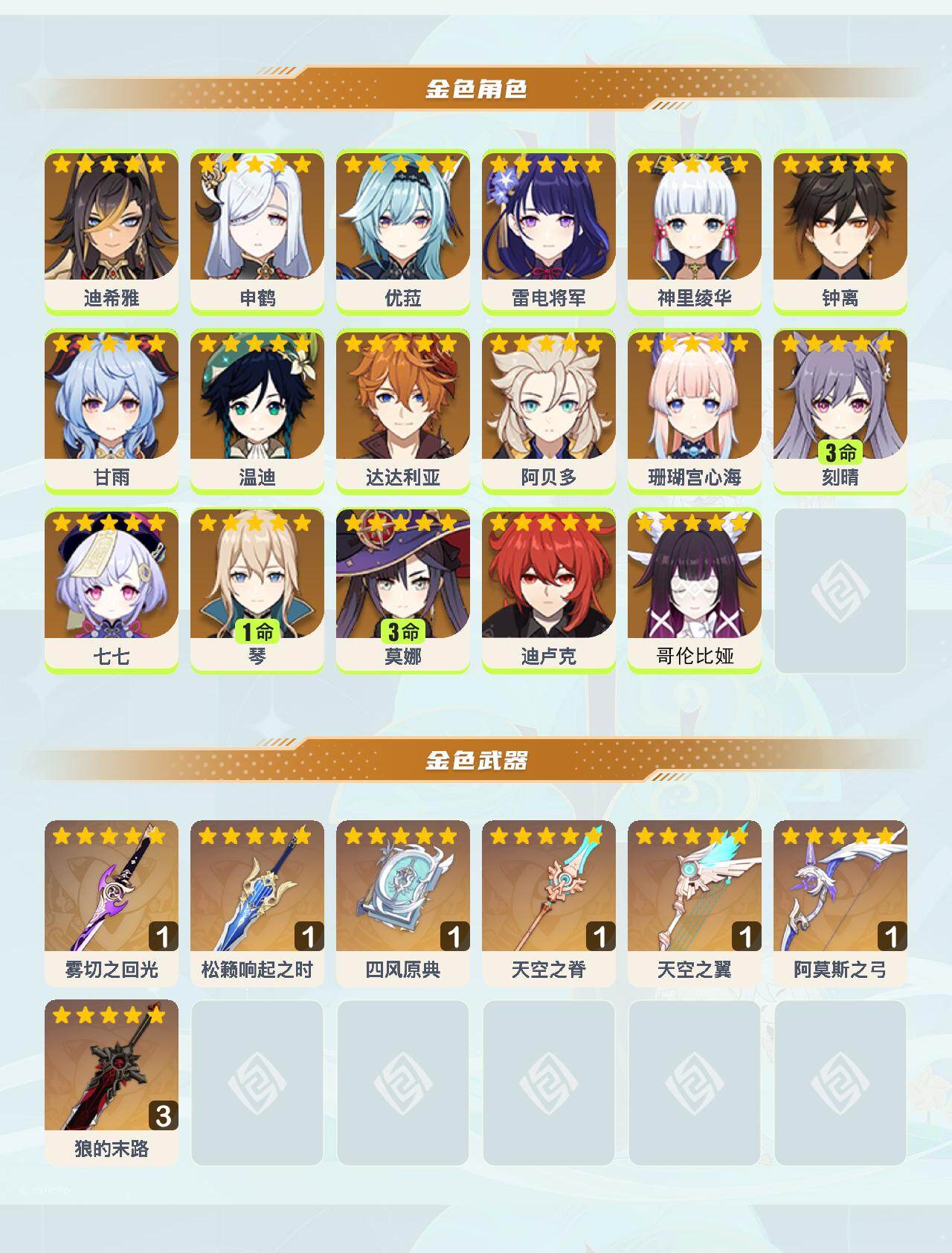 59级/35黄/女主/17个五星角色/9个五星武器 0命迪希雅0命申鹤0命优菈0命雷电将军0命神里绫华0命钟离0命甘雨0命温迪0命达达利亚0命阿贝多0命珊瑚宫心海3命刻晴0命七七1命琴3命莫娜0命迪卢克0命哥伦比娅精1雾切之回光精1松籁响起之时精1四风原典精1天空之脊精1天空之翼精1阿莫斯之弓精3狼的末路
