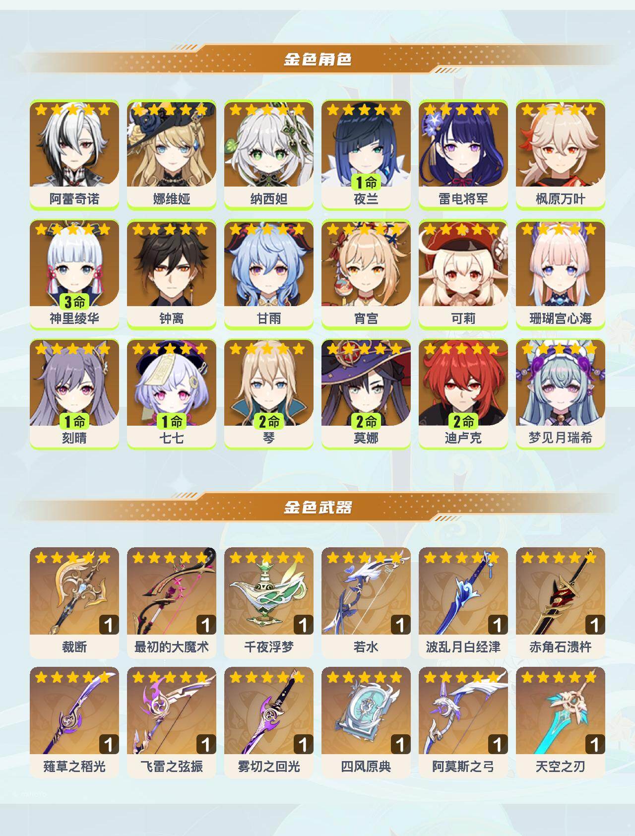 【ysyt502】60级/45黄/女主/18个五星角色/15个五星武器/0命宵宫/1命夜兰/0命钟离/0命娜维娅/0命甘雨/3命神里绫华/0命雷电将军/0命纳西妲/0命珊瑚宫心海/0命阿蕾奇诺/0命可莉/0命枫原万叶/0命梦见月瑞希/2命莫娜/2命琴/1命七七/1命刻晴/2命迪卢克/精1最初的大魔术/精1飞雷之弦振/精1若水/精1阿莫斯之弓/精1千夜浮梦/精1四风原典/精1薙草之稻光/精1裁断/精1赤角石溃杵/精1波乱月白经津/精1雾切之回光/精1天空之刃