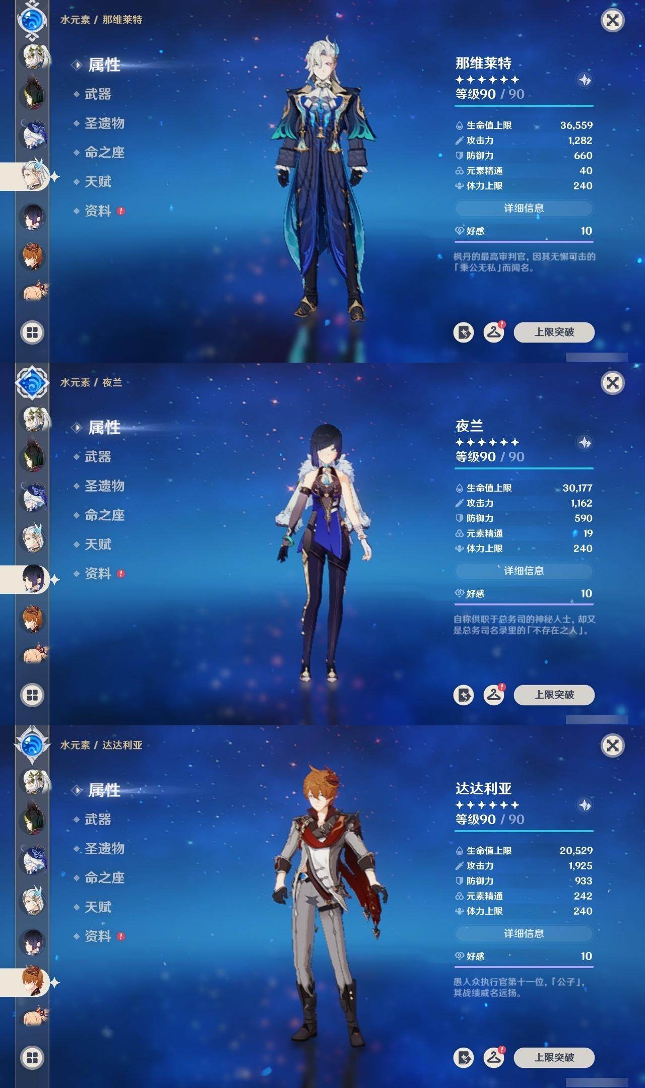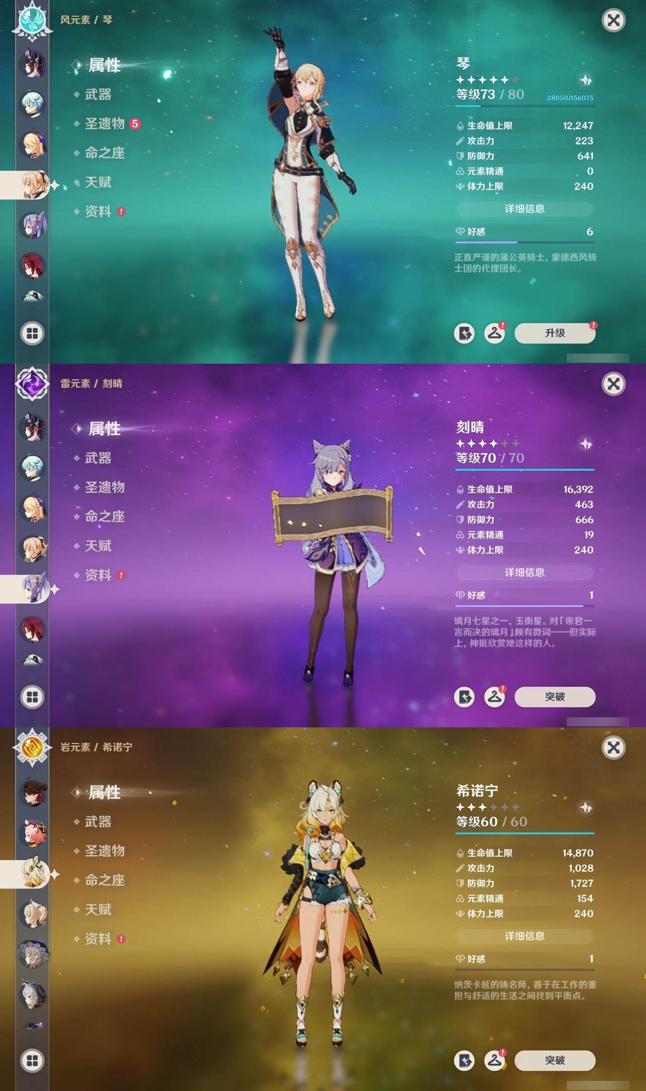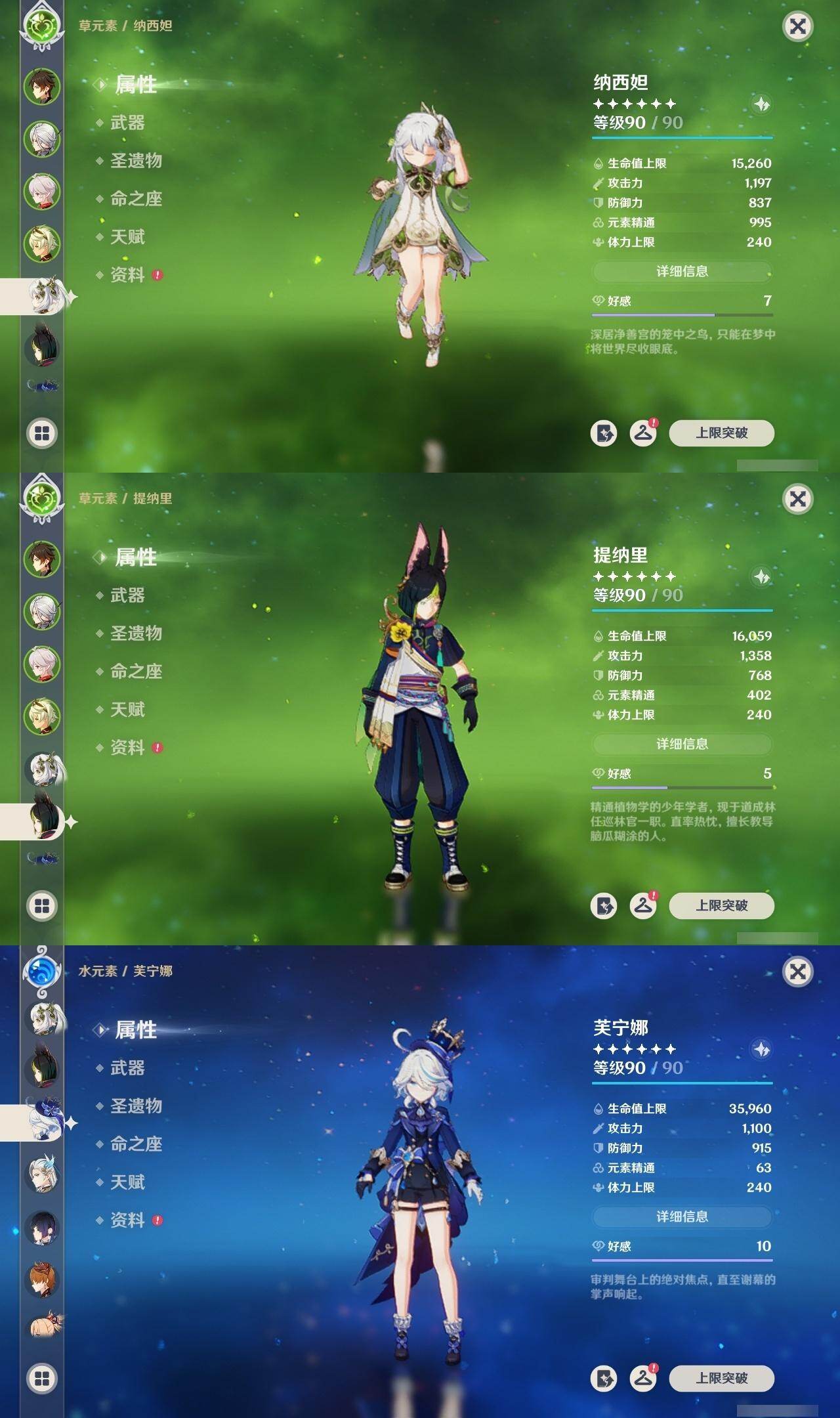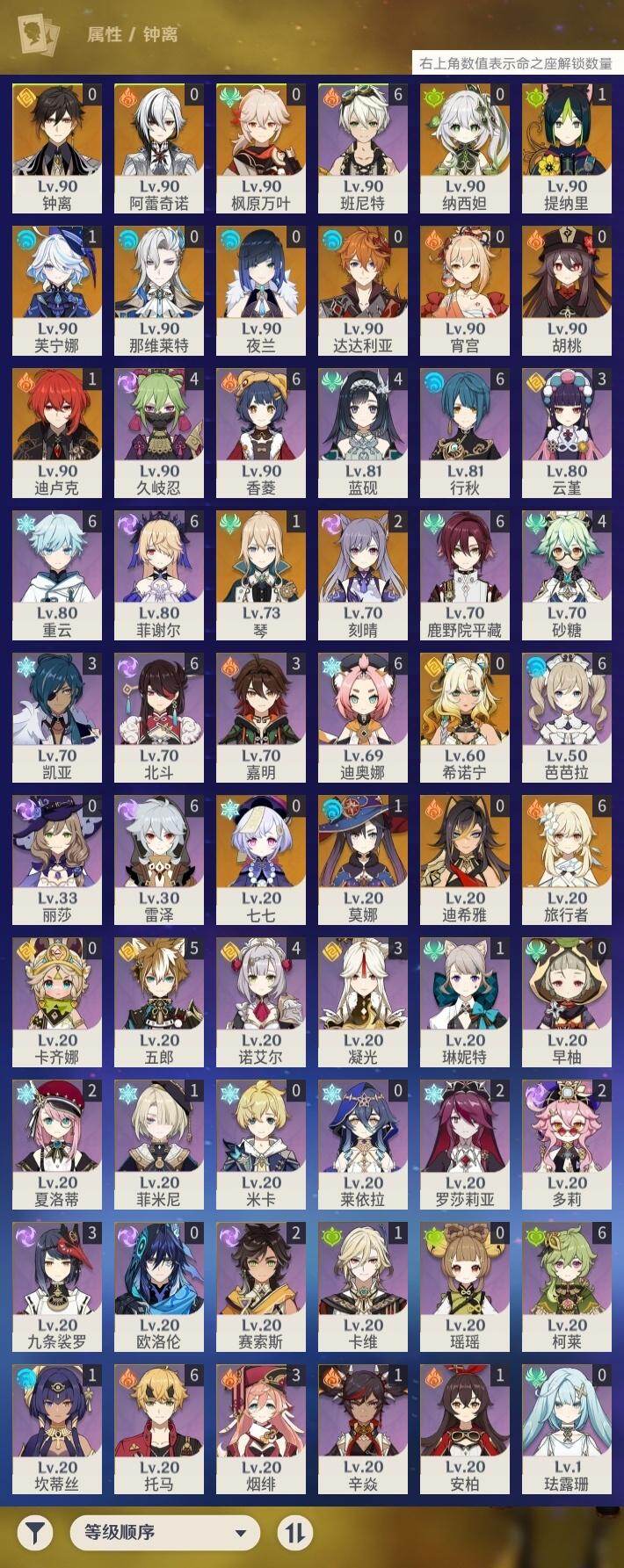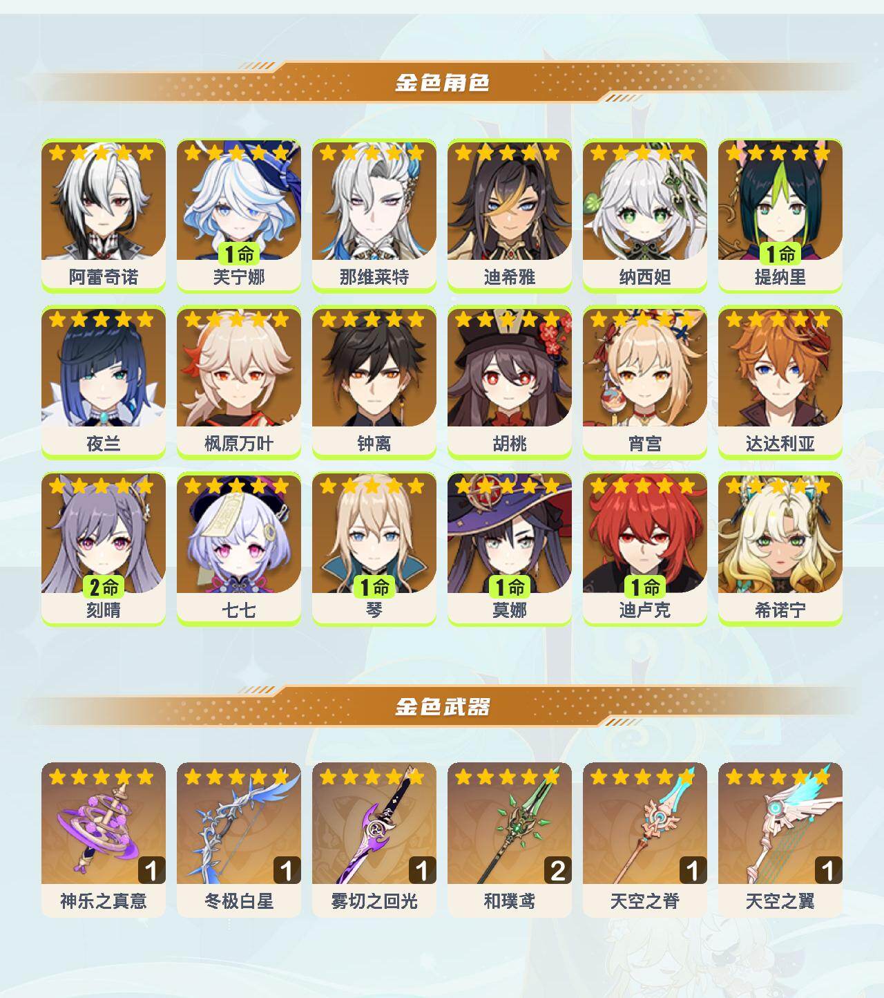 59级/32黄/女主/18个五星角色/6个五星武器 0命阿蕾奇诺1命芙宁娜0命那维莱特0命迪希雅0命纳西妲1命提纳里0命夜兰0命枫原万叶0命钟离0命胡桃0命宵宫0命达达利亚2命刻晴0命七七1命琴1命莫娜1命迪卢克0命希诺宁精1神乐之真意精1冬极白星精1雾切之回光精2和璞鸢精1天空之脊精1天空之翼