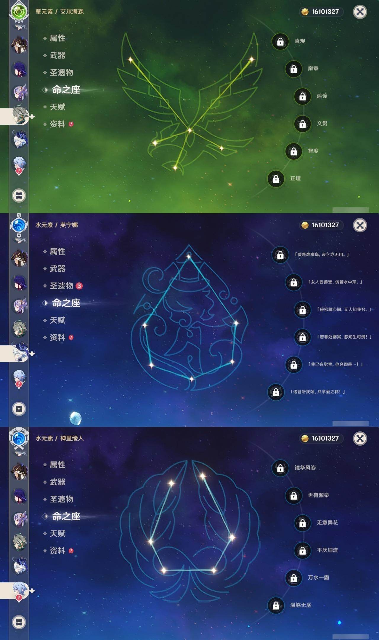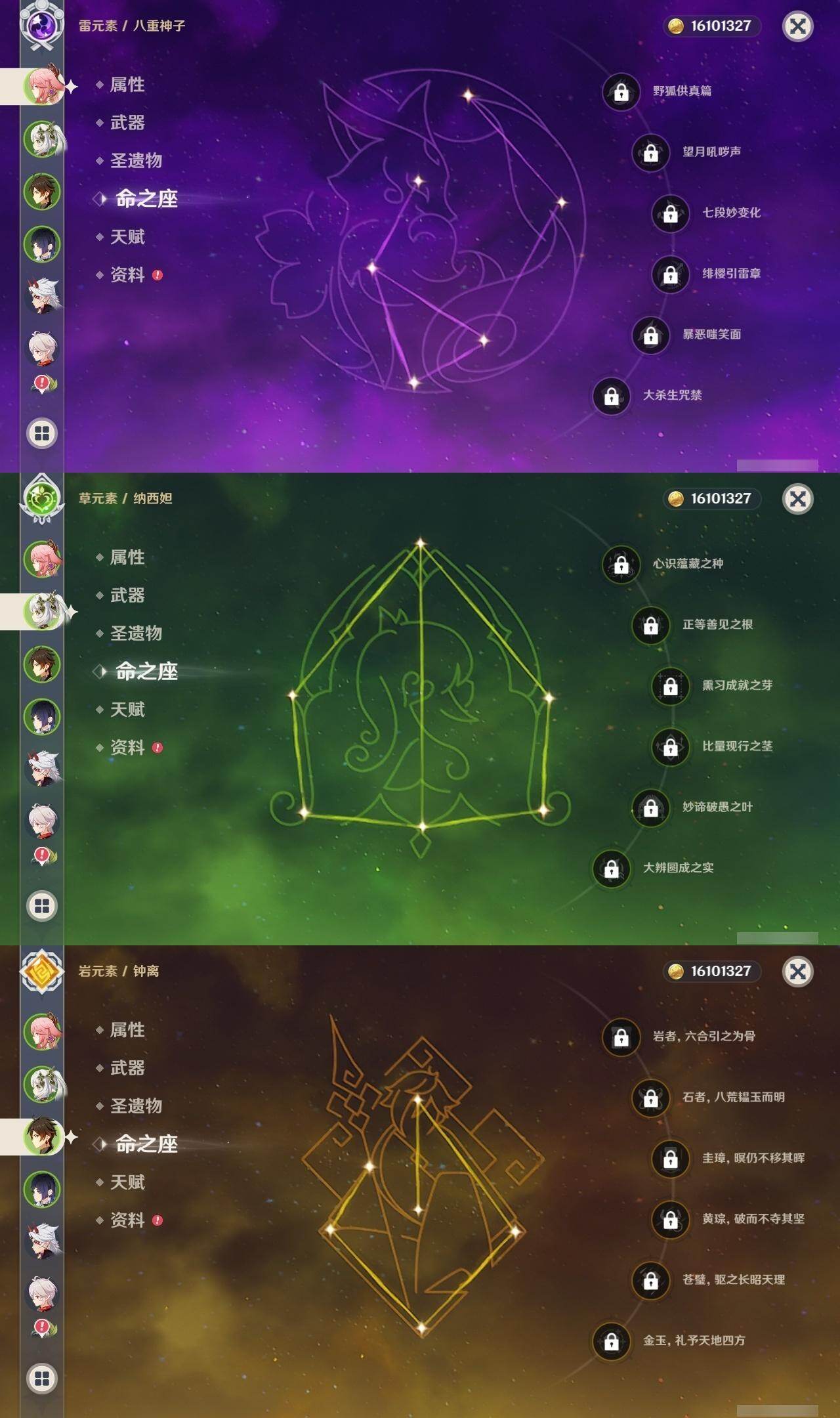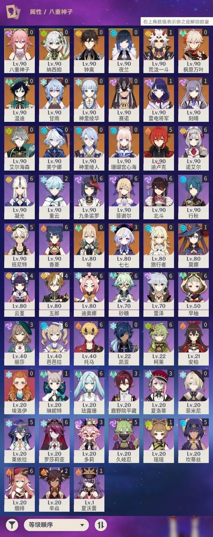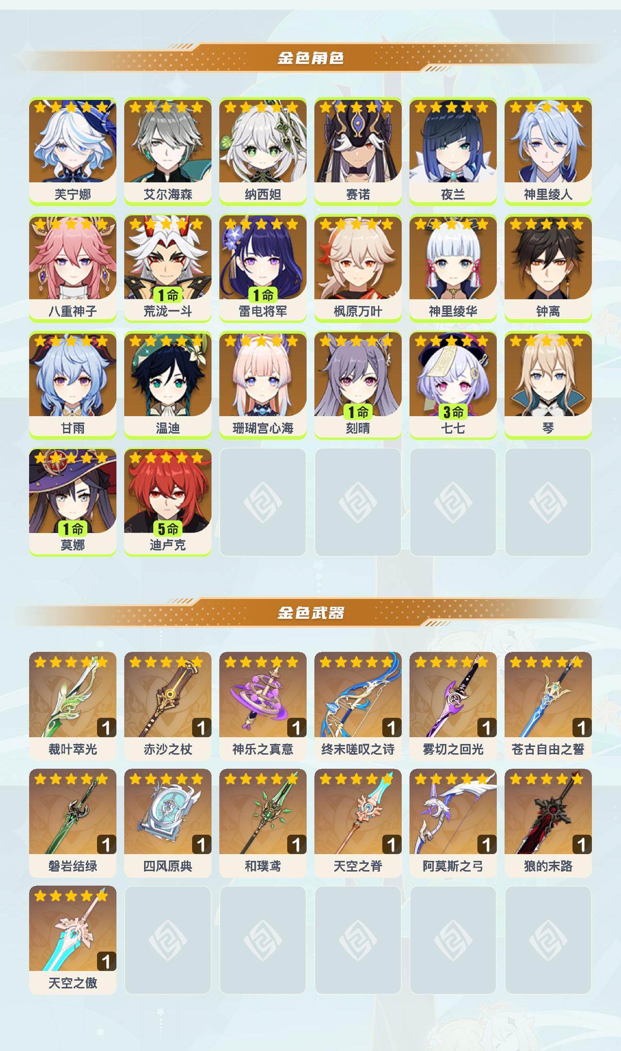 60级/47黄/女主/20个五星角色/15个五星武器 0命芙宁娜0命艾尔海森0命纳西妲0命赛诺0命夜兰0命神里绫人0命八重神子1命荒泷一斗1命雷电将军0命枫原万叶0命神里绫华0命钟离0命甘雨0命温迪0命珊瑚宫心海1命刻晴3命七七0命琴1命莫娜5命迪卢克精1裁叶萃光精1赤沙之杖精1神乐之真意精1终末嗟叹之诗精1雾切之回光精1苍古自由之誓精1磐岩结绿精1四风原典精1和璞鸢精1天空之脊精1阿莫斯之弓精1狼的末路精1天空之傲