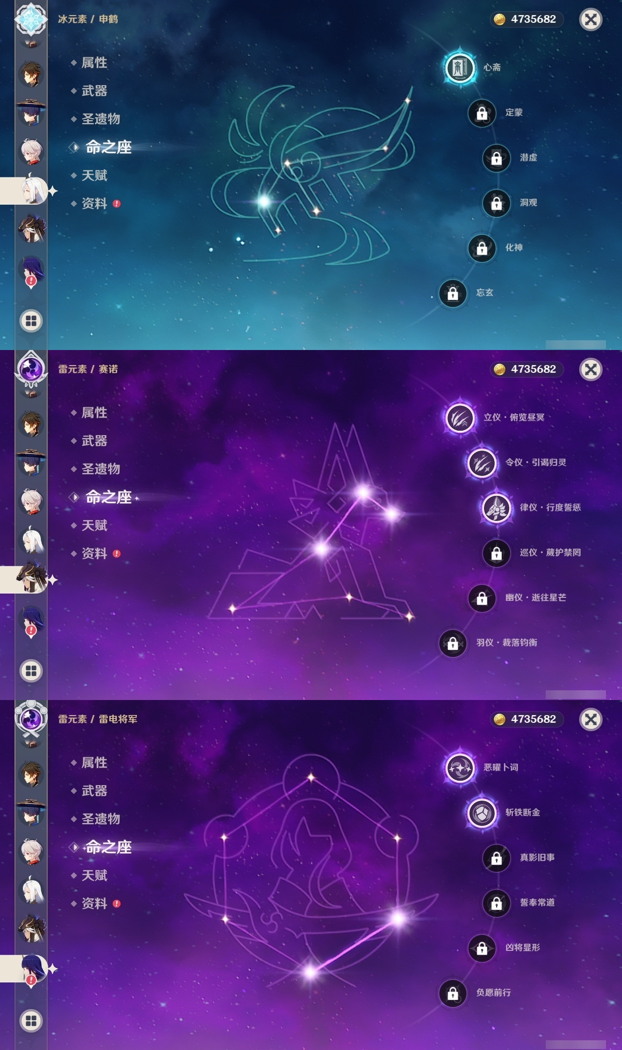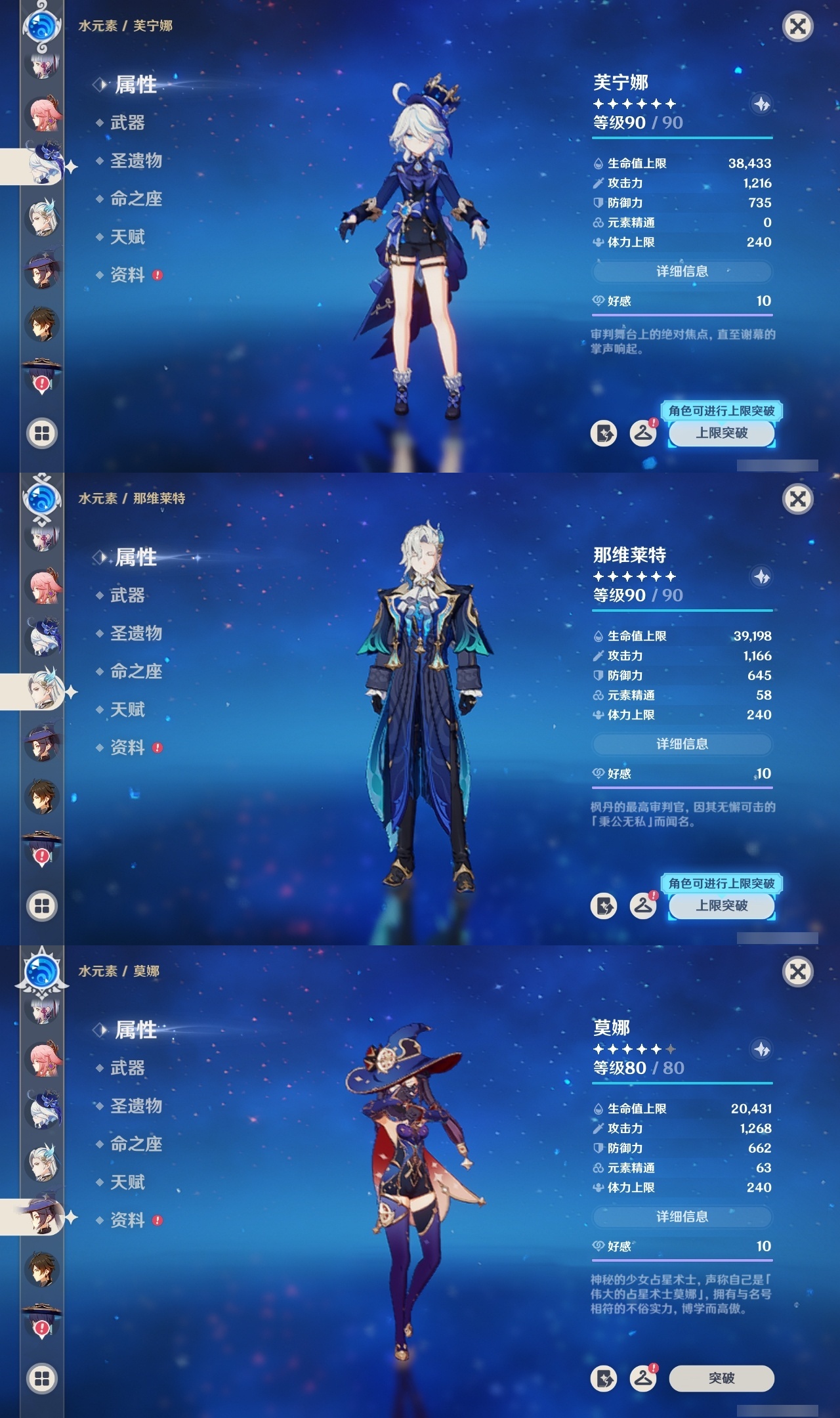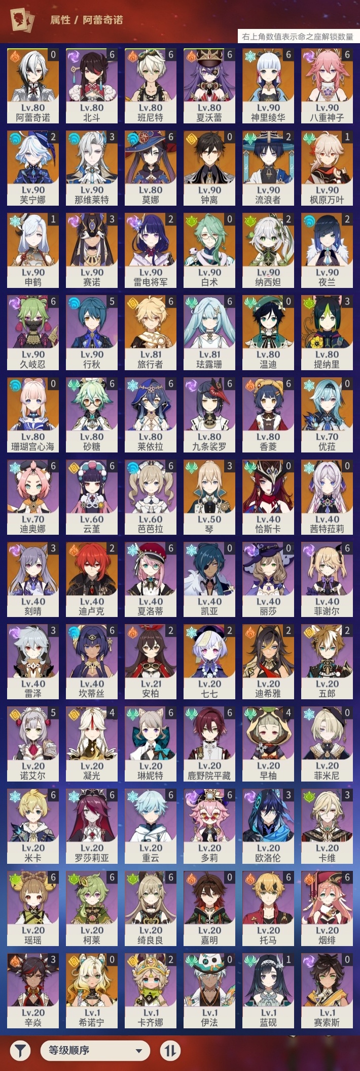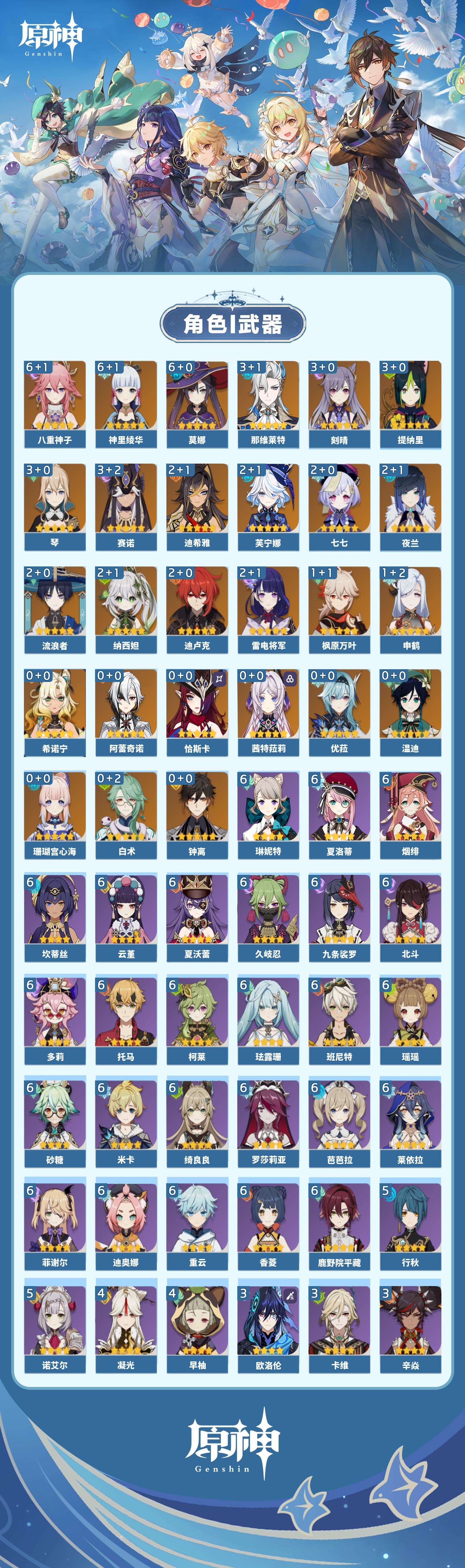 【原神】满命,冒险等级:59,五星数量:48,五星角色:莫娜 6命神里绫华 6命八重神子 6命那维莱特 3命刻晴 3命琴 3命提纳里 3命赛诺 3命迪希雅 2命芙宁娜 2命迪卢克 2命雷电将军 2命七七 2命夜兰 2命纳西妲 2命流浪者 2命枫原万叶 1命申鹤 1命珊瑚宫心海希诺宁白术温迪恰斯卡茜特菈莉优菈钟离阿蕾奇诺__五星武器:碧落之珑 2精息灾 2精赤沙之杖 2精苇海信标万世流涌大典静水流涌之辉苍古自由之誓和璞鸢护摩之杖四风原典天空之傲天空之脊天空之卷天空之刃天空之翼雾切之回光薙草之稻光神乐之真意波乱月白经津若水千夜浮梦__四星角色:班尼特 6命九条裟罗 6命香菱 6命久岐忍 6命鹿野院平藏 6命珐露珊 6命迪奥娜 6命砂糖 6命绮良良 6命瑶瑶 6命莱依拉 6命米卡 6命坎蒂丝 6命多莉 6命柯莱 6命芭芭拉 6命云堇 6命托马 6命烟绯 6命重云 6命罗莎莉亚 6命菲谢尔 6命北斗 6命琳妮特 6命夏洛蒂 6命夏沃蕾 6命行秋 5命诺艾尔 5命凝光 4命早柚 4命卡维 3命欧洛伦 3命辛焱 3命雷泽 3命卡齐娜 2命五郎 2命蓝砚 1命菲米尼嘉明伊法赛索斯