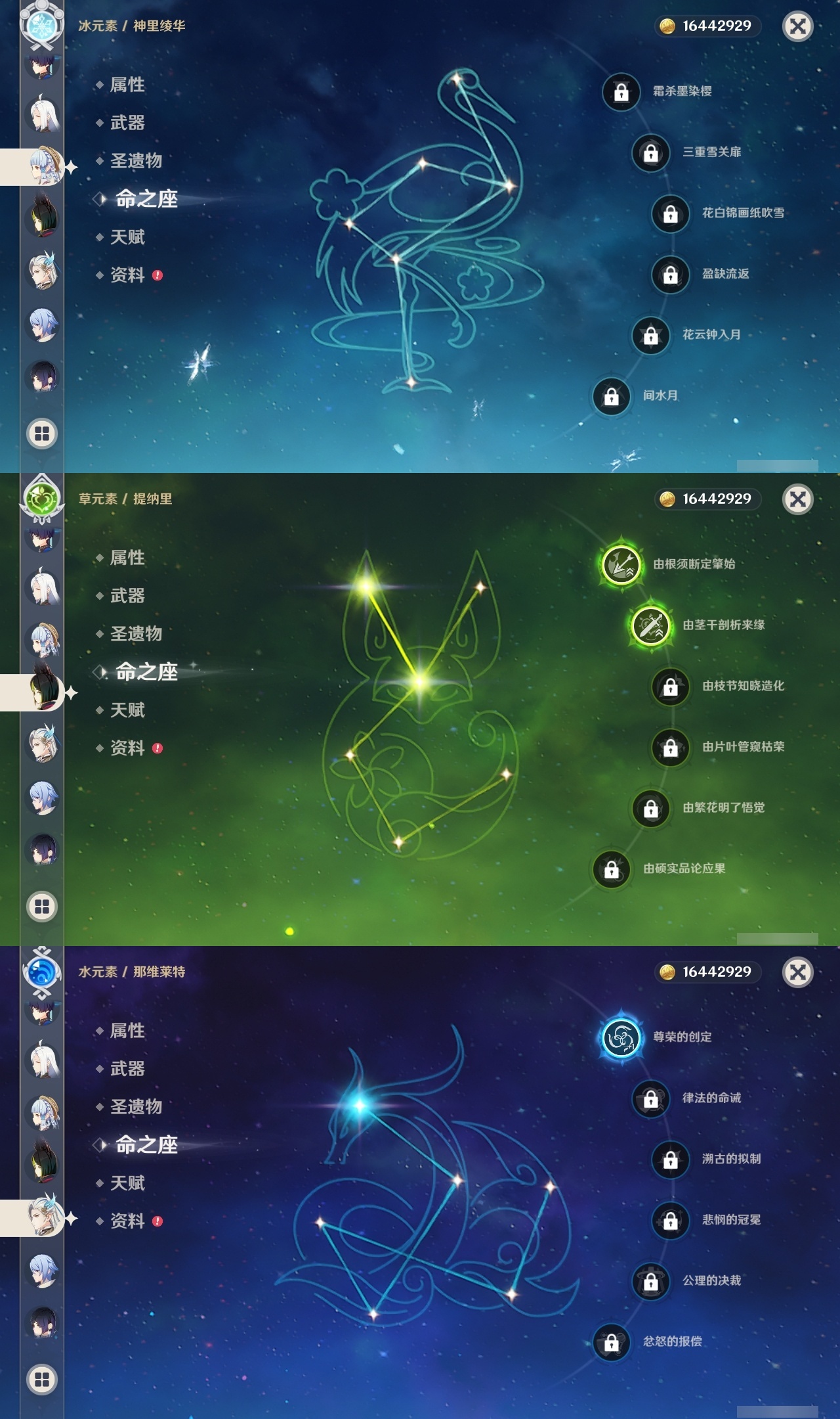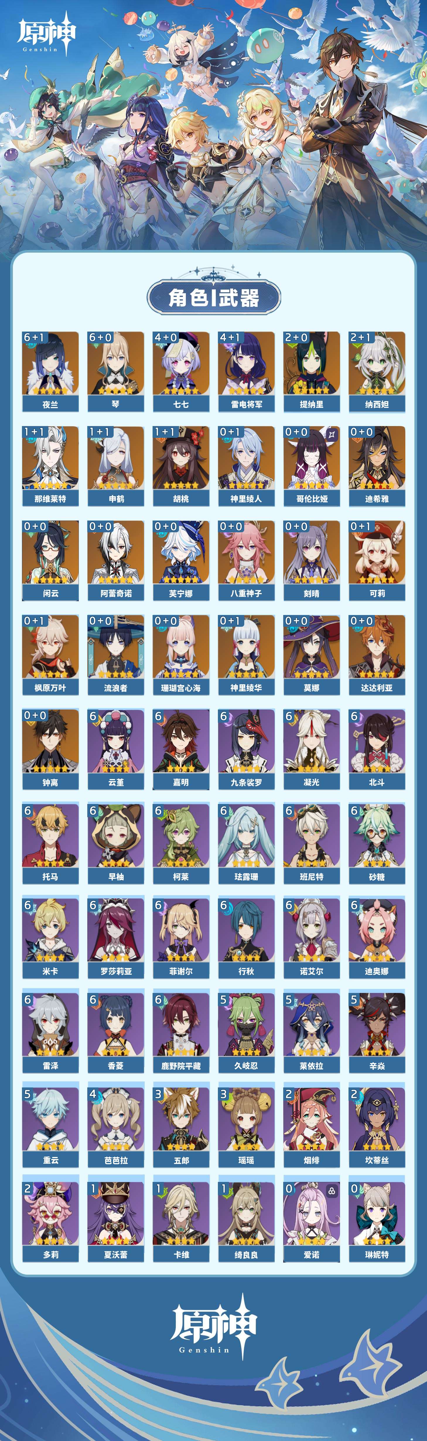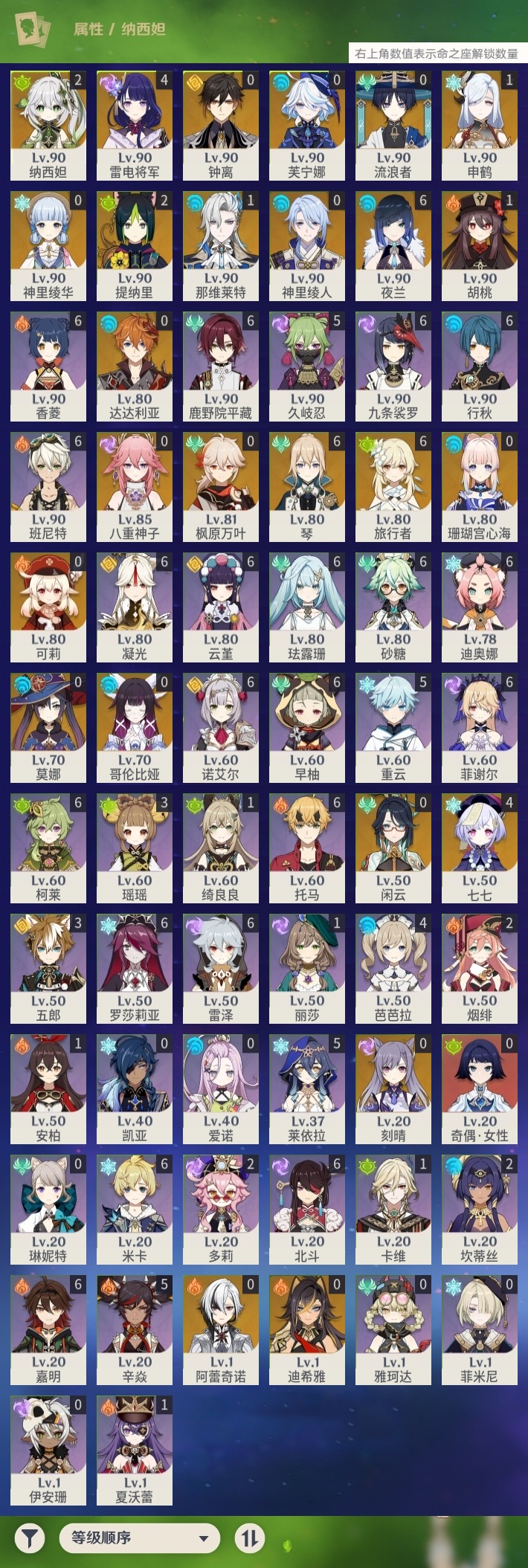 【原神】【lyys11079】冒险等级:60,五星数量:41,五星角色:琴 6命夜兰 6命雷电将军 4命七七 4命提纳里 2命纳西妲 2命那维莱特 1命胡桃 1命申鹤 1命莫娜珊瑚宫心海神里绫华迪希雅钟离达达利亚八重神子神里绫人芙宁娜闲云阿蕾奇诺流浪者哥伦比娅枫原万叶可莉刻晴__五星武器:天空之刃 2精万世流涌大典苍古自由之誓护摩之杖狼的末路四风原典天空之傲天空之翼雾切之回光薙草之稻光息灾波乱月白经津若水圣显之钥千夜浮梦__四星角色:班尼特 6命行秋 6命九条裟罗 6命香菱 6命鹿野院平藏 6命珐露珊 6命凝光 6命迪奥娜 6命砂糖 6命米卡 6命柯莱 6命云堇 6命早柚 6命托马 6命诺艾尔 6命罗莎莉亚 6命雷泽 6命菲谢尔 6命北斗 6命嘉明 6命久岐忍 5命莱依拉 5命重云 5命辛焱 5命芭芭拉 4命瑶瑶 3命五郎 3命坎蒂丝 2命多莉 2命烟绯 2命绮良良 1命卡维 1命夏沃蕾 1命奇偶·女性菲米尼琳妮特伊安珊爱诺