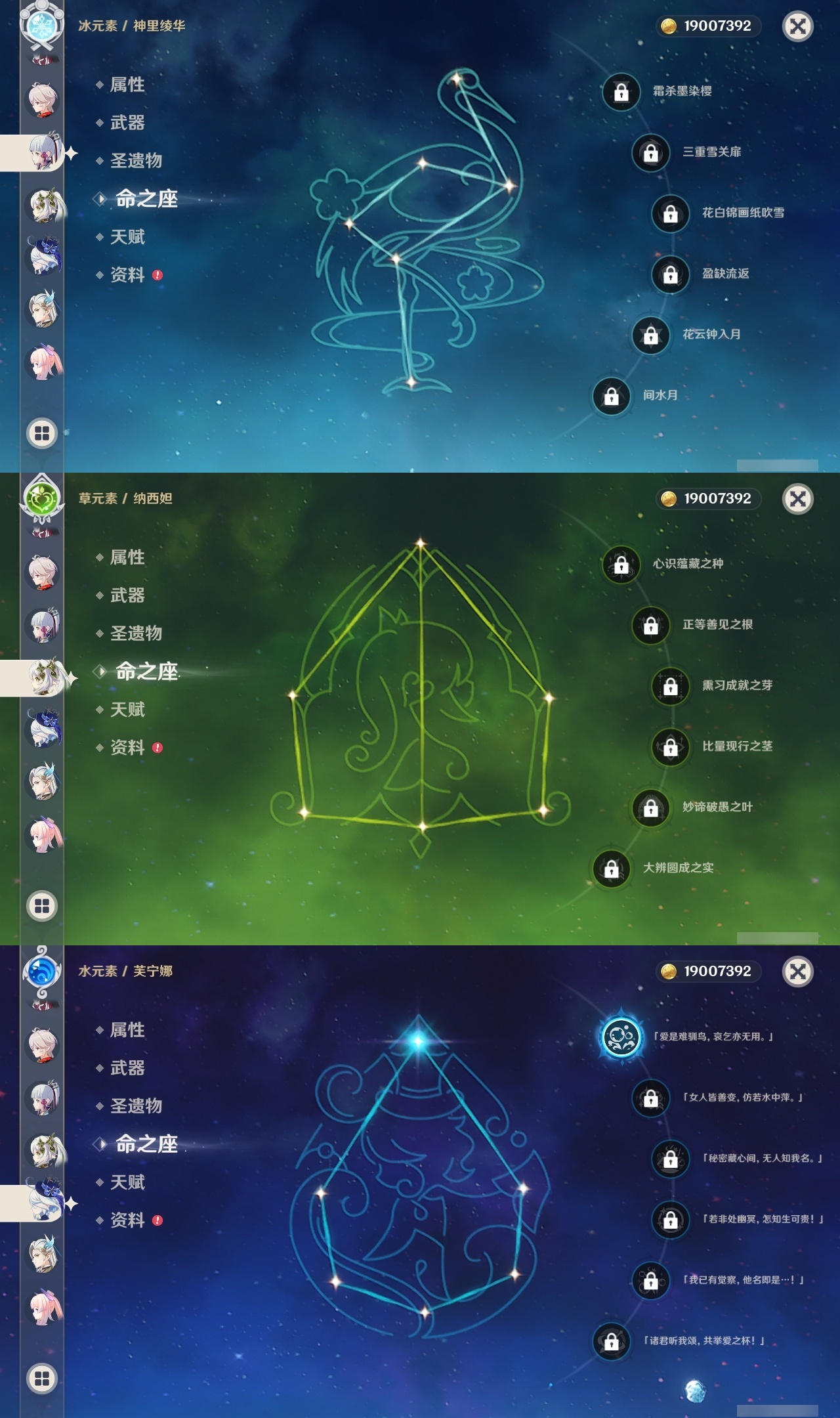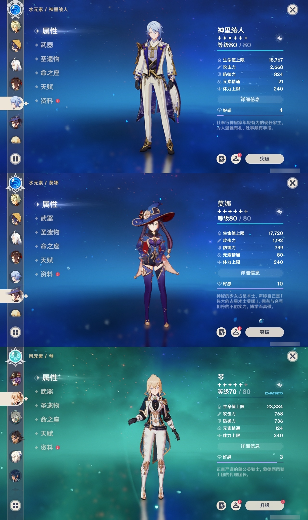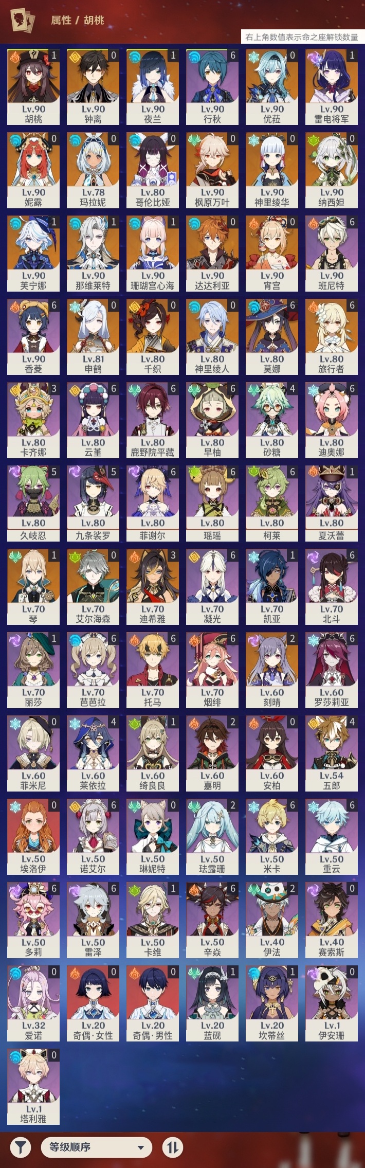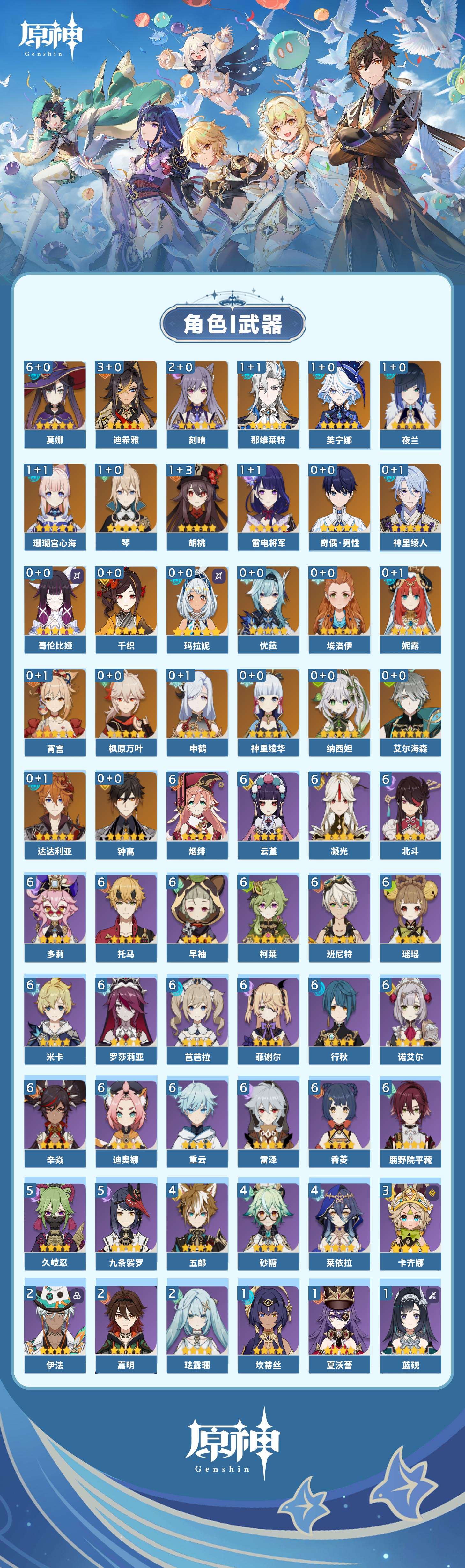 【原神】【lyys11075】冒险等级:60,五星数量:46,五星角色:莫娜 6命迪希雅 3命刻晴 2命那维莱特 1命芙宁娜 1命胡桃 1命雷电将军 1命琴 1命珊瑚宫心海 1命夜兰 1命玛拉妮神里绫华宵宫优菈钟离达达利亚申鹤神里绫人千织妮露纳西妲艾尔海森哥伦比娅枫原万叶__五星武器:护摩之杖 3精和璞鸢 2精星鹫赤羽万世流涌大典赤月之形不灭月华飞雷之弦振风鹰剑四风原典天空之脊天空之卷天空之刃天空之翼薙草之稻光终末嗟叹之诗冬极白星息灾波乱月白经津圣显之钥__四星角色:班尼特 6命行秋 6命香菱 6命鹿野院平藏 6命凝光 6命迪奥娜 6命瑶瑶 6命米卡 6命多莉 6命柯莱 6命芭芭拉 6命云堇 6命早柚 6命托马 6命烟绯 6命重云 6命辛焱 6命诺艾尔 6命罗莎莉亚 6命雷泽 6命菲谢尔 6命北斗 6命九条裟罗 5命久岐忍 5命砂糖 4命莱依拉 4命五郎 4命卡齐娜 3命珐露珊 2命嘉明 2命伊法 2命绮良良 1命坎蒂丝 1命卡维 1命蓝砚 1命夏沃蕾 1命埃洛伊奇偶·女性奇偶·男性菲米尼琳妮特伊安珊塔利雅爱诺赛索斯