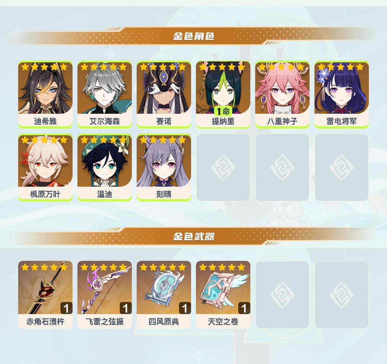 【ysyt710】56级/16黄/女主/9个五星角色/6个五星武器/0命雷电将军/0命枫原万叶/1命提纳里/0命温迪/0命艾尔海森/0命八重神子/0命赛诺/0命迪希雅/0命刻晴/精1飞雷之弦振/精1四风原典/精1赤角石溃杵/精1天空之卷