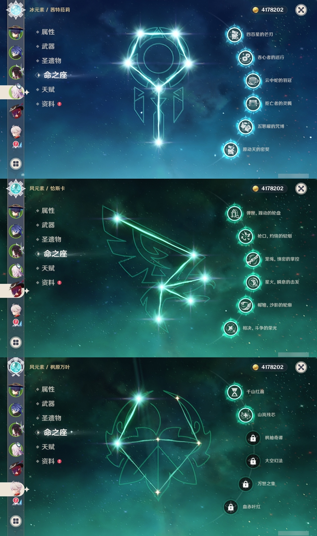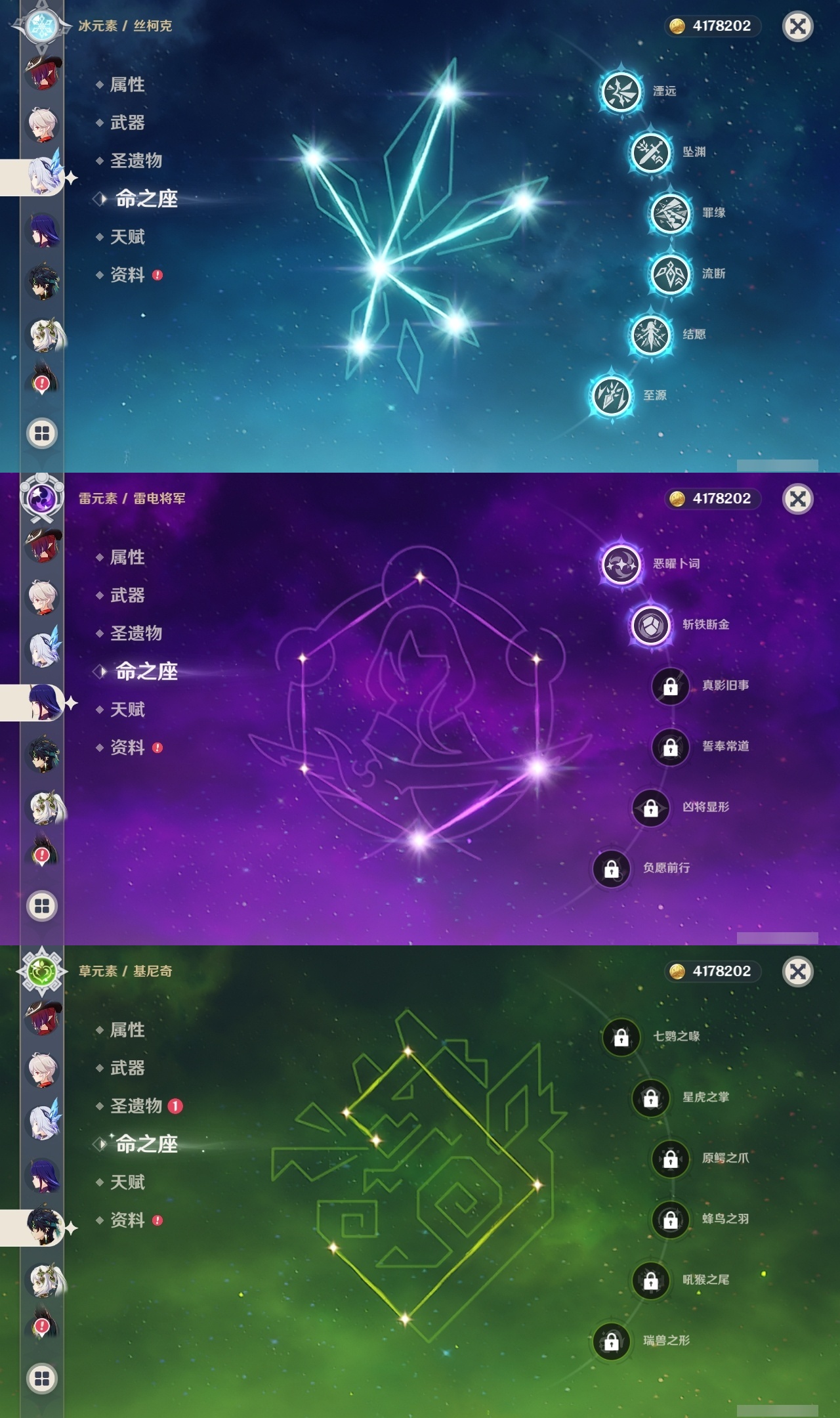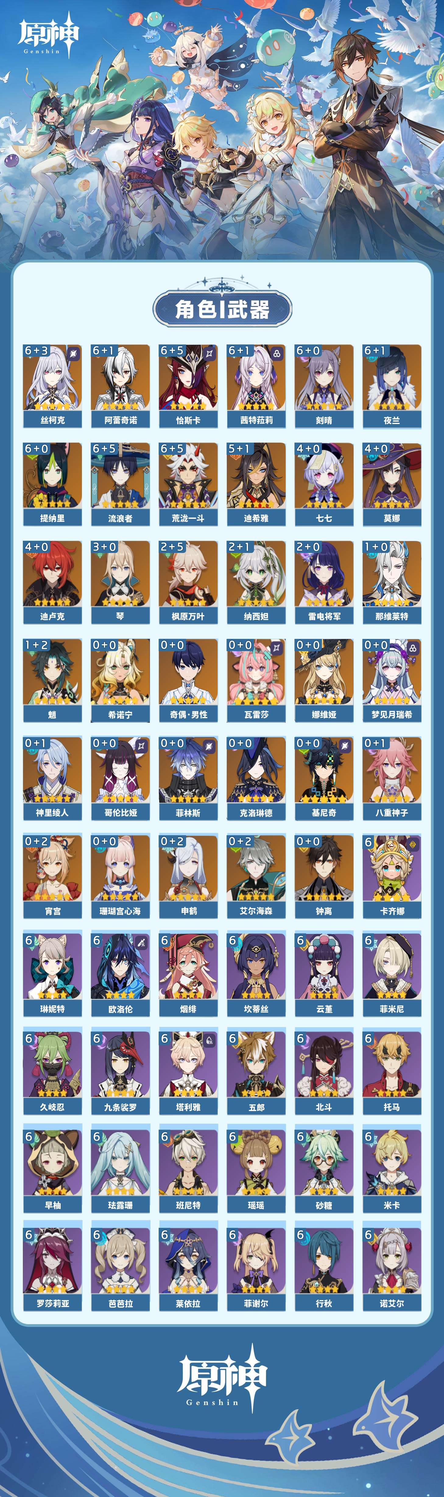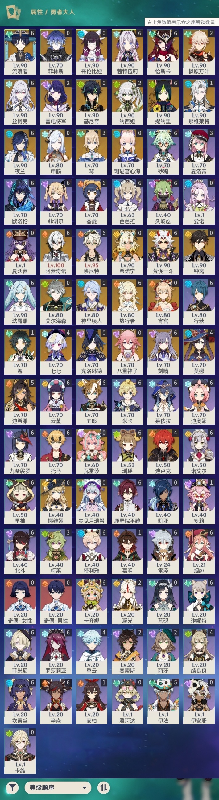 【原神】满命,冒险等级:60,五星数量:59,五星角色:恰斯卡 6命茜特菈莉 6命阿蕾奇诺 6命丝柯克 6命刻晴 6命荒泷一斗 6命夜兰 6命提纳里 6命流浪者 6命迪希雅 5命迪卢克 4命莫娜 4命七七 4命琴 3命枫原万叶 2命雷电将军 2命纳西妲 2命那维莱特 1命魈 1命基尼奇珊瑚宫心海希诺宁宵宫钟离梦见月瑞希申鹤瓦雷莎八重神子神里绫人娜维娅菲林斯艾尔海森哥伦比娅克洛琳德__五星武器:星鹫赤羽 5精苍古自由之誓 5精赤角石溃杵 5精图莱杜拉的回忆 5精最初的大魔术 3精苍耀 3精飞雷之弦振 2精和璞鸢 2精四风原典 2精天空之脊 2精天空之刃 2精息灾 2精裁叶萃光 2精祭星者之望焚曜千阳苇海信标赤月之形阿莫斯之弓天空之卷神乐之真意波乱月白经津若水千夜浮梦__四星角色:卡齐娜 6命班尼特 6命行秋 6命九条裟罗 6命香菱 6命久岐忍 6命鹿野院平藏 6命珐露珊 6命迪奥娜 6命砂糖 6命瑶瑶 6命莱依拉 6命米卡 6命坎蒂丝 6命芭芭拉 6命欧洛伦 6命云堇 6命早柚 6命托马 6命五郎 6命烟绯 6命辛焱 6命诺艾尔 6命罗莎莉亚 6命雷泽 6命菲谢尔 6命北斗 6命菲米尼 6命琳妮特 6命塔利雅 6命伊法 5命绮良良 4命重云 4命柯莱 3命夏洛蒂 3命凝光 2命赛索斯 2命多莉 1命嘉明 1命奇偶·女性奇偶·男性卡维蓝砚夏沃蕾伊安珊爱诺