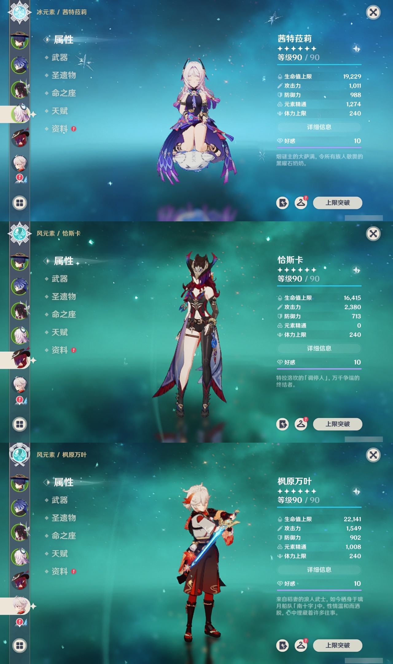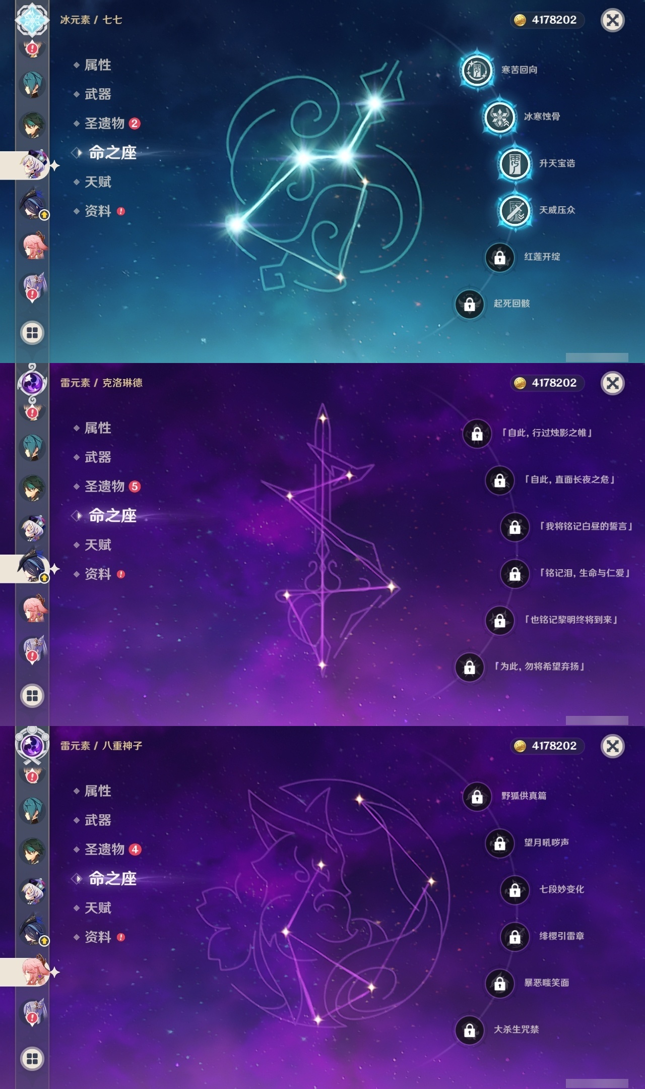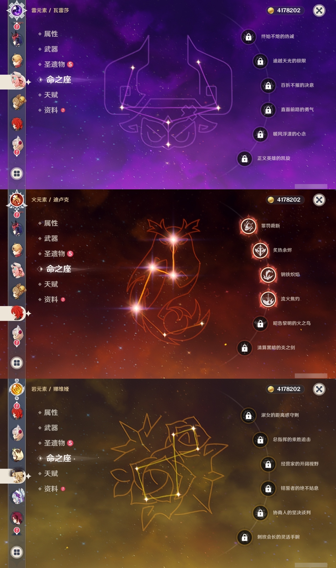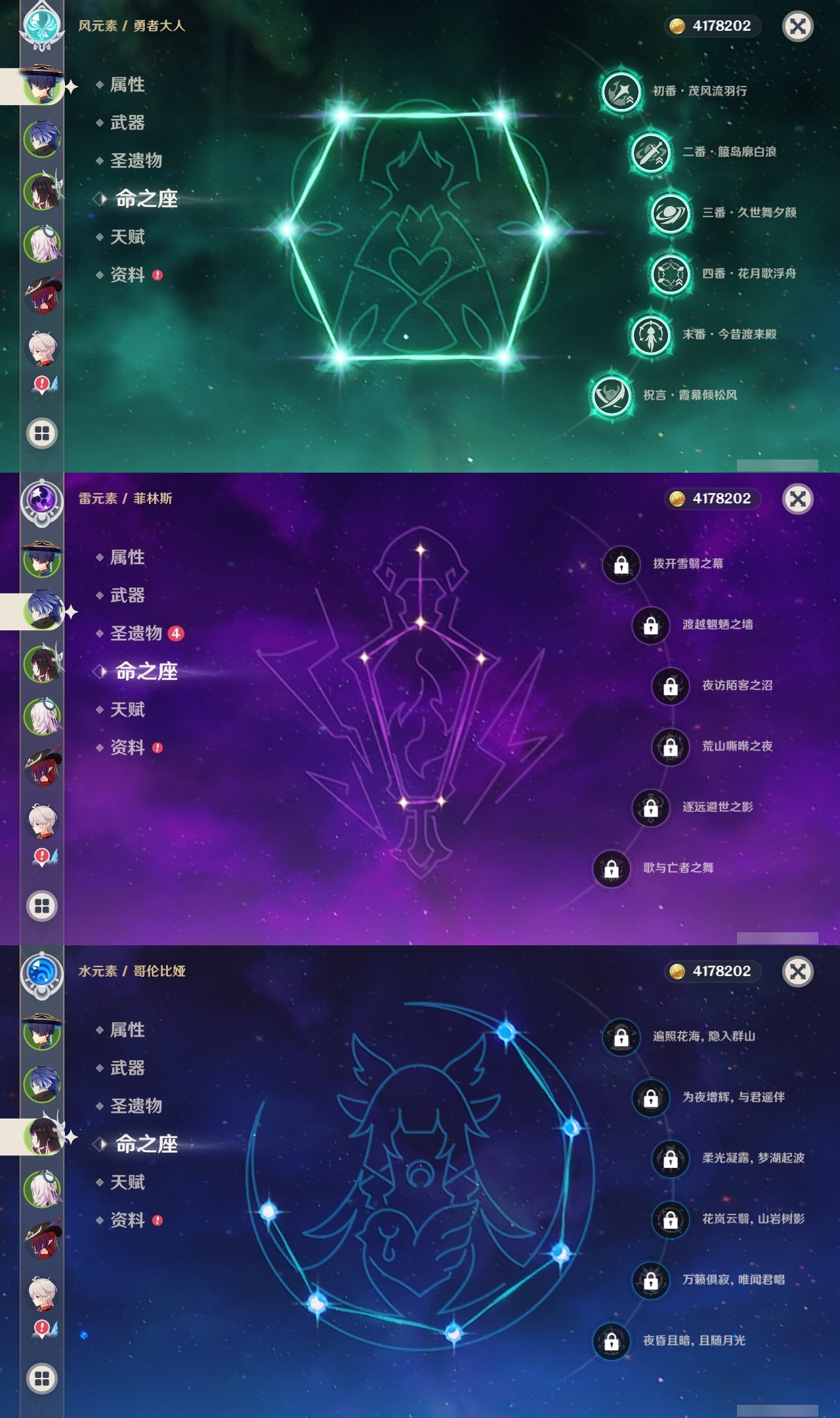 【原神】满命,冒险等级:60,五星数量:59,五星角色:恰斯卡 6命茜特菈莉 6命阿蕾奇诺 6命丝柯克 6命刻晴 6命荒泷一斗 6命夜兰 6命提纳里 6命流浪者 6命迪希雅 5命迪卢克 4命莫娜 4命七七 4命琴 3命枫原万叶 2命雷电将军 2命纳西妲 2命那维莱特 1命魈 1命基尼奇珊瑚宫心海希诺宁宵宫钟离梦见月瑞希申鹤瓦雷莎八重神子神里绫人娜维娅菲林斯艾尔海森哥伦比娅克洛琳德__五星武器:星鹫赤羽 5精苍古自由之誓 5精赤角石溃杵 5精图莱杜拉的回忆 5精最初的大魔术 3精苍耀 3精飞雷之弦振 2精和璞鸢 2精四风原典 2精天空之脊 2精天空之刃 2精息灾 2精裁叶萃光 2精祭星者之望焚曜千阳苇海信标赤月之形阿莫斯之弓天空之卷神乐之真意波乱月白经津若水千夜浮梦__四星角色:卡齐娜 6命班尼特 6命行秋 6命九条裟罗 6命香菱 6命久岐忍 6命鹿野院平藏 6命珐露珊 6命迪奥娜 6命砂糖 6命瑶瑶 6命莱依拉 6命米卡 6命坎蒂丝 6命芭芭拉 6命欧洛伦 6命云堇 6命早柚 6命托马 6命五郎 6命烟绯 6命辛焱 6命诺艾尔 6命罗莎莉亚 6命雷泽 6命菲谢尔 6命北斗 6命菲米尼 6命琳妮特 6命塔利雅 6命伊法 5命绮良良 4命重云 4命柯莱 3命夏洛蒂 3命凝光 2命赛索斯 2命多莉 1命嘉明 1命奇偶·女性奇偶·男性卡维蓝砚夏沃蕾伊安珊爱诺