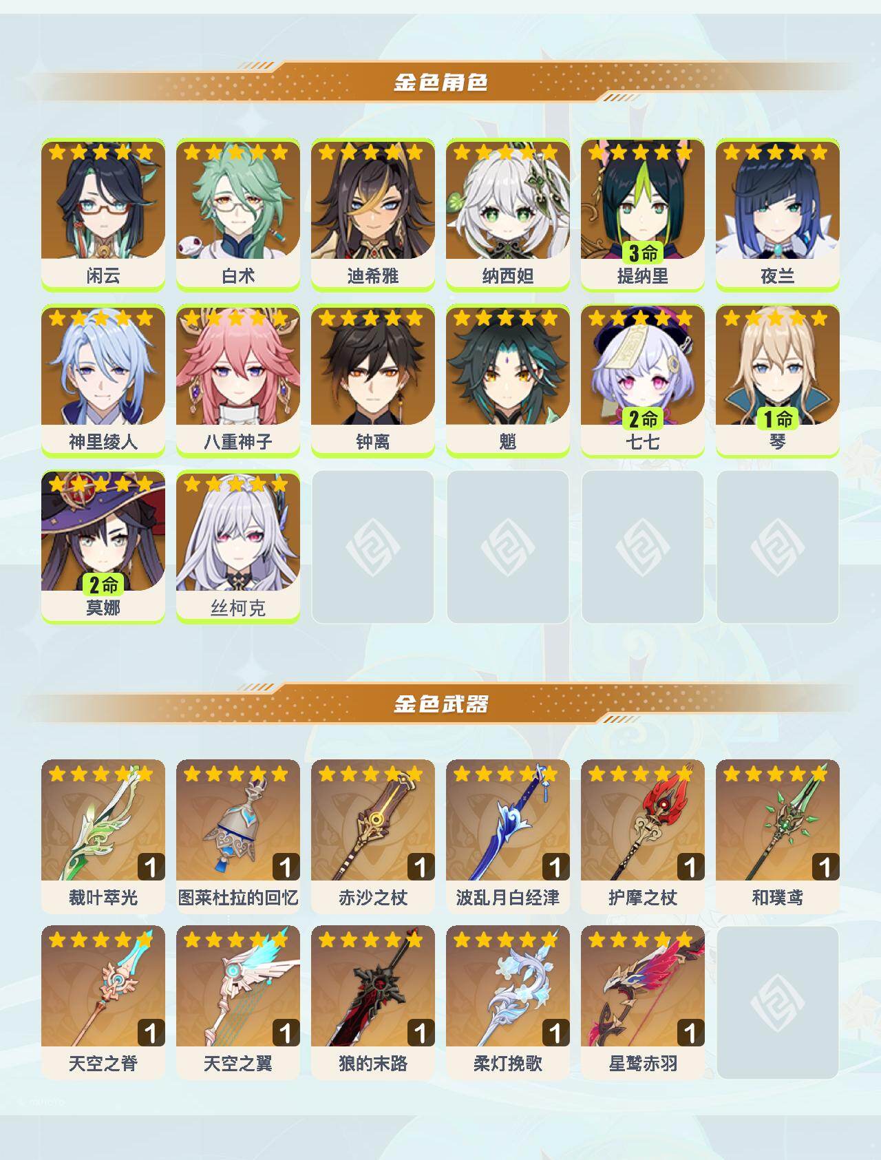 【ysyt704】58级/33黄/女主/14个五星角色/11个五星武器/0命纳西妲/0命白术/0命钟离/0命魈/3命提纳里/0命神里绫人/0命夜兰/0命八重神子/0命闲云/2命七七/1命琴/2命莫娜/0命丝柯克/0命迪希雅/精1天空之翼/精1图莱杜拉的回忆/精1赤沙之杖/精1和璞鸢/精1天空之脊/精1护摩之杖/精1裁叶萃光/精1波乱月白经津/精1狼的末路/精1星鹫赤羽/精1柔灯挽歌