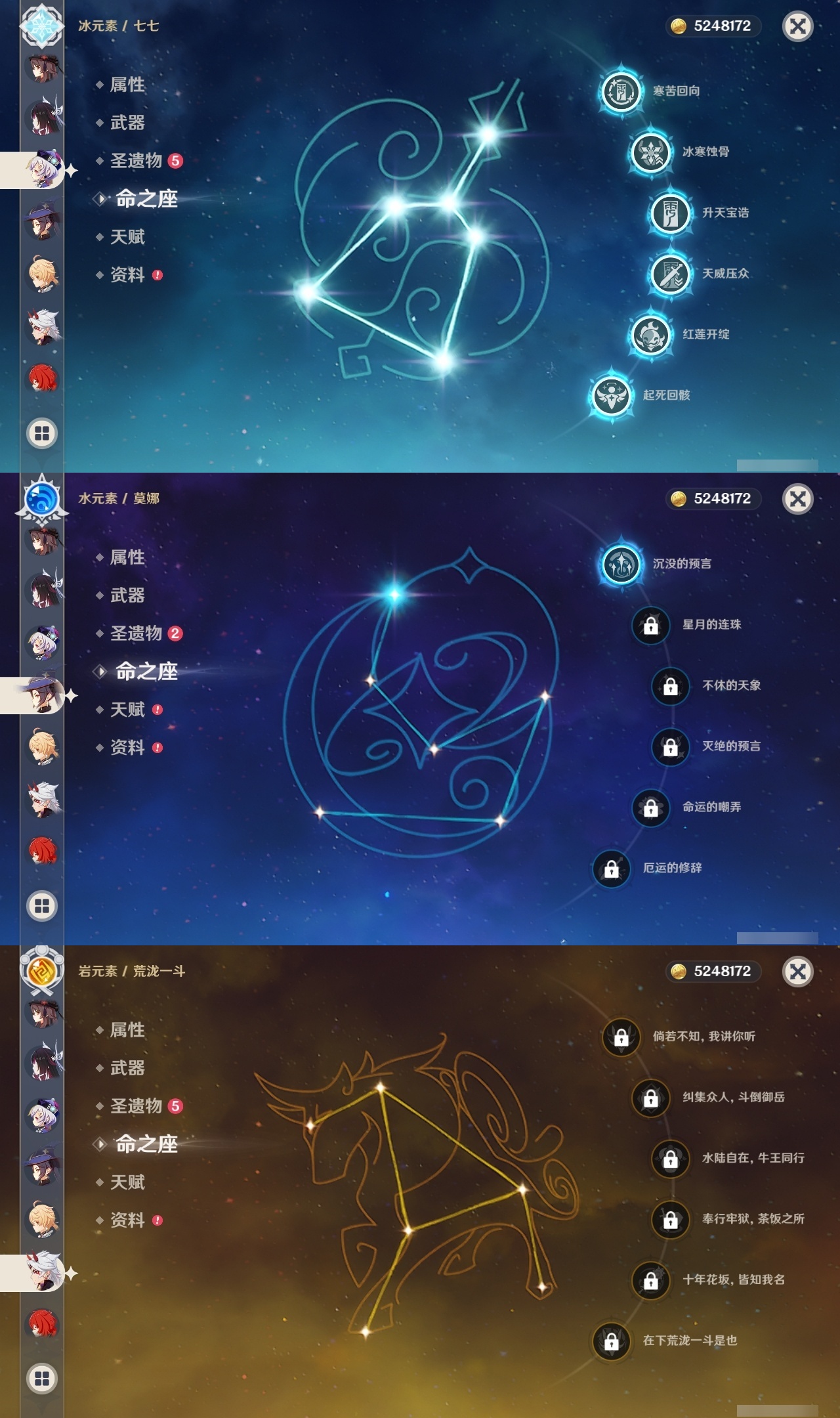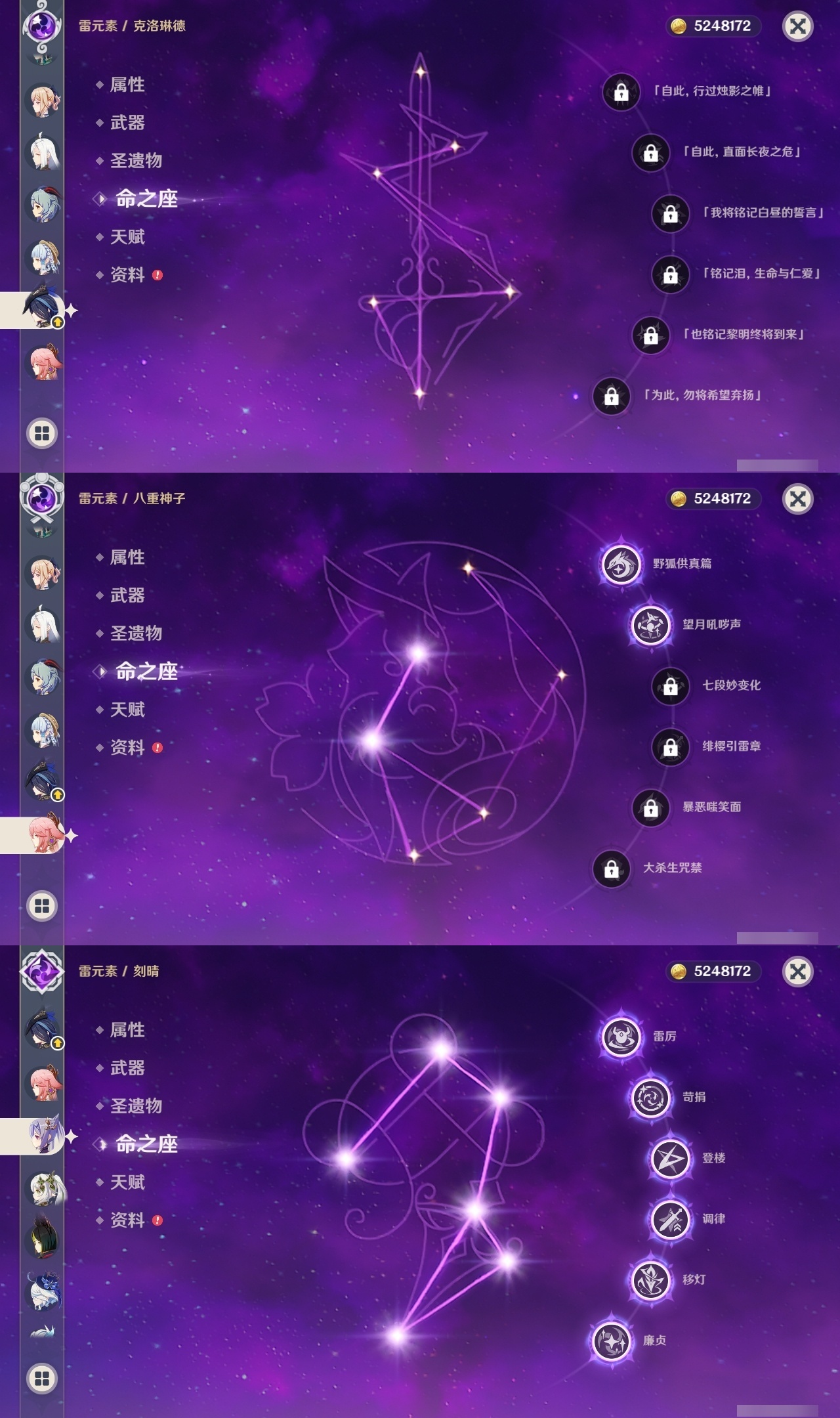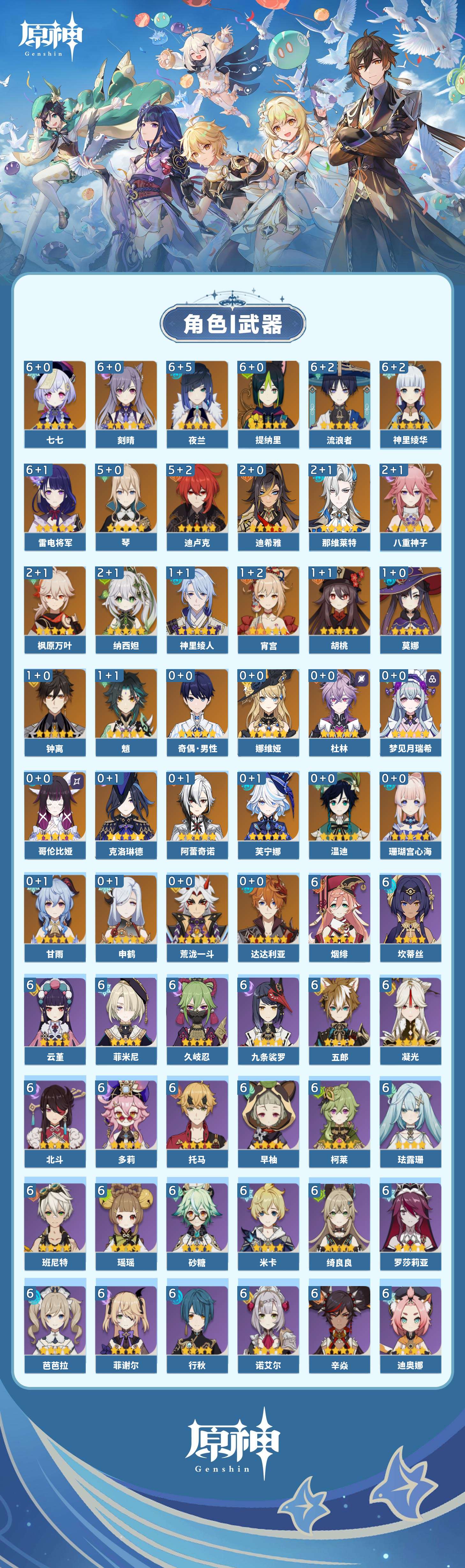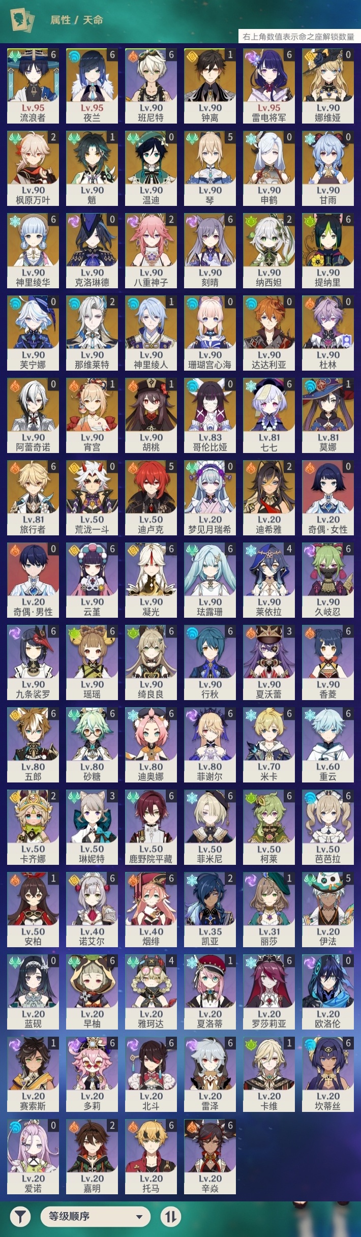 【原神】满命,冒险等级:60,五星数量:59,五星角色:刻晴 6命雷电将军 6命七七 6命神里绫华 6命夜兰 6命提纳里 6命流浪者 6命迪卢克 5命琴 5命迪希雅 2命那维莱特 2命枫原万叶 2命八重神子 2命纳西妲 2命魈 1命胡桃 1命莫娜 1命宵宫 1命钟离 1命神里绫人 1命珊瑚宫心海温迪荒泷一斗达达利亚梦见月瑞希申鹤芙宁娜娜维娅阿蕾奇诺杜林哥伦比娅甘雨克洛琳德__五星武器:若水 5精最初的大魔术 4精天空之翼 3精碧落之珑 2精飞雷之弦振 2精狼的末路 2精雾切之回光 2精图莱杜拉的回忆 2精万世流涌大典静水流涌之辉赤月之形阿莫斯之弓苍古自由之誓风鹰剑和璞鸢护摩之杖四风原典天空之傲薙草之稻光息灾神乐之真意波乱月白经津千夜浮梦赦罪__四星角色:班尼特 6命行秋 6命九条裟罗 6命香菱 6命久岐忍 6命鹿野院平藏 6命珐露珊 6命凝光 6命迪奥娜 6命砂糖 6命绮良良 6命瑶瑶 6命米卡 6命坎蒂丝 6命多莉 6命柯莱 6命芭芭拉 6命云堇 6命早柚 6命托马 6命五郎 6命烟绯 6命重云 6命辛焱 6命诺艾尔 6命罗莎莉亚 6命雷泽 6命菲谢尔 6命北斗 6命菲米尼 6命伊法 5命莱依拉 4命琳妮特 3命夏沃蕾 3命卡齐娜 2命嘉明 2命卡维 1命夏洛蒂 1命赛索斯 1命奇偶·女性奇偶·男性欧洛伦蓝砚爱诺