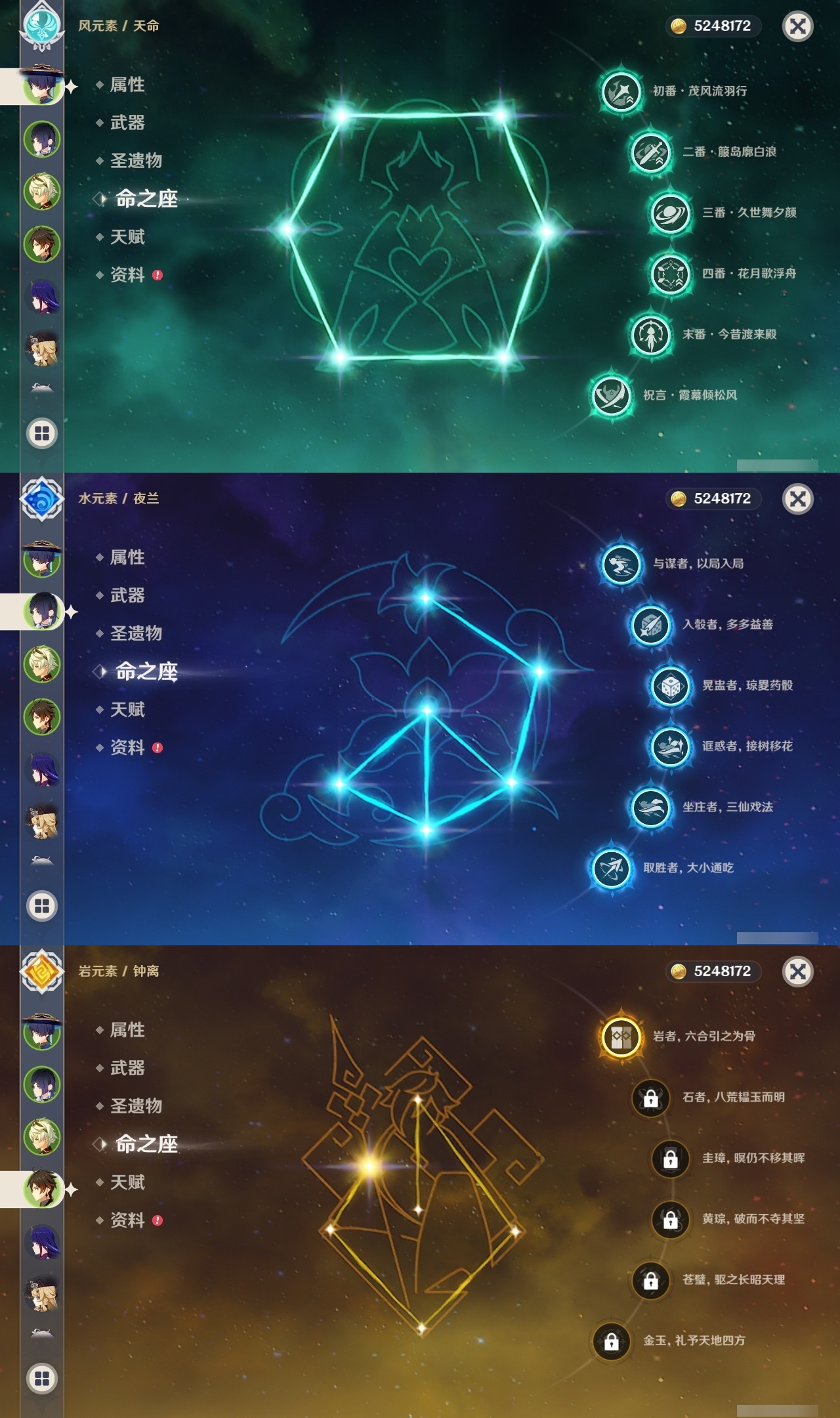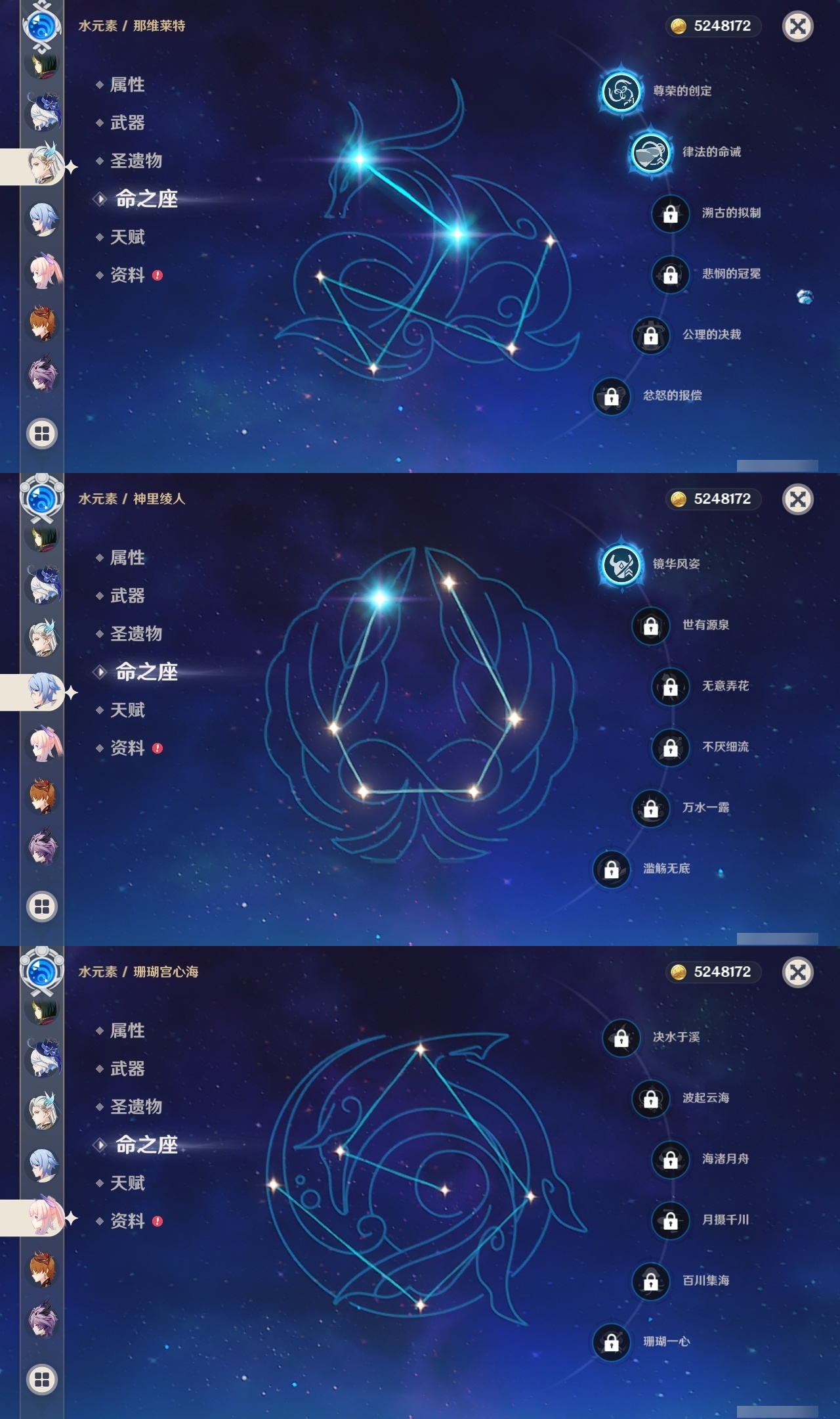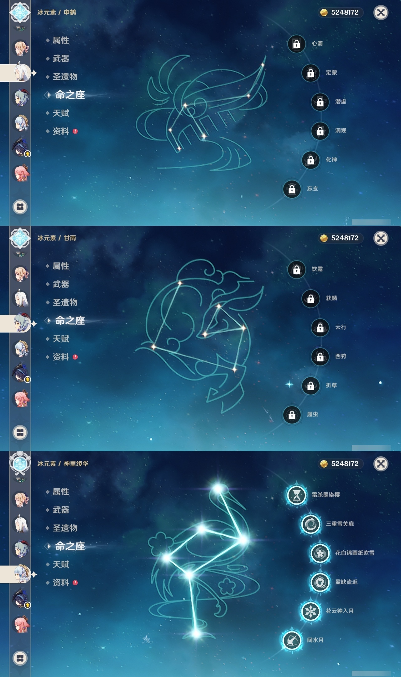 【原神】满命,冒险等级:60,五星数量:59,五星角色:刻晴 6命雷电将军 6命七七 6命神里绫华 6命夜兰 6命提纳里 6命流浪者 6命迪卢克 5命琴 5命迪希雅 2命那维莱特 2命枫原万叶 2命八重神子 2命纳西妲 2命魈 1命胡桃 1命莫娜 1命宵宫 1命钟离 1命神里绫人 1命珊瑚宫心海温迪荒泷一斗达达利亚梦见月瑞希申鹤芙宁娜娜维娅阿蕾奇诺杜林哥伦比娅甘雨克洛琳德__五星武器:若水 5精最初的大魔术 4精天空之翼 3精碧落之珑 2精飞雷之弦振 2精狼的末路 2精雾切之回光 2精图莱杜拉的回忆 2精万世流涌大典静水流涌之辉赤月之形阿莫斯之弓苍古自由之誓风鹰剑和璞鸢护摩之杖四风原典天空之傲薙草之稻光息灾神乐之真意波乱月白经津千夜浮梦赦罪__四星角色:班尼特 6命行秋 6命九条裟罗 6命香菱 6命久岐忍 6命鹿野院平藏 6命珐露珊 6命凝光 6命迪奥娜 6命砂糖 6命绮良良 6命瑶瑶 6命米卡 6命坎蒂丝 6命多莉 6命柯莱 6命芭芭拉 6命云堇 6命早柚 6命托马 6命五郎 6命烟绯 6命重云 6命辛焱 6命诺艾尔 6命罗莎莉亚 6命雷泽 6命菲谢尔 6命北斗 6命菲米尼 6命伊法 5命莱依拉 4命琳妮特 3命夏沃蕾 3命卡齐娜 2命嘉明 2命卡维 1命夏洛蒂 1命赛索斯 1命奇偶·女性奇偶·男性欧洛伦蓝砚爱诺