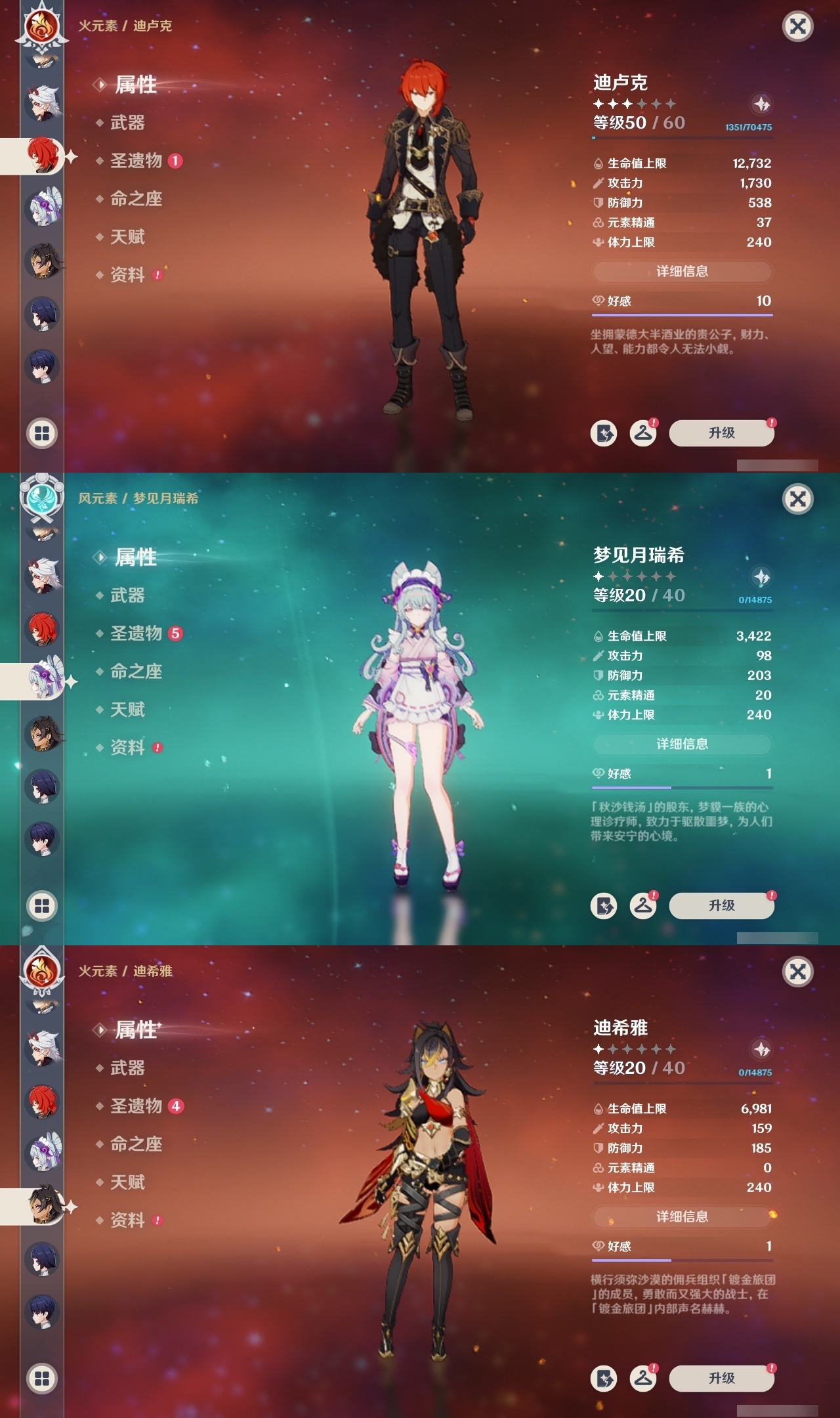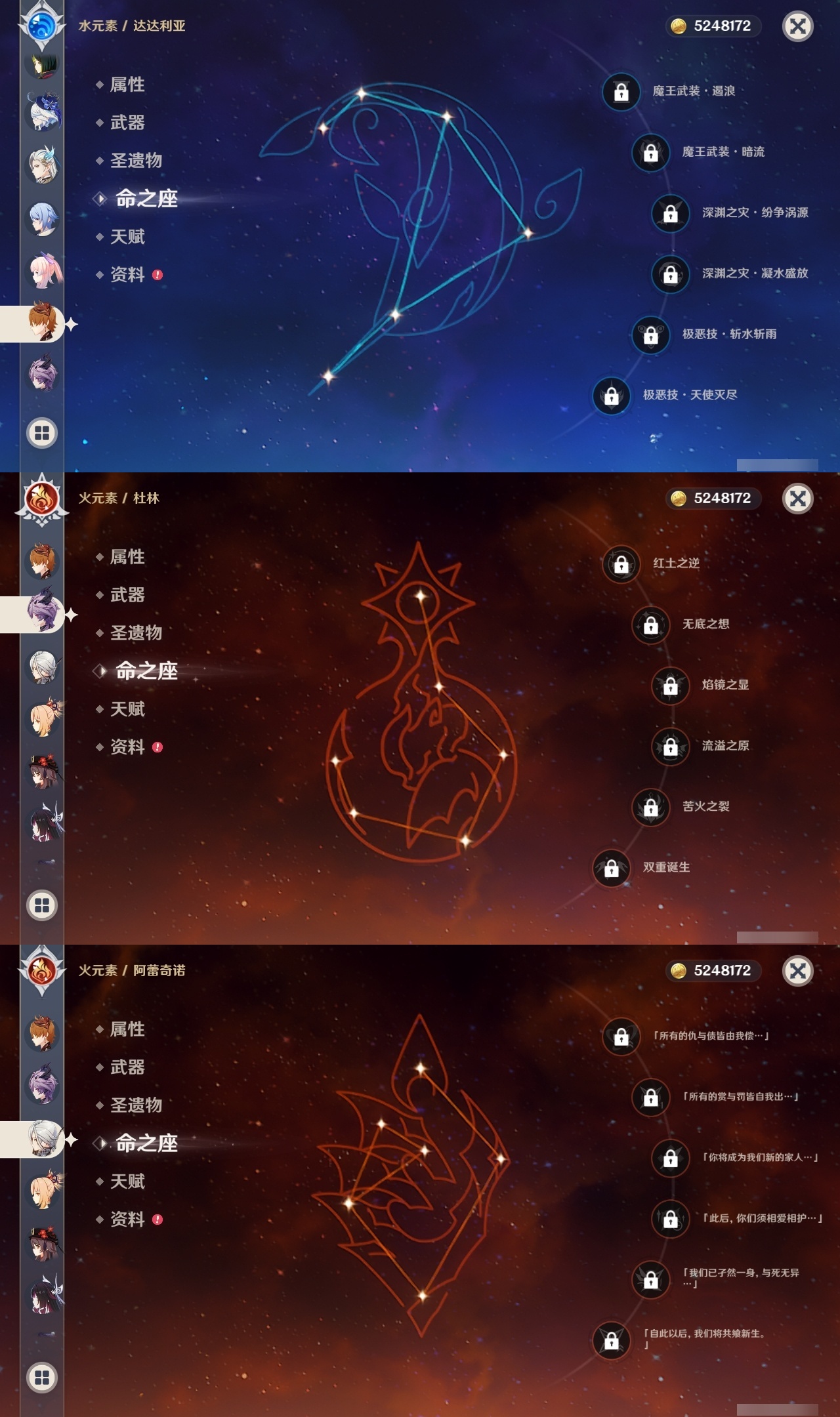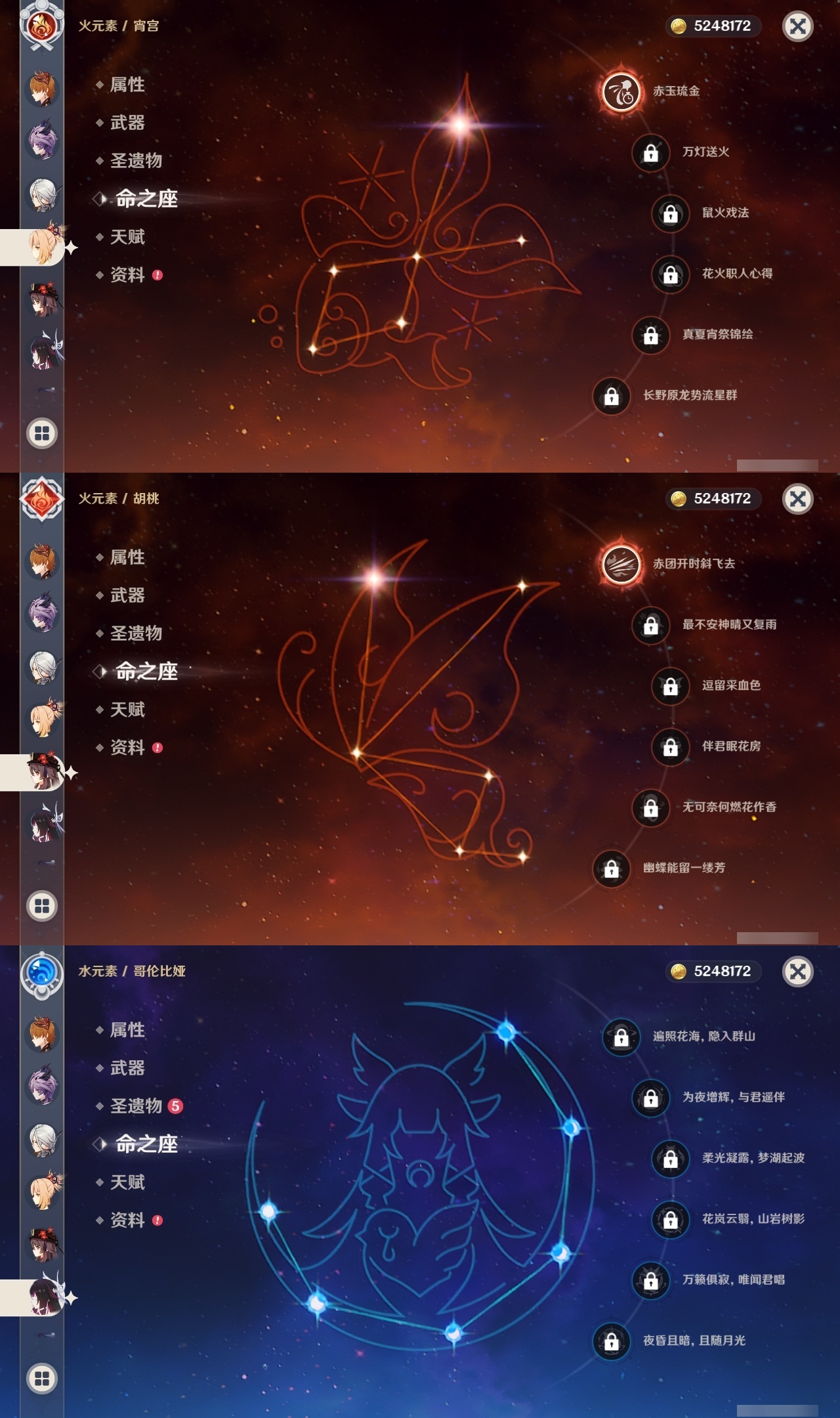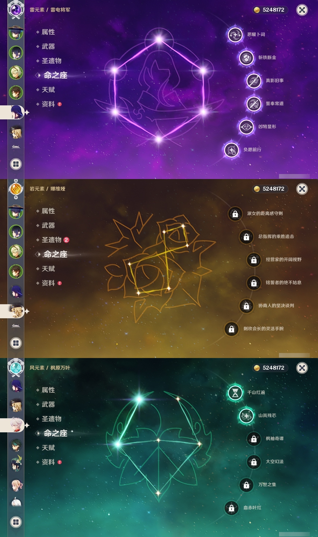 【原神】满命,冒险等级:60,五星数量:59,五星角色:刻晴 6命雷电将军 6命七七 6命神里绫华 6命夜兰 6命提纳里 6命流浪者 6命迪卢克 5命琴 5命迪希雅 2命那维莱特 2命枫原万叶 2命八重神子 2命纳西妲 2命魈 1命胡桃 1命莫娜 1命宵宫 1命钟离 1命神里绫人 1命珊瑚宫心海温迪荒泷一斗达达利亚梦见月瑞希申鹤芙宁娜娜维娅阿蕾奇诺杜林哥伦比娅甘雨克洛琳德__五星武器:若水 5精最初的大魔术 4精天空之翼 3精碧落之珑 2精飞雷之弦振 2精狼的末路 2精雾切之回光 2精图莱杜拉的回忆 2精万世流涌大典静水流涌之辉赤月之形阿莫斯之弓苍古自由之誓风鹰剑和璞鸢护摩之杖四风原典天空之傲薙草之稻光息灾神乐之真意波乱月白经津千夜浮梦赦罪__四星角色:班尼特 6命行秋 6命九条裟罗 6命香菱 6命久岐忍 6命鹿野院平藏 6命珐露珊 6命凝光 6命迪奥娜 6命砂糖 6命绮良良 6命瑶瑶 6命米卡 6命坎蒂丝 6命多莉 6命柯莱 6命芭芭拉 6命云堇 6命早柚 6命托马 6命五郎 6命烟绯 6命重云 6命辛焱 6命诺艾尔 6命罗莎莉亚 6命雷泽 6命菲谢尔 6命北斗 6命菲米尼 6命伊法 5命莱依拉 4命琳妮特 3命夏沃蕾 3命卡齐娜 2命嘉明 2命卡维 1命夏洛蒂 1命赛索斯 1命奇偶·女性奇偶·男性欧洛伦蓝砚爱诺