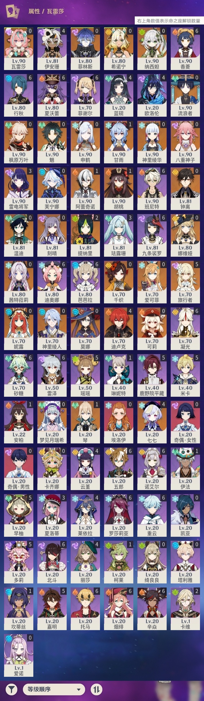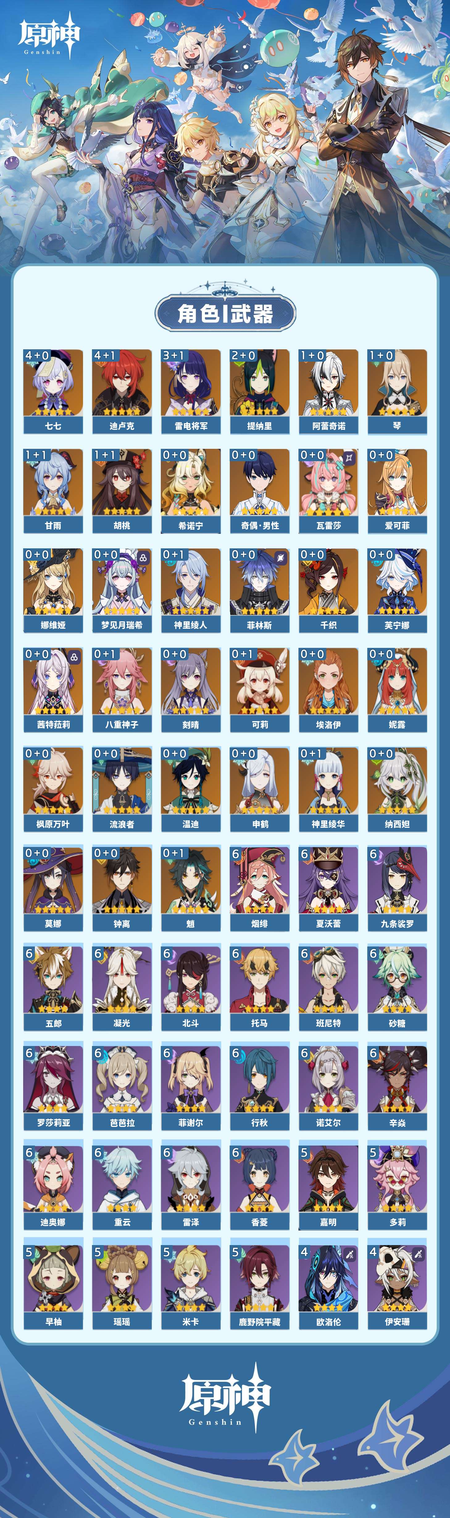 【原神】【lyys11134】冒险等级:60,五星数量:50,五星角色:迪卢克 4命七七 4命雷电将军 3命提纳里 2命阿蕾奇诺 1命甘雨 1命胡桃 1命琴 1命莫娜希诺宁神里绫华温迪茜特菈莉钟离梦见月瑞希申鹤瓦雷莎八重神子神里绫人芙宁娜娜维娅千织爱可菲妮露纳西妲菲林斯流浪者枫原万叶魈可莉刻晴__五星武器:裁叶萃光阿莫斯之弓不灭月华风鹰剑和璞鸢护摩之杖狼的末路磐岩结绿四风原典天空之脊天空之刃天空之翼雾切之回光薙草之稻光神乐之真意波乱月白经津__四星角色:班尼特 6命行秋 6命九条裟罗 6命香菱 6命凝光 6命迪奥娜 6命砂糖 6命芭芭拉 6命托马 6命五郎 6命烟绯 6命重云 6命辛焱 6命诺艾尔 6命罗莎莉亚 6命雷泽 6命菲谢尔 6命北斗 6命夏沃蕾 6命鹿野院平藏 5命瑶瑶 5命米卡 5命多莉 5命早柚 5命嘉明 5命莱依拉 4命欧洛伦 4命云堇 4命蓝砚 4命伊安珊 4命珐露珊 3命夏洛蒂 3命卡维 2命坎蒂丝 1命柯莱 1命琳妮特 1命伊法 1命埃洛伊奇偶·女性奇偶·男性卡齐娜绮良良塔利雅爱诺