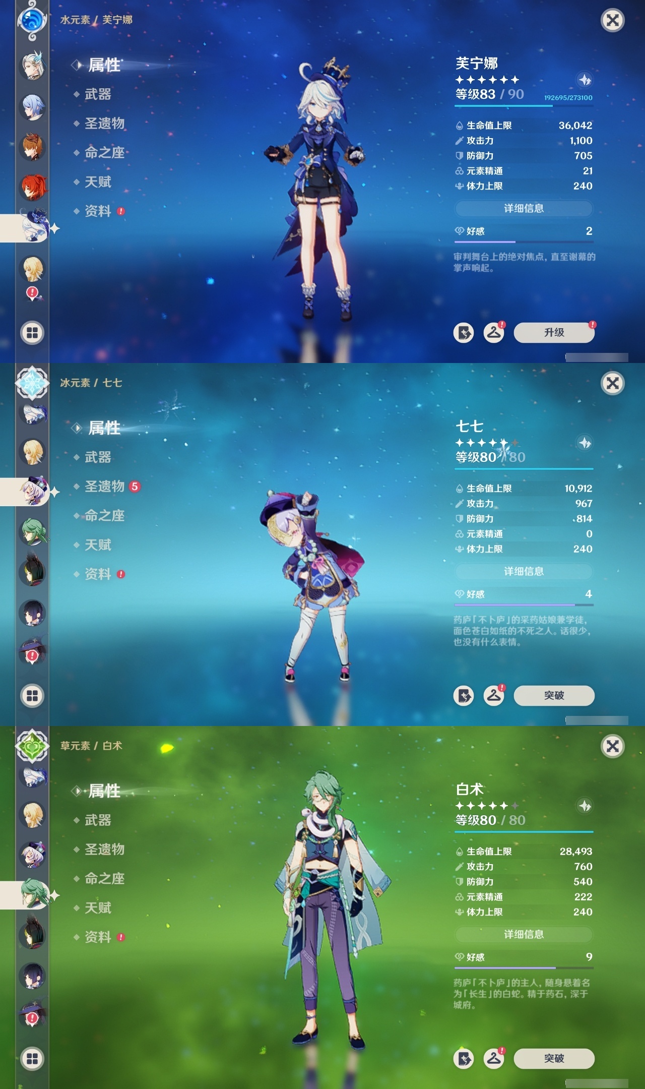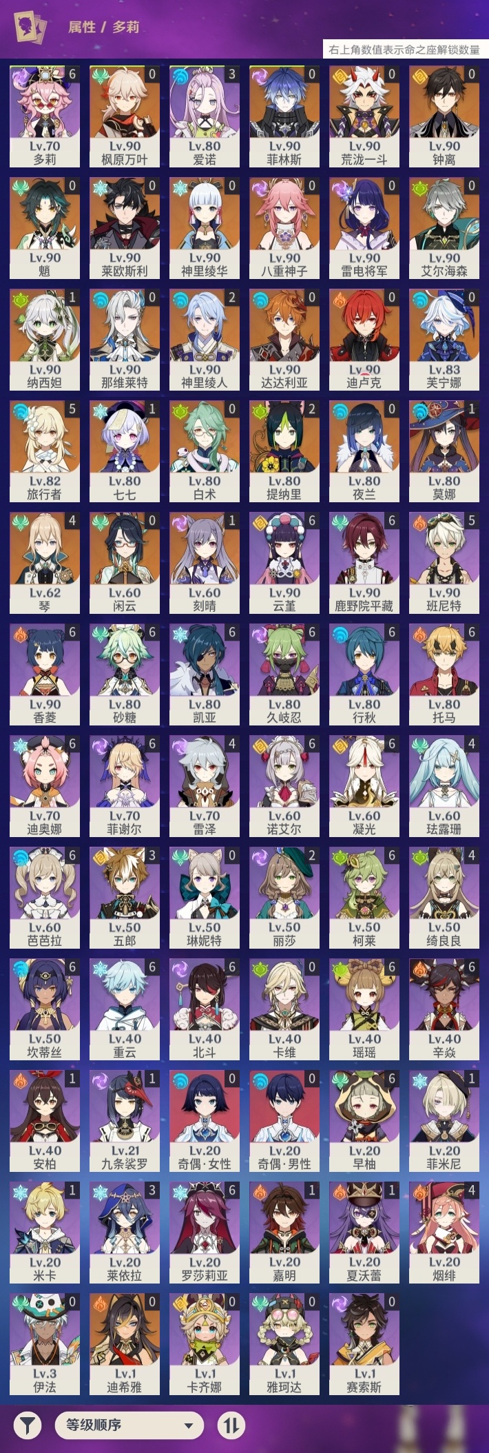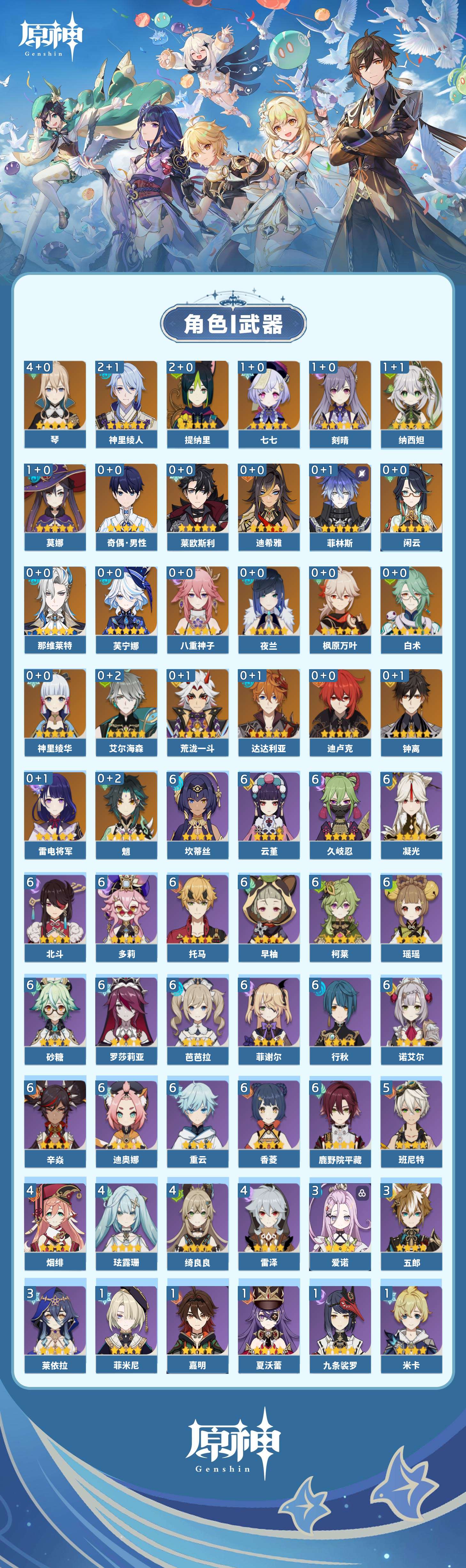 【原神】【lyys11128】冒险等级:60,五星数量:43,五星角色:琴 4命神里绫人 2命提纳里 2命刻晴 1命莫娜 1命七七 1命纳西妲 1命白术神里绫华迪希雅钟离荒泷一斗达达利亚八重神子那维莱特莱欧斯利夜兰芙宁娜闲云菲林斯艾尔海森迪卢克枫原万叶魈雷电将军__五星武器:和璞鸢 2精天空之翼 2精裁叶萃光 2精血染荒城飞雷之弦振风鹰剑护摩之杖天空之脊天空之卷薙草之稻光赤角石溃杵冬极白星贯虹之槊波乱月白经津赤沙之杖千夜浮梦__四星角色:行秋 6命香菱 6命久岐忍 6命鹿野院平藏 6命凝光 6命迪奥娜 6命砂糖 6命瑶瑶 6命坎蒂丝 6命多莉 6命柯莱 6命芭芭拉 6命云堇 6命早柚 6命托马 6命重云 6命辛焱 6命诺艾尔 6命罗莎莉亚 6命菲谢尔 6命北斗 6命班尼特 5命珐露珊 4命绮良良 4命烟绯 4命雷泽 4命莱依拉 3命五郎 3命爱诺 3命九条裟罗 1命米卡 1命菲米尼 1命夏沃蕾 1命嘉明 1命奇偶·女性奇偶·男性卡齐娜卡维琳妮特伊法赛索斯