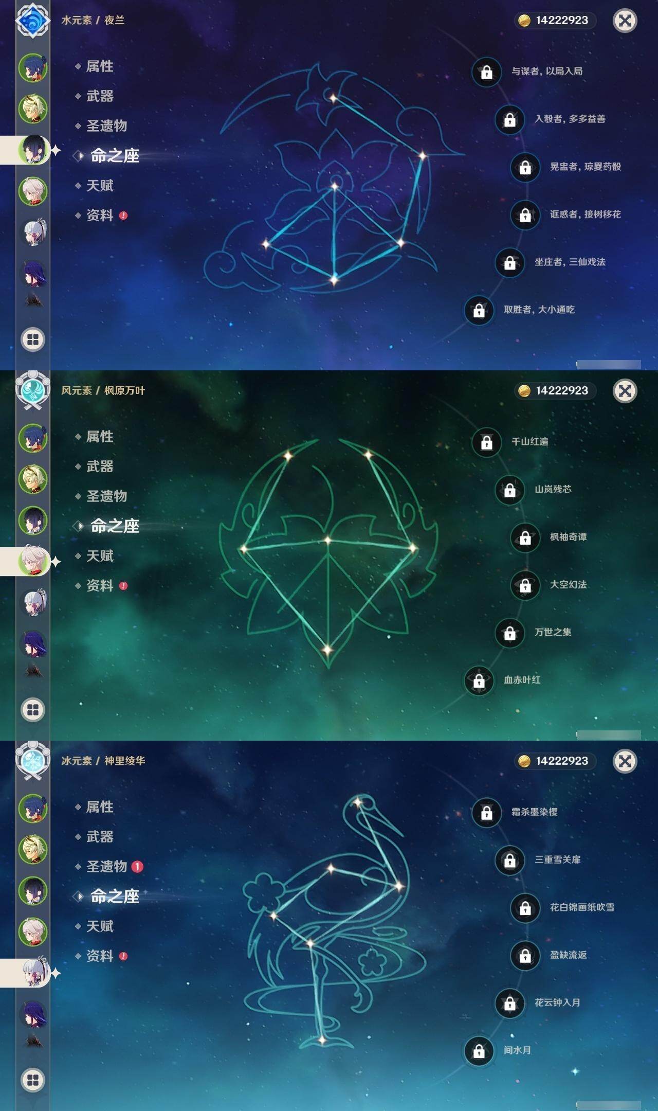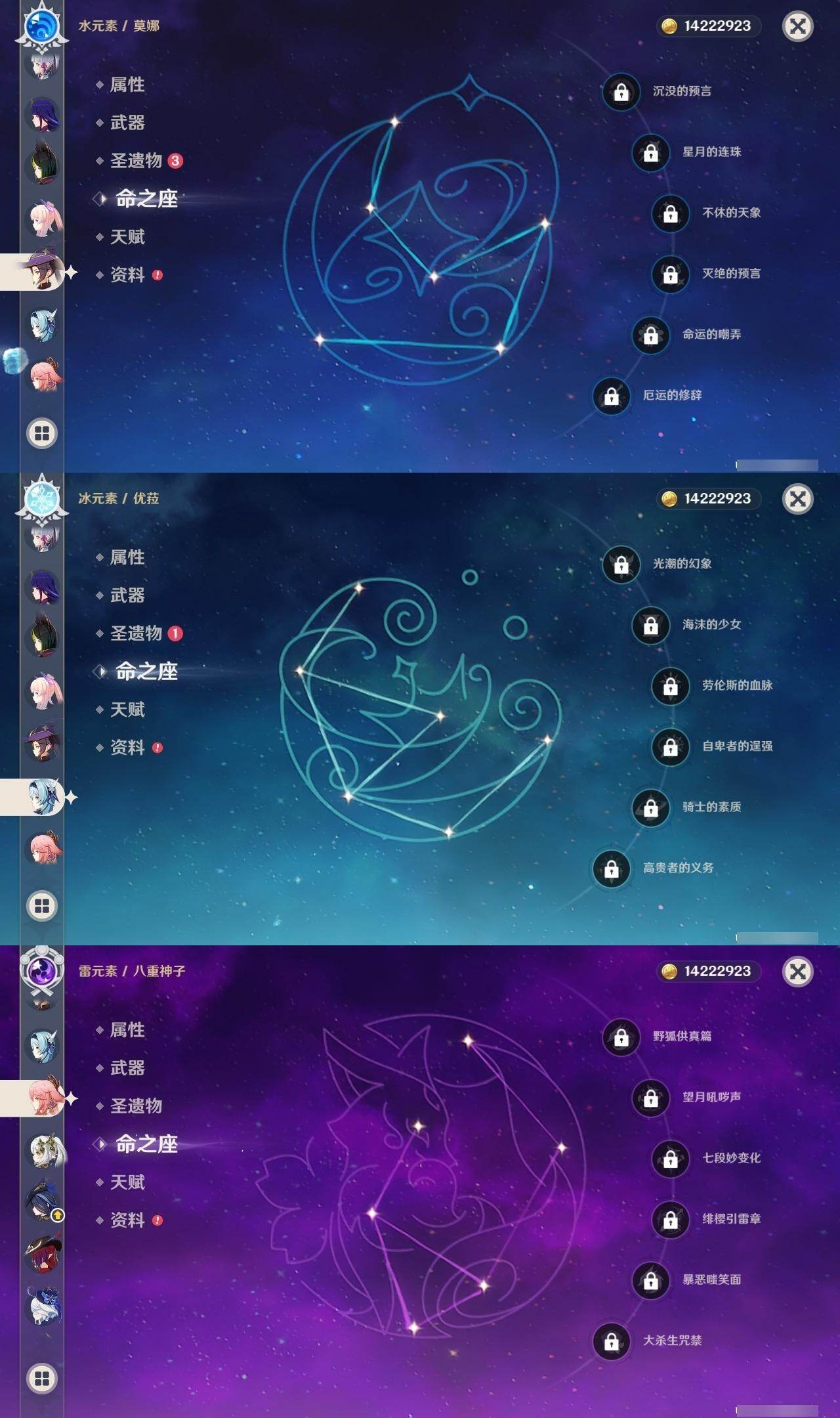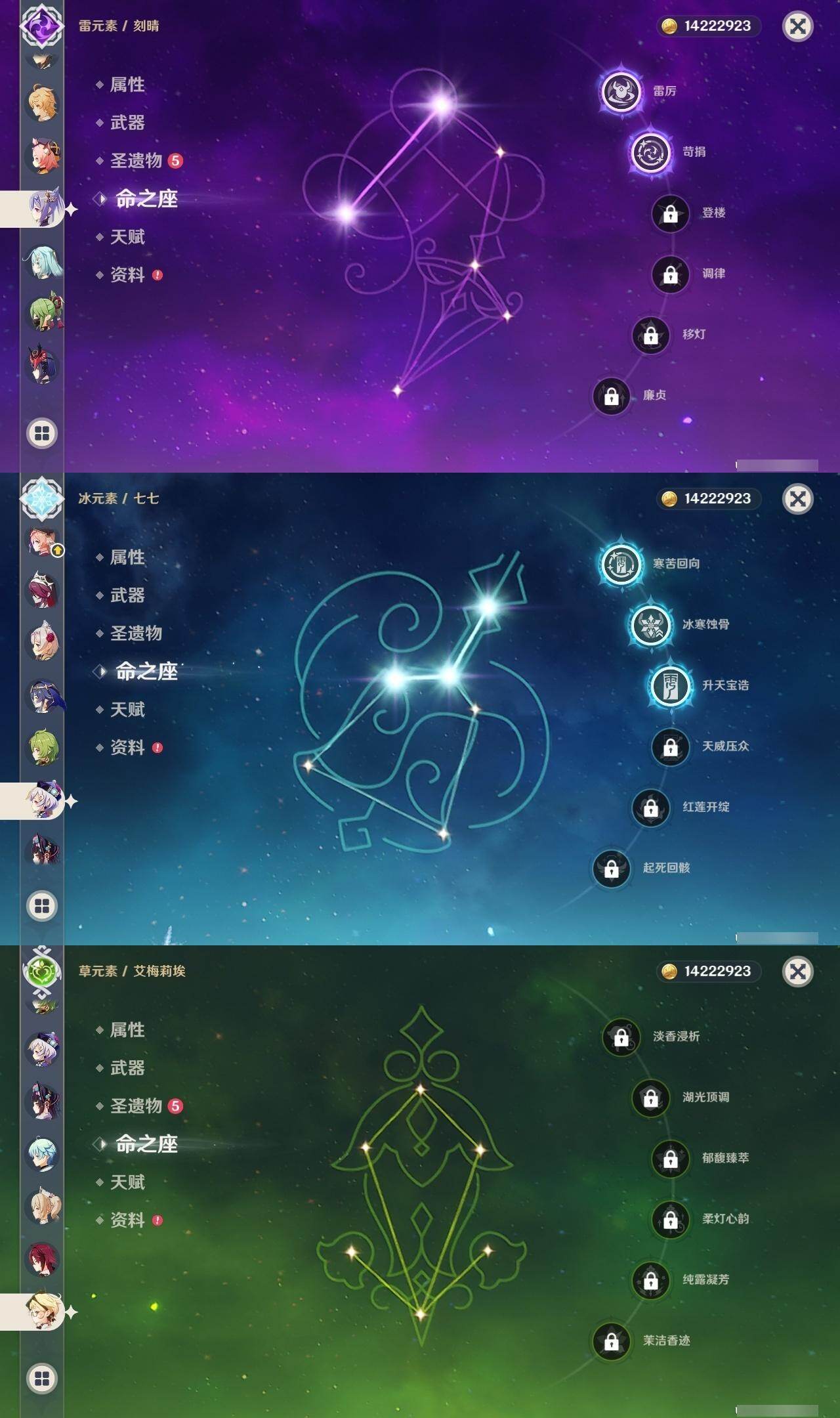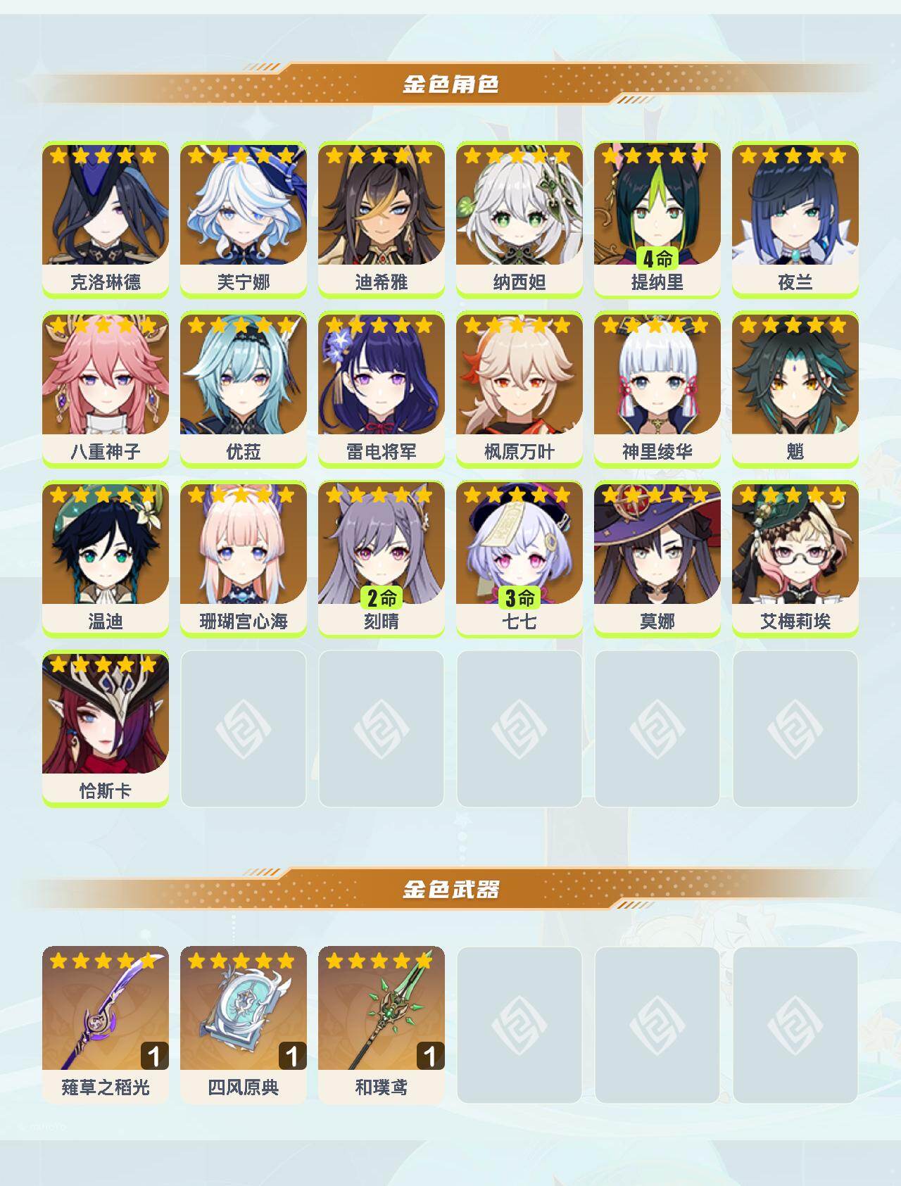 58级/31黄/男主/19个五星角色/3个五星武器 0命克洛琳德0命芙宁娜0命迪希雅0命纳西妲4命提纳里0命夜兰0命八重神子0命优菈0命雷电将军0命枫原万叶0命神里绫华0命魈0命温迪0命珊瑚宫心海2命刻晴3命七七0命莫娜0命艾梅莉埃0命恰斯卡精1薙草之稻光精1四风原典精1和璞鸢