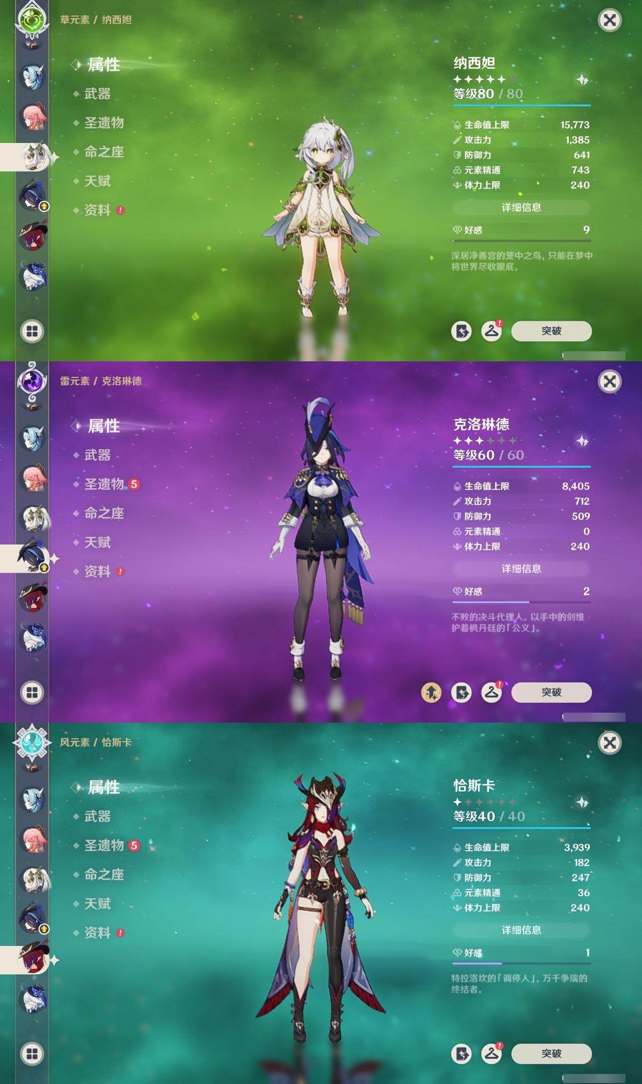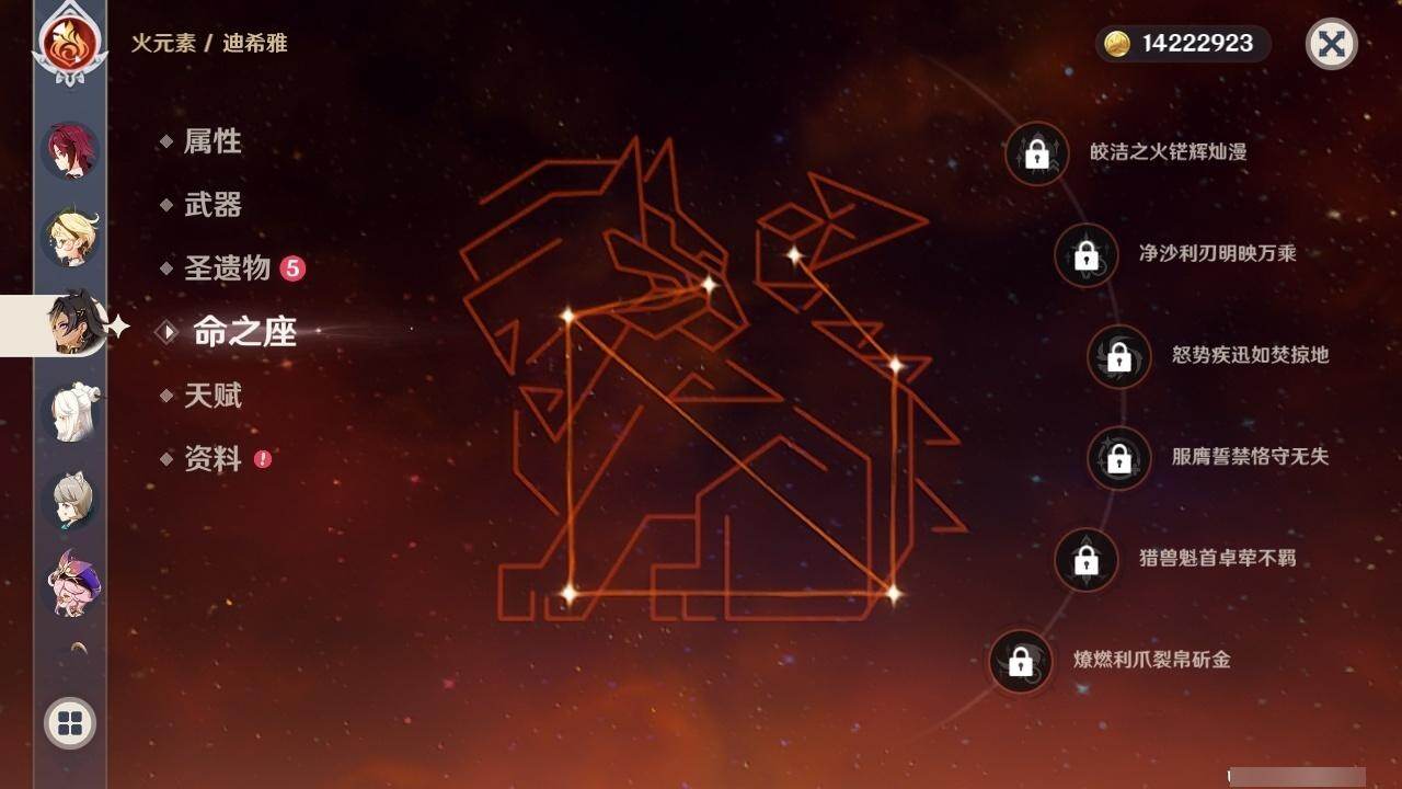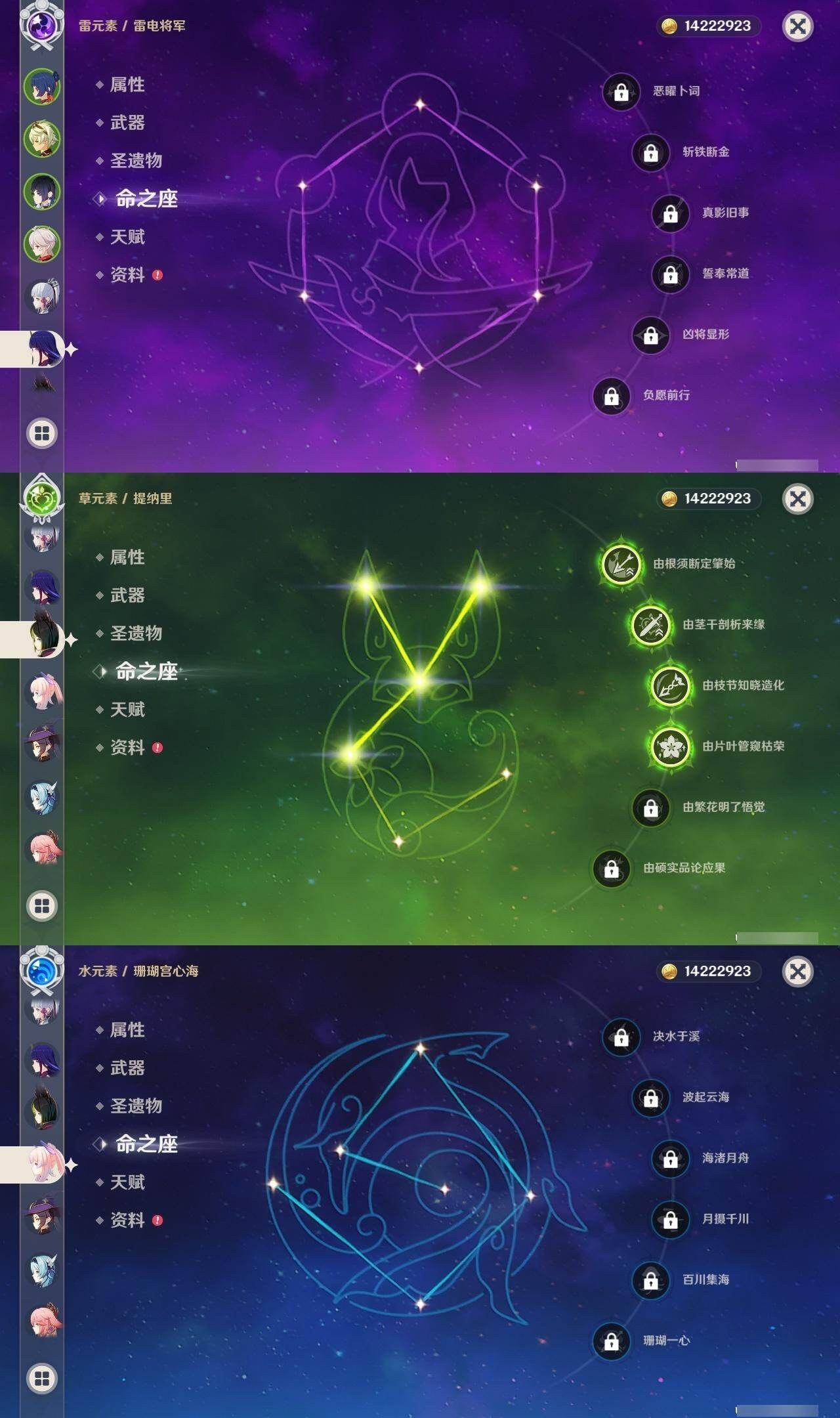 58级/31黄/男主/19个五星角色/3个五星武器 0命克洛琳德0命芙宁娜0命迪希雅0命纳西妲4命提纳里0命夜兰0命八重神子0命优菈0命雷电将军0命枫原万叶0命神里绫华0命魈0命温迪0命珊瑚宫心海2命刻晴3命七七0命莫娜0命艾梅莉埃0命恰斯卡精1薙草之稻光精1四风原典精1和璞鸢