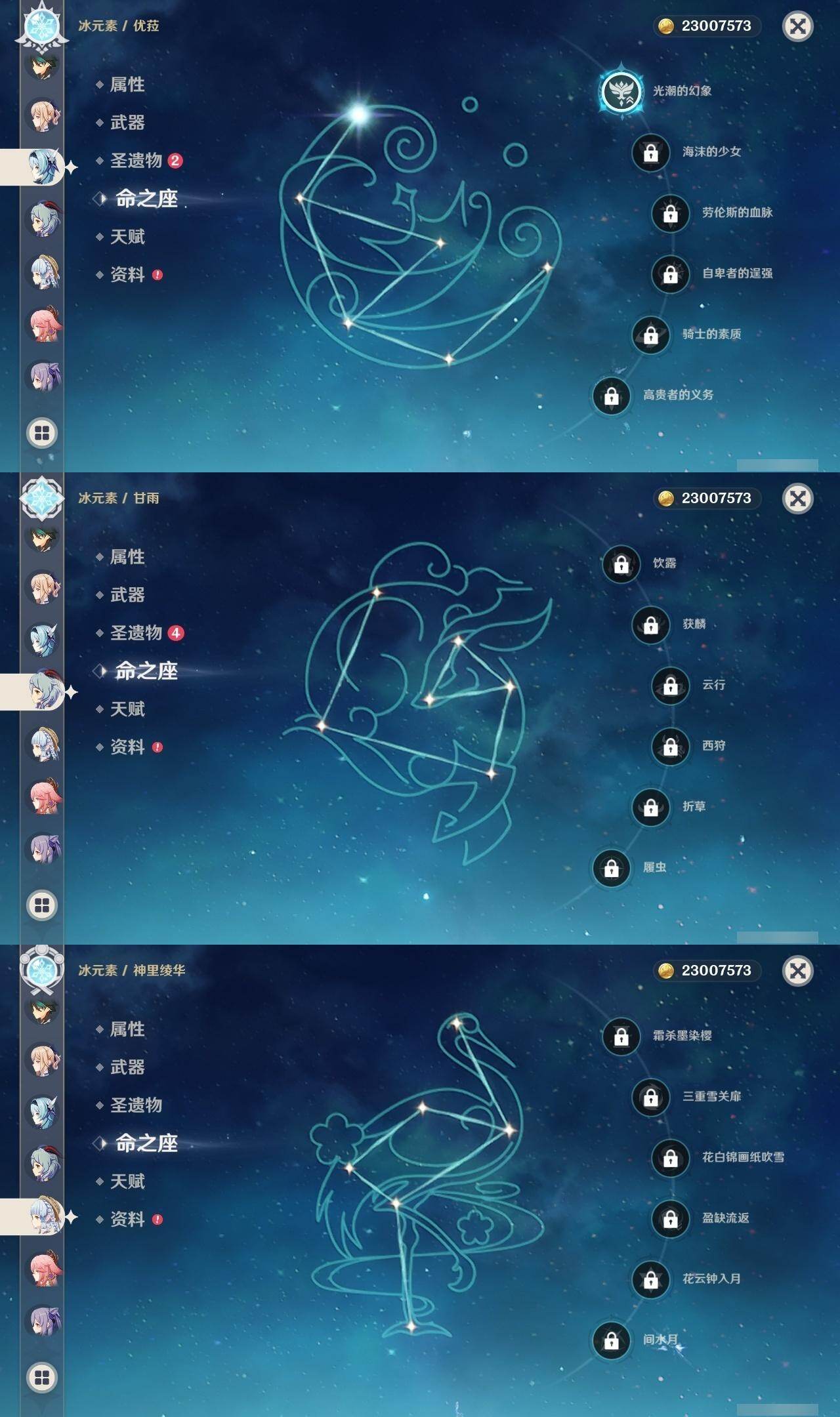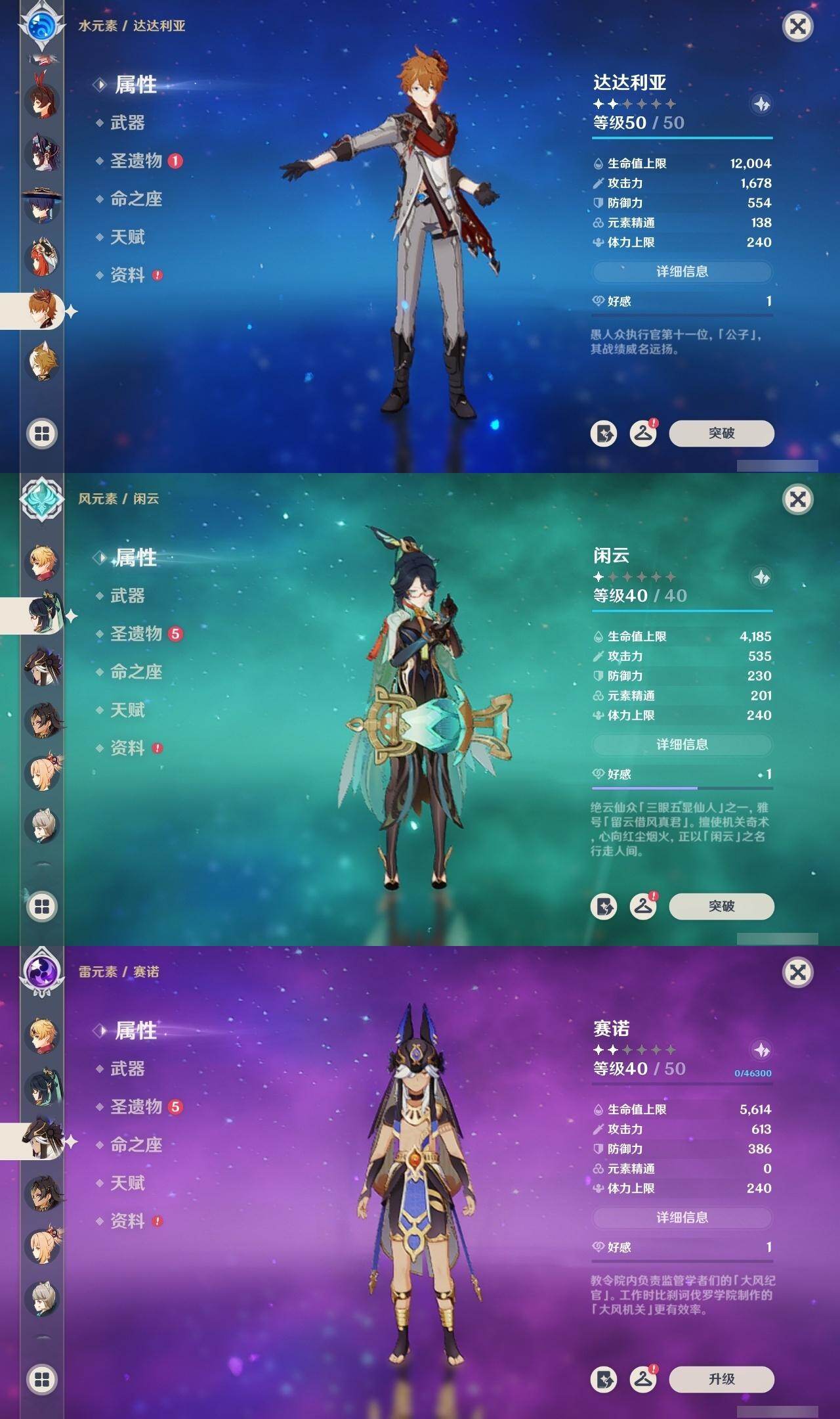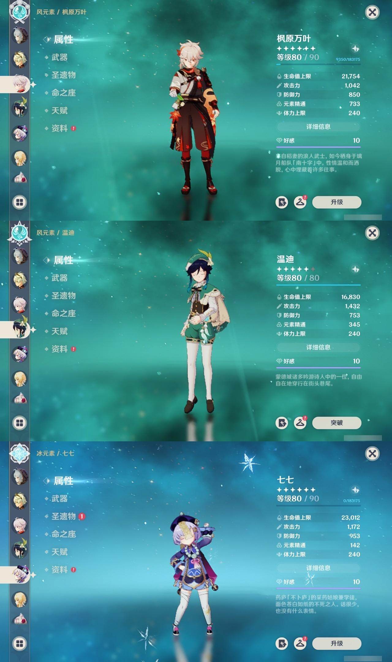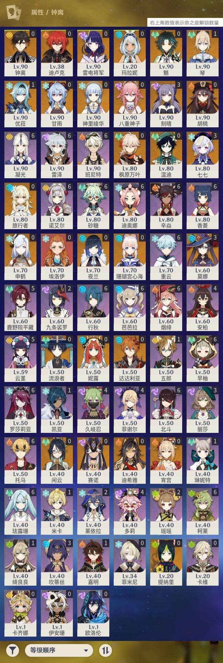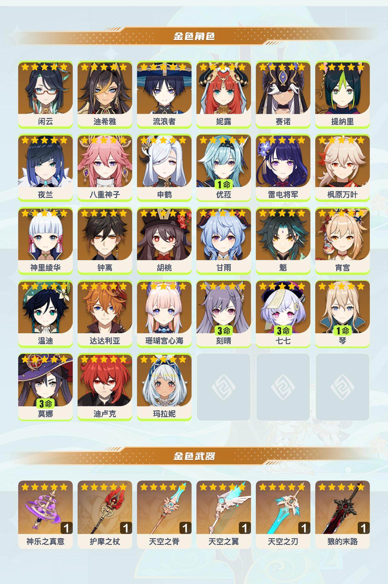 60级/44黄/女主/27个五星角色/6个五星武器 0命闲云0命迪希雅0命流浪者0命妮露0命赛诺0命提纳里0命夜兰0命八重神子0命申鹤1命优菈0命雷电将军0命枫原万叶0命神里绫华0命钟离0命胡桃0命甘雨0命魈0命宵宫0命温迪0命达达利亚0命珊瑚宫心海3命刻晴3命七七1命琴3命莫娜0命迪卢克0命玛拉妮精1神乐之真意精1护摩之杖精1天空之脊精1天空之翼精1天空之刃精1狼的末路