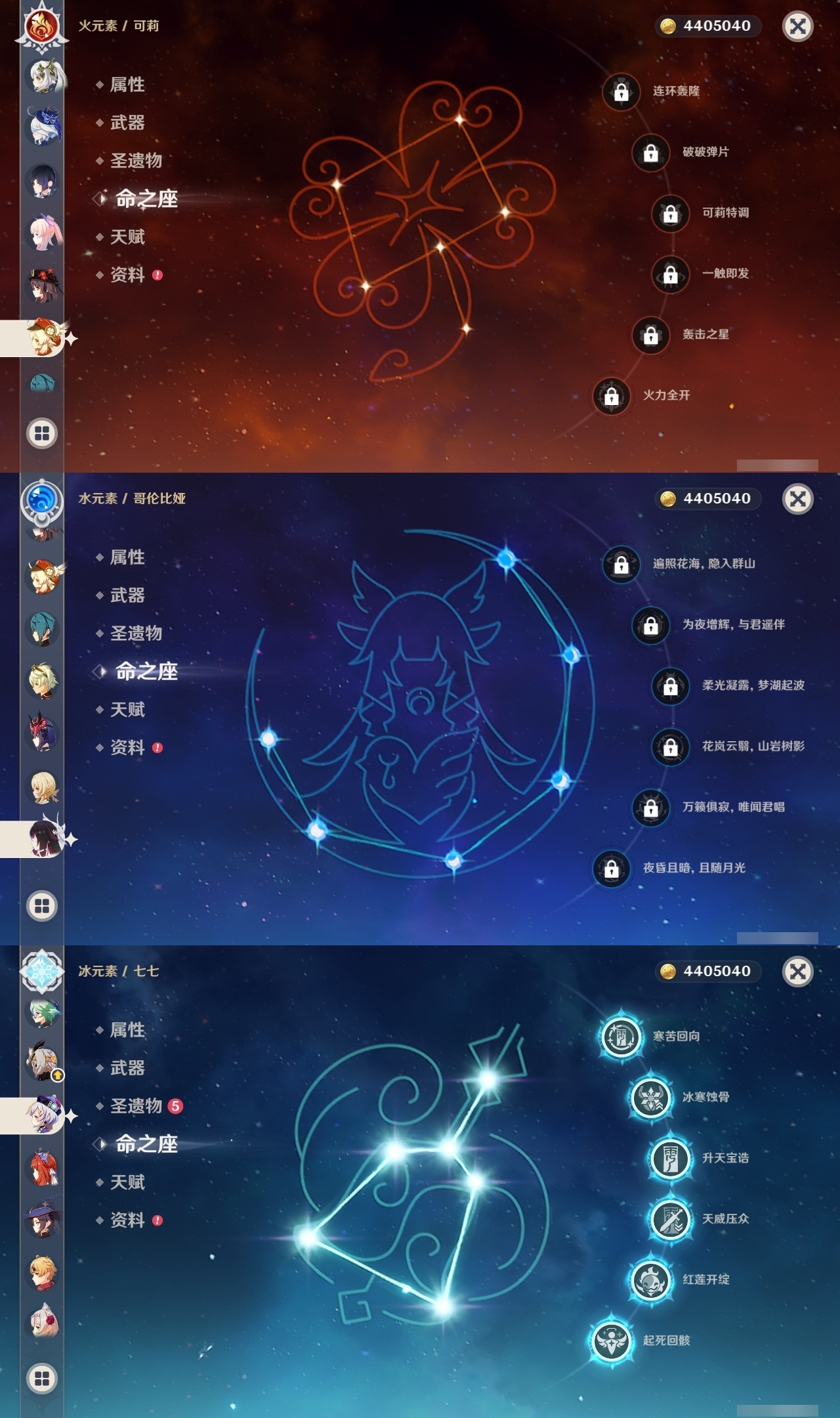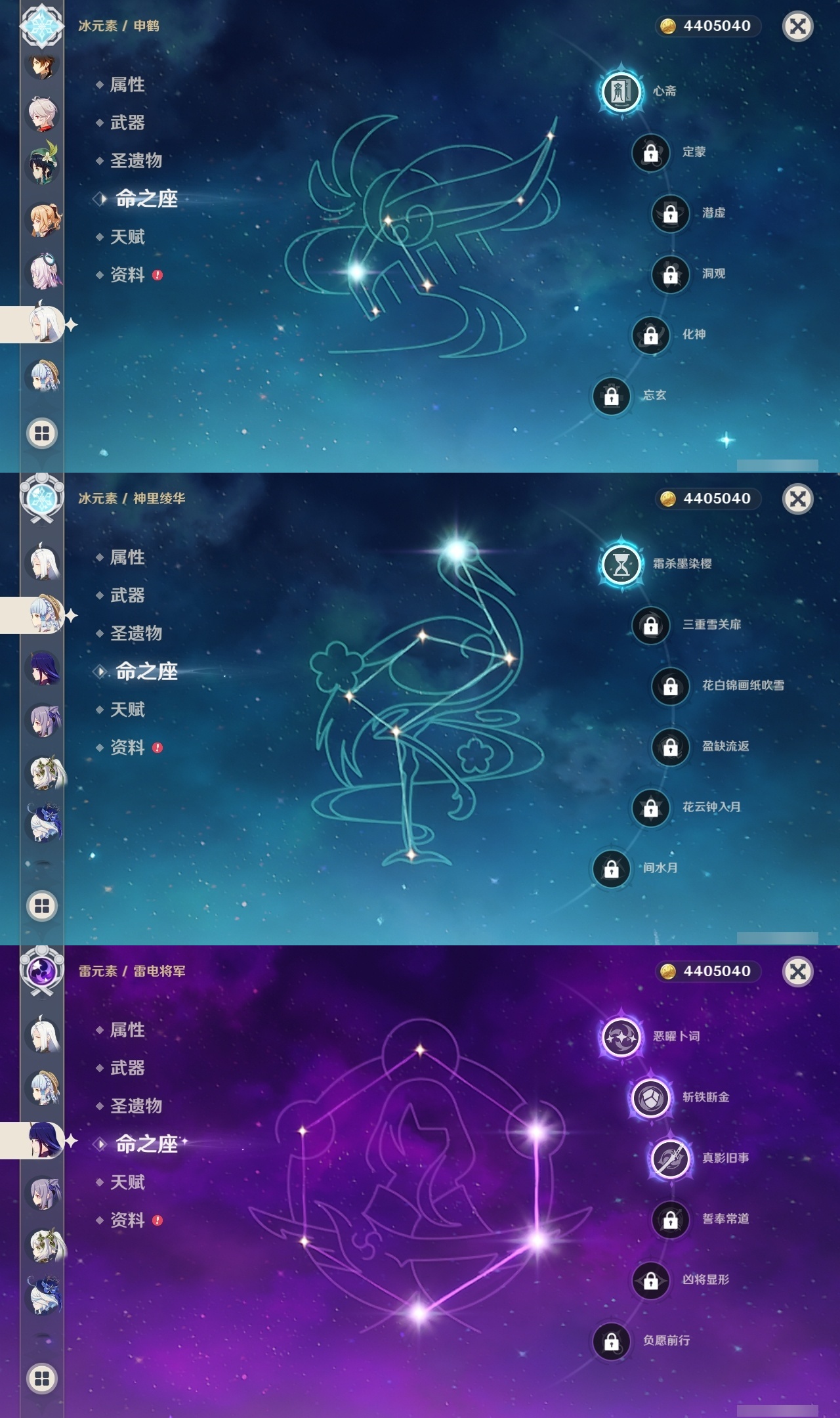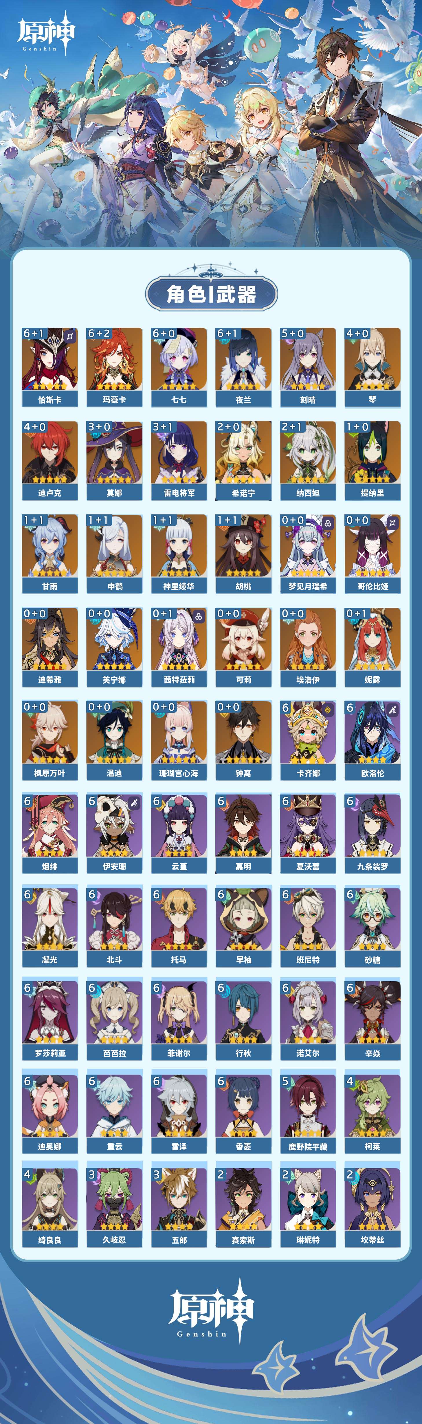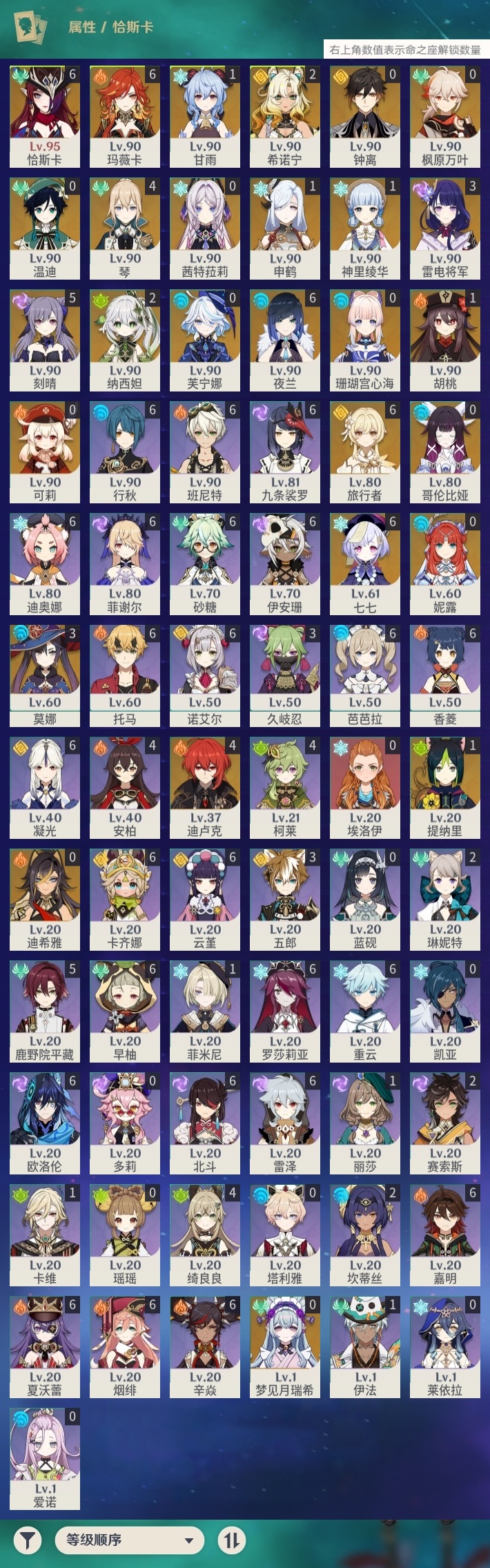 【原神】满命,冒险等级:59,五星数量:47,五星角色:恰斯卡 6命玛薇卡 6命七七 6命夜兰 6命刻晴 5命迪卢克 4命琴 4命雷电将军 3命莫娜 3命希诺宁 2命纳西妲 2命甘雨 1命胡桃 1命神里绫华 1命申鹤 1命提纳里 1命珊瑚宫心海温迪茜特菈莉迪希雅钟离梦见月瑞希芙宁娜妮露哥伦比娅枫原万叶可莉__五星武器:和璞鸢 3精天空之卷 3精焚曜千阳 2精天空之脊 2精星鹫赤羽祭星者之望阿莫斯之弓风鹰剑护摩之杖磐岩结绿无工之剑雾切之回光薙草之稻光冬极白星息灾若水圣显之钥千夜浮梦白雨心弦__四星角色:卡齐娜 6命班尼特 6命行秋 6命九条裟罗 6命香菱 6命凝光 6命迪奥娜 6命砂糖 6命芭芭拉 6命欧洛伦 6命云堇 6命早柚 6命托马 6命烟绯 6命重云 6命辛焱 6命诺艾尔 6命罗莎莉亚 6命雷泽 6命菲谢尔 6命北斗 6命夏沃蕾 6命嘉明 6命伊安珊 6命鹿野院平藏 5命绮良良 4命柯莱 4命久岐忍 3命五郎 3命坎蒂丝 2命琳妮特 2命赛索斯 2命卡维 1命菲米尼 1命伊法 1命埃洛伊瑶瑶莱依拉多莉蓝砚塔利雅爱诺