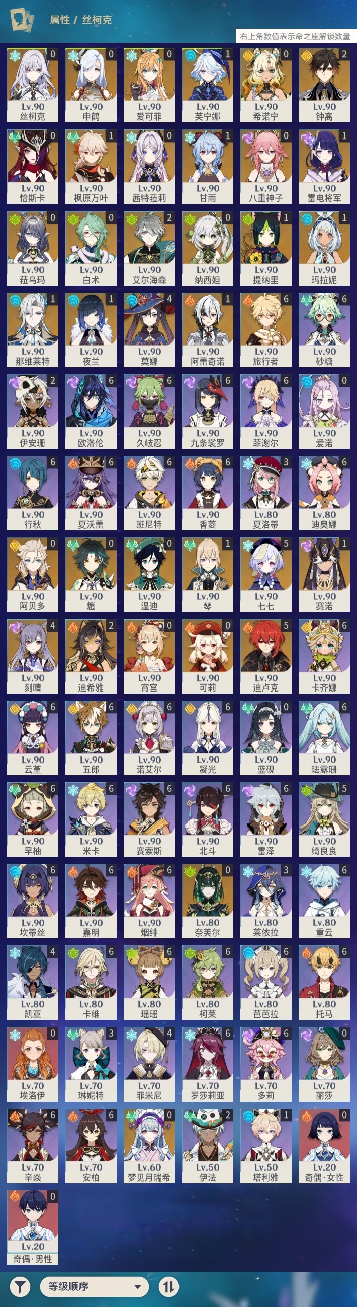 【原神】【lyys11139】冒险等级:60,五星数量:50,五星角色:迪卢克 5命七七 5命刻晴 4命莫娜 4命迪希雅 2命钟离 2命艾尔海森 2命玛拉妮 1命那维莱特 1命芙宁娜 1命阿蕾奇诺 1命枫原万叶 1命甘雨 1命雷电将军 1命琴 1命夜兰 1命提纳里 1命赛诺 1命希诺宁白术温迪恰斯卡茜特菈莉宵宫梦见月瑞希申鹤八重神子阿贝多爱可菲丝柯克纳西妲菈乌玛奈芙尔魈可莉__五星武器:天空之卷 3精星鹫赤羽裁叶萃光阿莫斯之弓狼的末路四风原典松籁响起之时天空之傲天空之脊天空之翼雾切之回光猎人之径__四星角色:卡齐娜 6命班尼特 6命行秋 6命九条裟罗 6命香菱 6命久岐忍 6命珐露珊 6命凝光 6命迪奥娜 6命砂糖 6命瑶瑶 6命米卡 6命坎蒂丝 6命多莉 6命柯莱 6命卡维 6命芭芭拉 6命欧洛伦 6命云堇 6命早柚 6命托马 6命五郎 6命烟绯 6命重云 6命辛焱 6命诺艾尔 6命罗莎莉亚 6命雷泽 6命菲谢尔 6命北斗 6命夏沃蕾 6命嘉明 6命赛索斯 6命绮良良 5命菲米尼 4命莱依拉 3命琳妮特 3命夏洛蒂 3命伊法 2命伊安珊 2命塔利雅 1命埃洛伊奇偶·女性奇偶·男性蓝砚爱诺