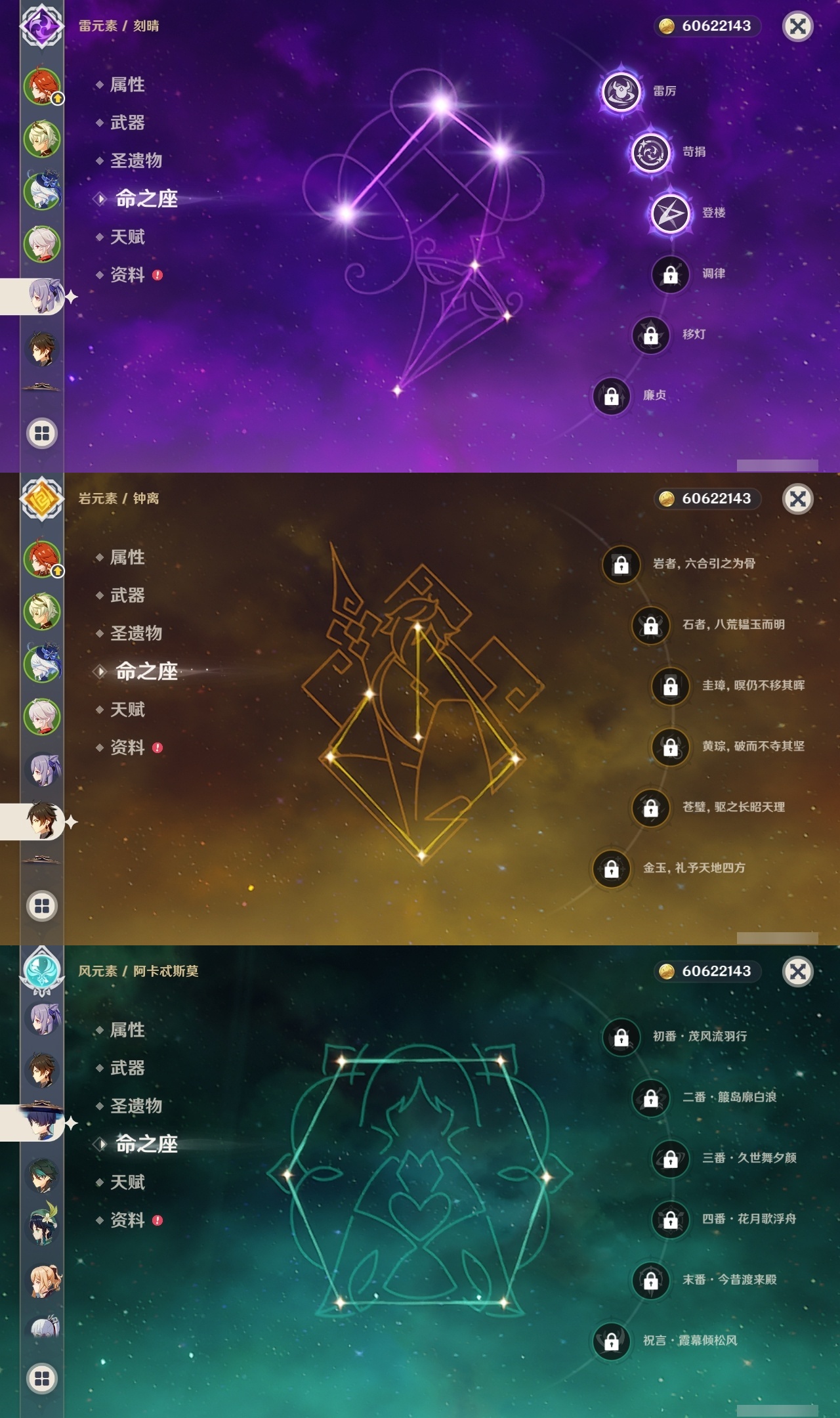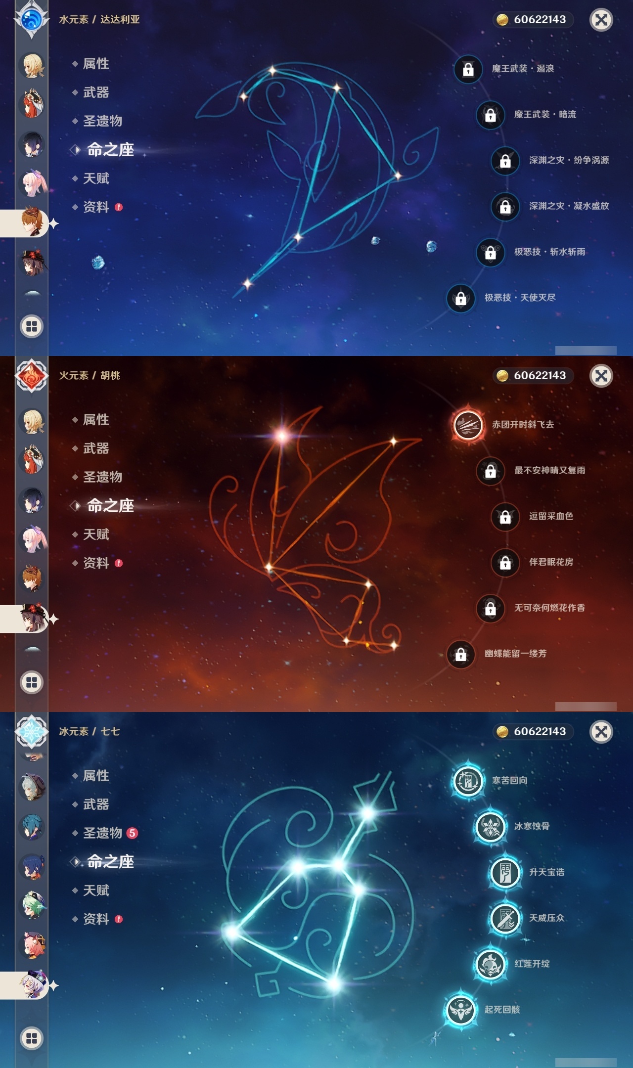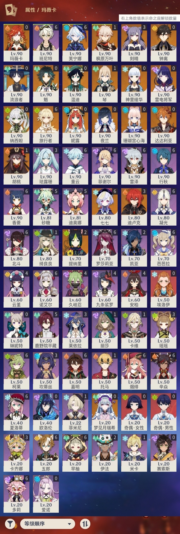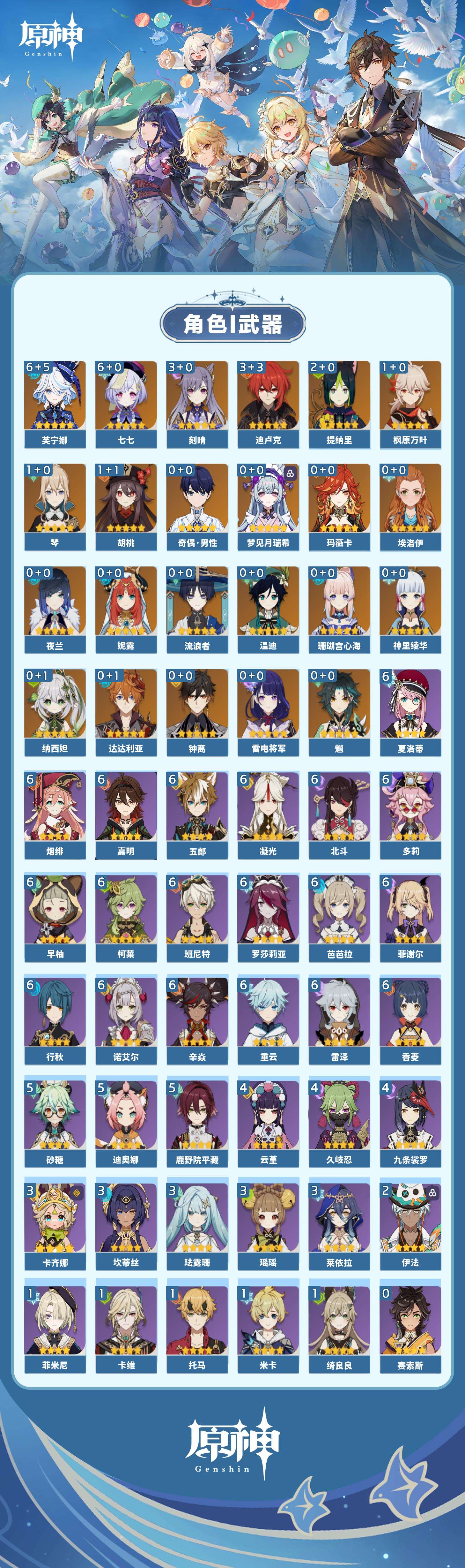 【原神】【lyys11145】冒险等级:60,五星数量:37,五星角色:芙宁娜 6命七七 6命迪卢克 3命刻晴 3命提纳里 2命枫原万叶 1命胡桃 1命琴 1命珊瑚宫心海神里绫华温迪玛薇卡钟离达达利亚梦见月瑞希夜兰妮露纳西妲流浪者魈雷电将军__五星武器:静水流涌之辉 5精狼的末路 3精阿莫斯之弓风鹰剑护摩之杖四风原典天空之脊天空之刃天空之翼冬极白星赤沙之杖千夜浮梦白雨心弦__四星角色:班尼特 6命行秋 6命香菱 6命凝光 6命多莉 6命柯莱 6命芭芭拉 6命早柚 6命五郎 6命烟绯 6命重云 6命辛焱 6命诺艾尔 6命罗莎莉亚 6命雷泽 6命菲谢尔 6命北斗 6命夏洛蒂 6命嘉明 6命鹿野院平藏 5命迪奥娜 5命砂糖 5命九条裟罗 4命久岐忍 4命云堇 4命卡齐娜 3命珐露珊 3命瑶瑶 3命莱依拉 3命坎蒂丝 3命伊法 2命绮良良 1命米卡 1命卡维 1命托马 1命菲米尼 1命埃洛伊奇偶·女性奇偶·男性欧洛伦琳妮特爱诺赛索斯