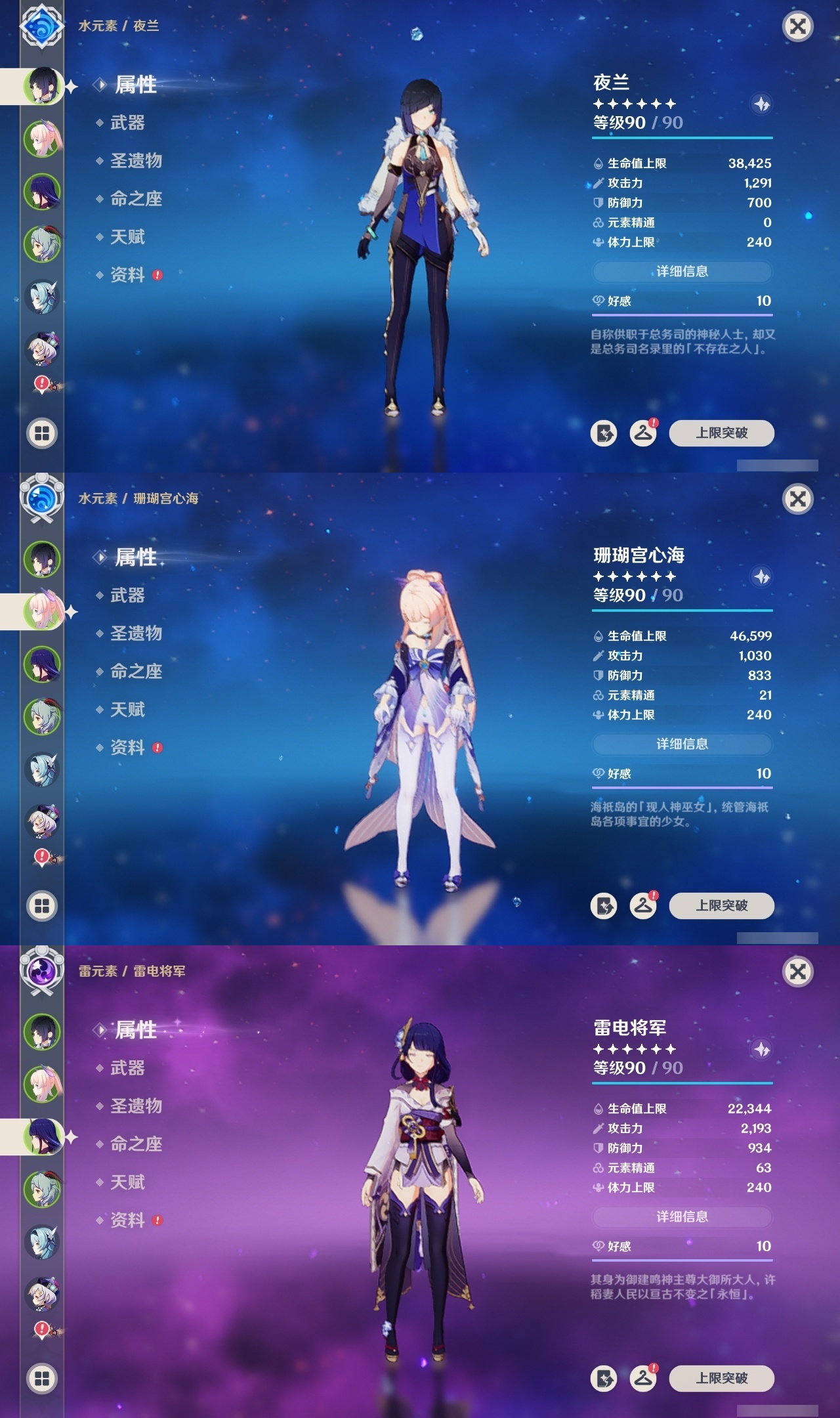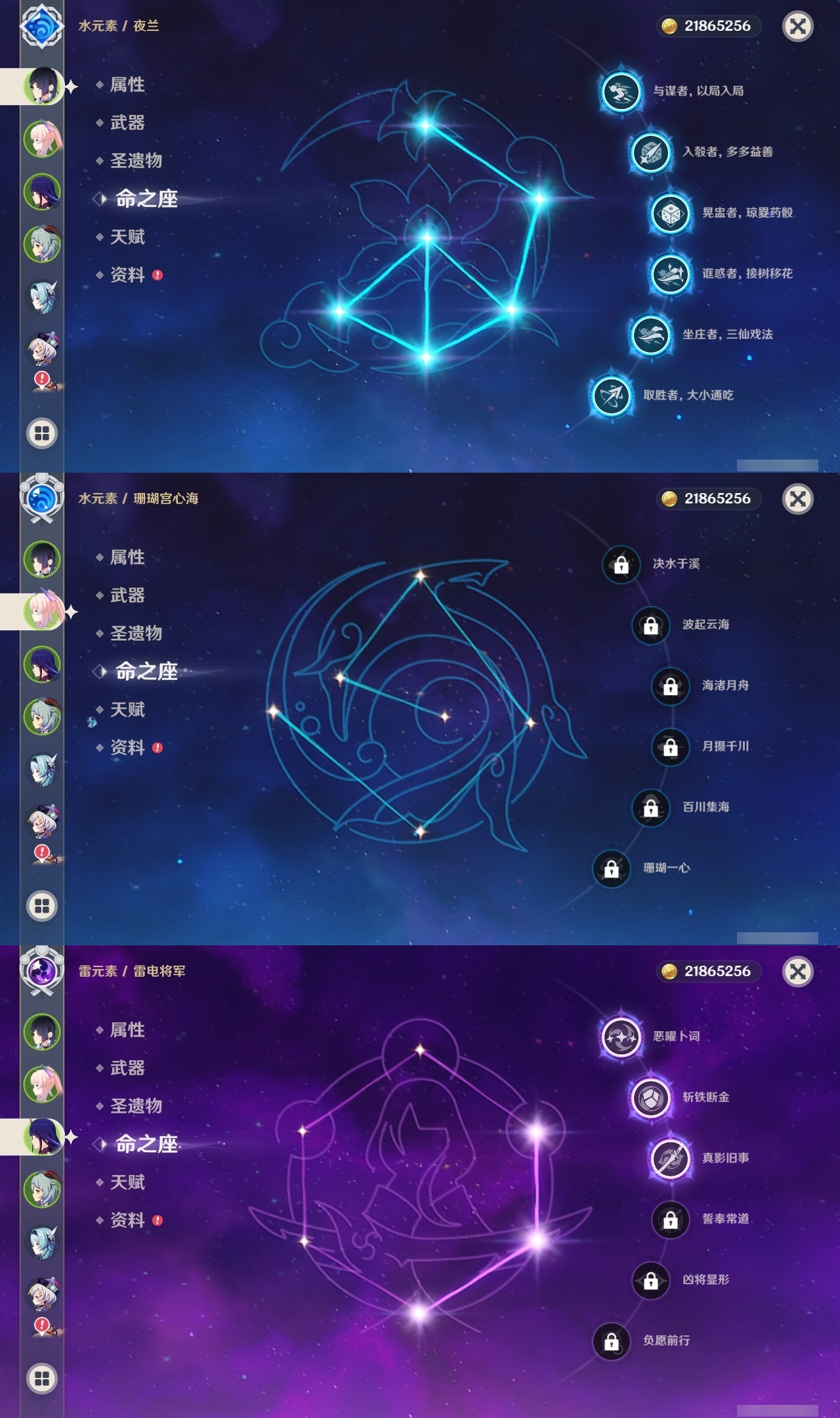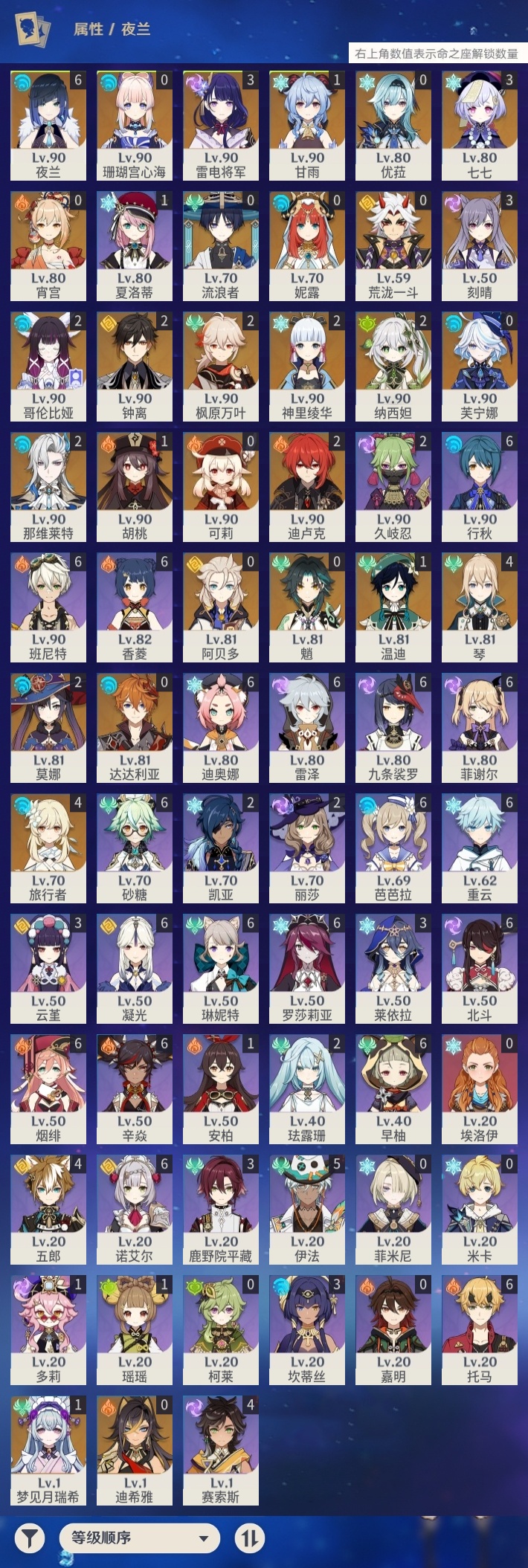 【原神】【lyys11158】冒险等级:60,五星数量:42,五星角色:夜兰 6命琴 4命刻晴 3命雷电将军 3命七七 3命那维莱特 2命哥伦比娅 2命迪卢克 2命枫原万叶 2命莫娜 2命神里绫华 2命钟离 2命纳西妲 2命梦见月瑞希 1命甘雨 1命胡桃 1命温迪 1命珊瑚宫心海宵宫优菈迪希雅荒泷一斗达达利亚阿贝多芙宁娜妮露流浪者魈可莉__五星武器:帷间夜曲风鹰剑护摩之杖狼的末路天空之傲天空之脊天空之卷无工之剑雾切之回光薙草之稻光息灾若水__四星角色:班尼特 6命行秋 6命九条裟罗 6命香菱 6命凝光 6命迪奥娜 6命砂糖 6命芭芭拉 6命早柚 6命托马 6命烟绯 6命重云 6命辛焱 6命诺艾尔 6命罗莎莉亚 6命雷泽 6命菲谢尔 6命北斗 6命琳妮特 6命伊法 5命五郎 4命赛索斯 4命鹿野院平藏 3命莱依拉 3命坎蒂丝 3命云堇 3命久岐忍 2命珐露珊 2命瑶瑶 1命多莉 1命夏洛蒂 1命埃洛伊米卡柯莱菲米尼嘉明