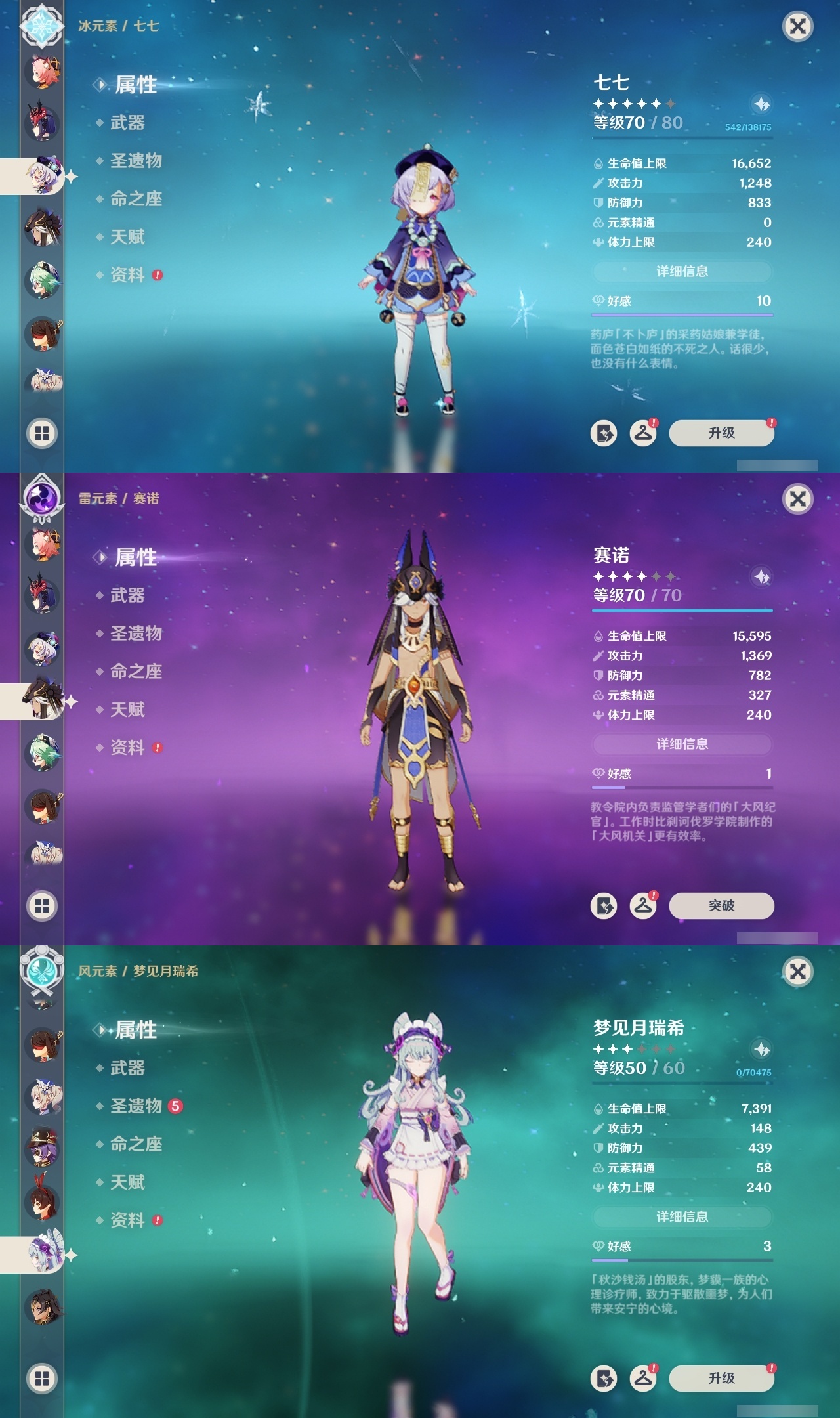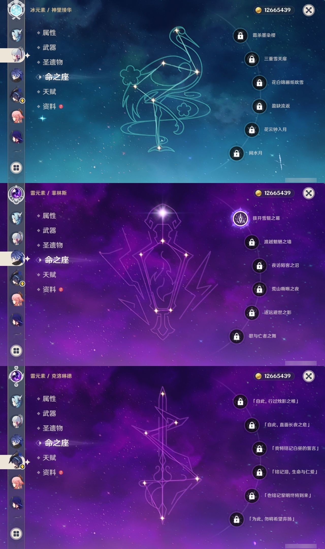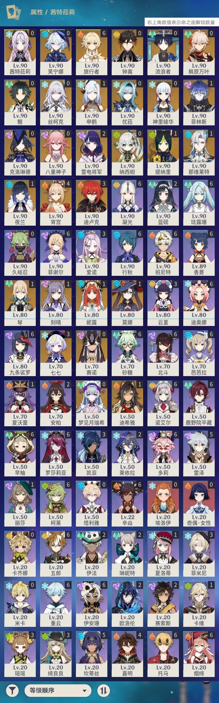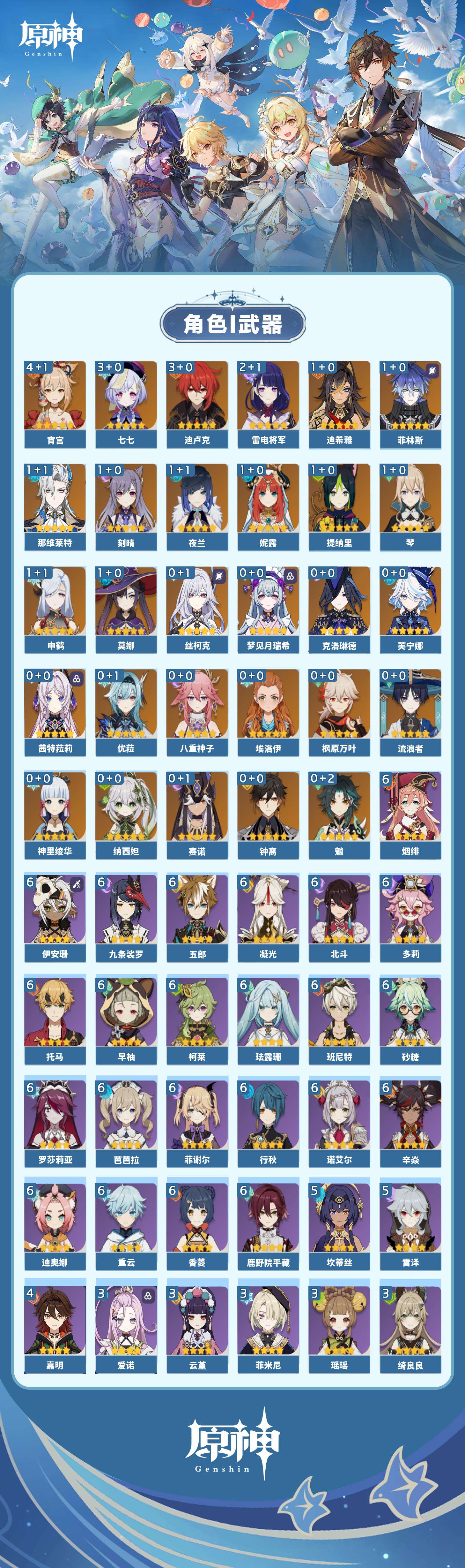 【原神】【lyys11148】冒险等级:60,五星数量:47,五星角色:宵宫 4命迪卢克 3命七七 3命雷电将军 2命迪希雅 1命那维莱特 1命菲林斯 1命刻晴 1命莫娜 1命琴 1命申鹤 1命夜兰 1命提纳里 1命妮露 1命神里绫华茜特菈莉优菈钟离梦见月瑞希八重神子芙宁娜赛诺丝柯克纳西妲流浪者枫原万叶魈克洛琳德__五星武器:和璞鸢 2精万世流涌大典苍耀裁叶萃光阿莫斯之弓飞雷之弦振护摩之杖磐岩结绿四风原典松籁响起之时天空之傲天空之脊薙草之稻光终末嗟叹之诗息灾若水赤沙之杖__四星角色:班尼特 6命行秋 6命九条裟罗 6命香菱 6命鹿野院平藏 6命珐露珊 6命凝光 6命迪奥娜 6命砂糖 6命多莉 6命柯莱 6命芭芭拉 6命早柚 6命托马 6命五郎 6命烟绯 6命重云 6命辛焱 6命诺艾尔 6命罗莎莉亚 6命菲谢尔 6命北斗 6命伊安珊 6命坎蒂丝 5命雷泽 5命嘉明 4命绮良良 3命瑶瑶 3命云堇 3命菲米尼 3命爱诺 3命莱依拉 2命欧洛伦 2命蓝砚 2命琳妮特 2命伊法 2命赛索斯 2命卡维 1命夏洛蒂 1命夏沃蕾 1命埃洛伊奇偶·女性卡齐娜久岐忍米卡塔利雅160抽