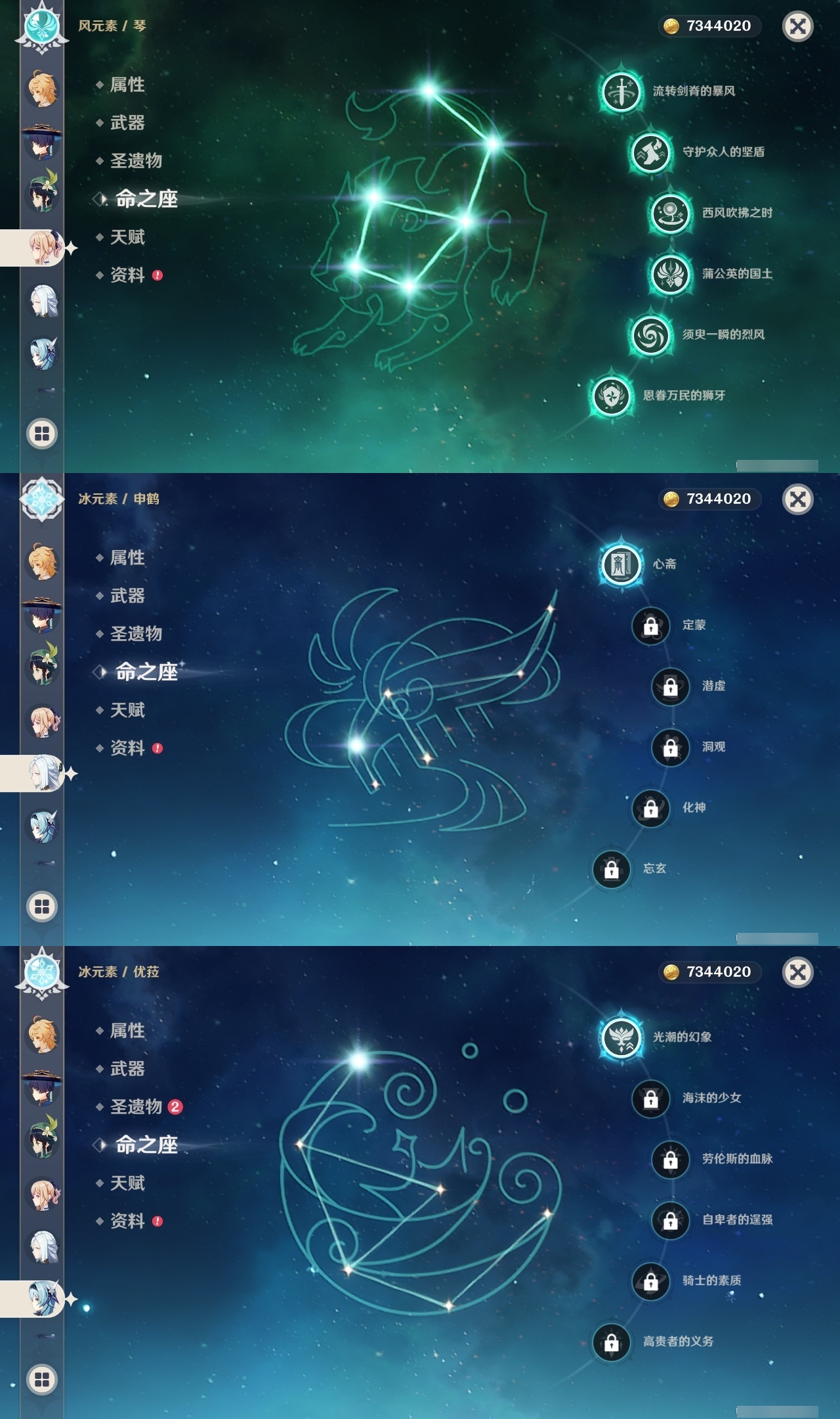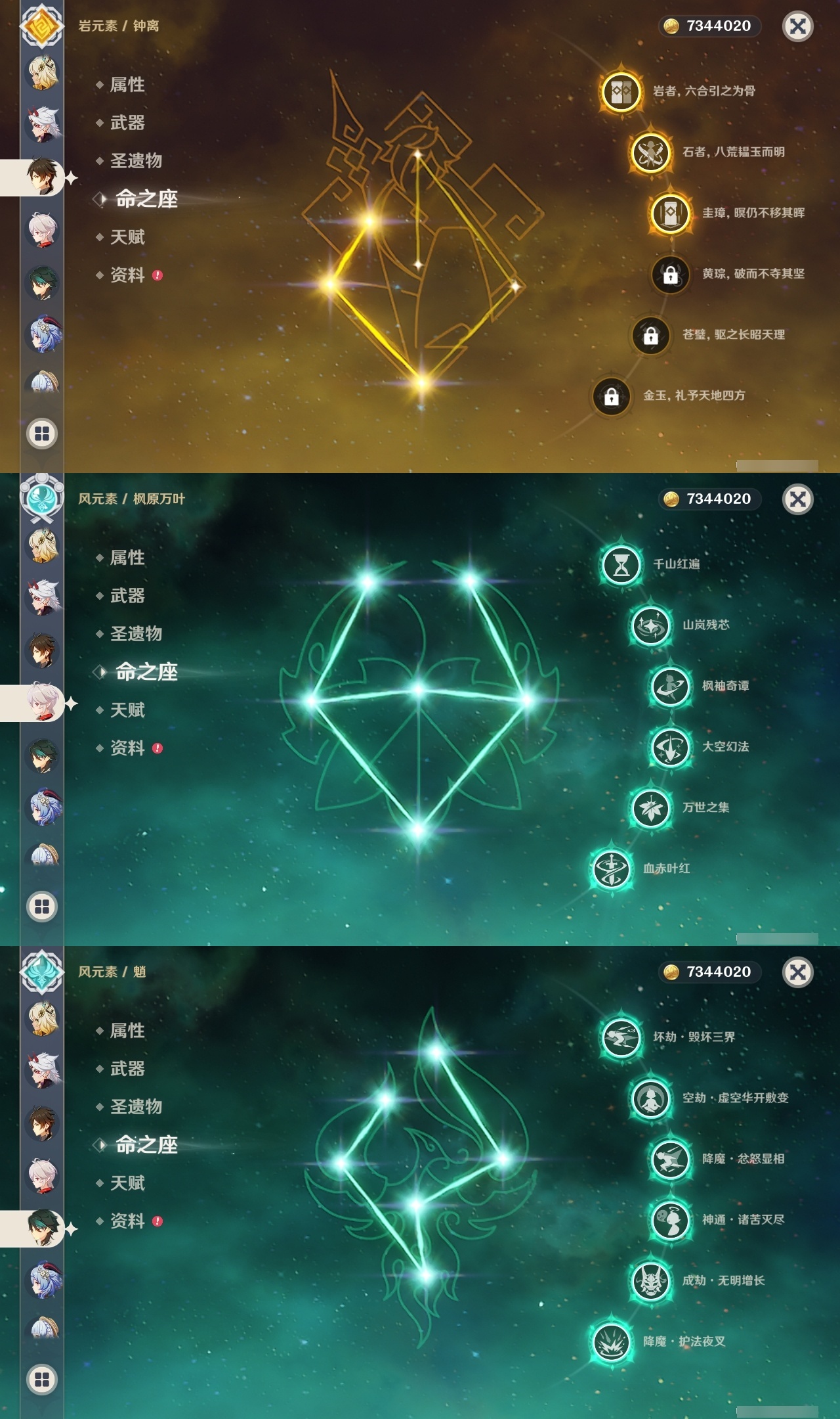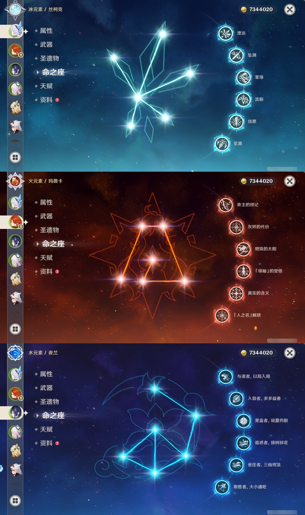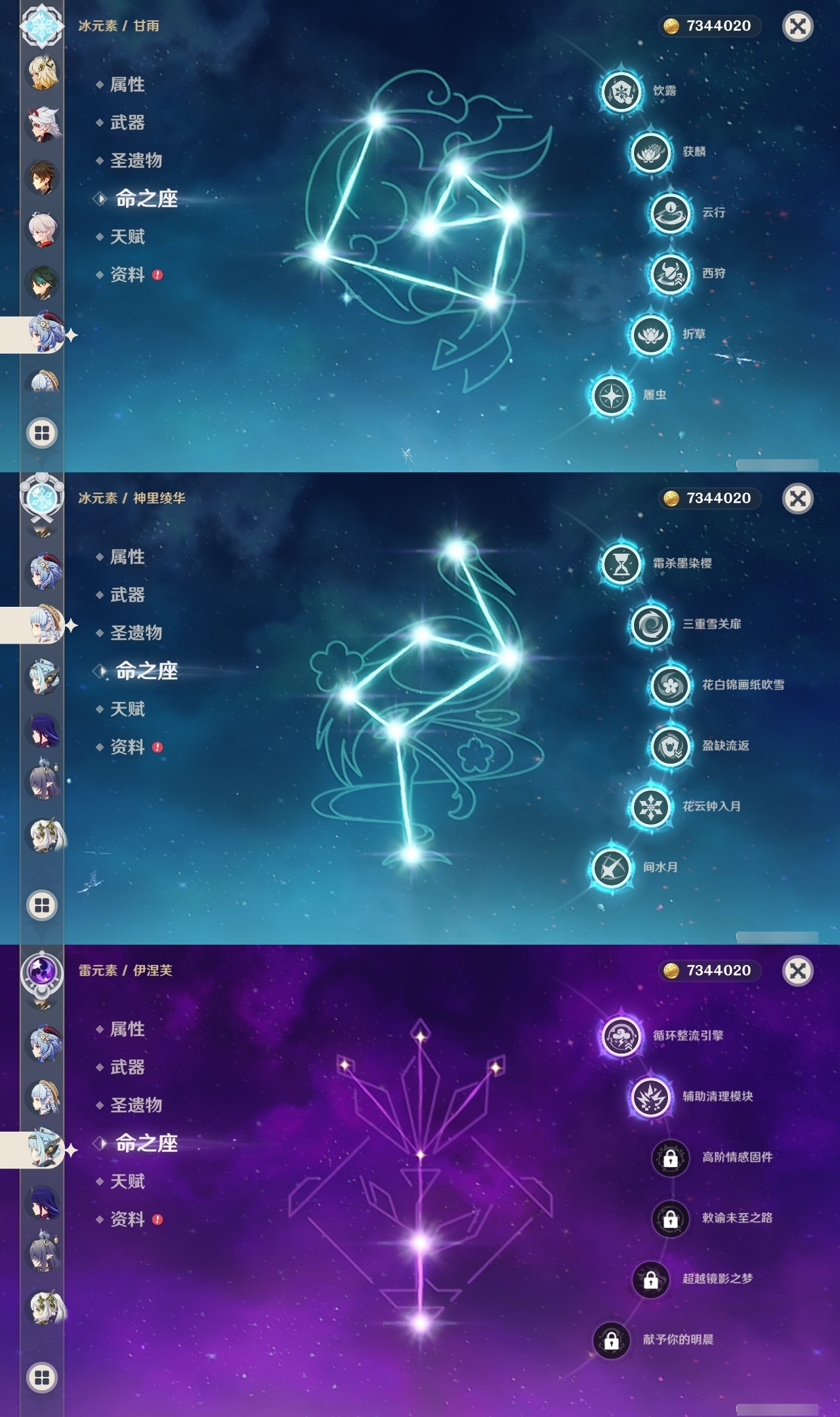 【原神】6满命,冒险等级:60,五星数量:71,五星角色:玛薇卡 6命茜特菈莉 6命丝柯克 6命达达利亚 6命迪卢克 6命枫原万叶 6命甘雨 6命魈 6命刻晴 6命莫娜 6命七七 6命琴 6命神里绫华 6命荒泷一斗 6命夜兰 6命纳西妲 6命提纳里 4命雷电将军 3命钟离 3命伊涅芙 2命胡桃 2命迪希雅 1命优菈 1命申鹤 1命八重神子 1命赛诺 1命珊瑚宫心海希诺宁温迪宵宫阿贝多那维莱特芙宁娜妮露菈乌玛流浪者可莉__五星武器:和璞鸢 5精阿莫斯之弓 4精祭星者之望 3精焚曜千阳 3精若水 3精千夜浮梦 3精柔灯挽歌 2精支离轮光 2精天空之翼 2精冬极白星 2精神乐之真意 2精苍耀真语秘匣图莱杜拉的回忆不灭月华苍古自由之誓飞雷之弦振护摩之杖狼的末路磐岩结绿四风原典天空之脊天空之卷天空之刃无工之剑雾切之回光薙草之稻光终末嗟叹之诗赤角石溃杵息灾贯虹之槊赤沙之杖__四星角色:班尼特 6命行秋 6命九条裟罗 6命香菱 6命久岐忍 6命鹿野院平藏 6命凝光 6命迪奥娜 6命砂糖 6命瑶瑶 6命莱依拉 6命坎蒂丝 6命柯莱 6命芭芭拉 6命云堇 6命早柚 6命托马 6命五郎 6命烟绯 6命重云 6命辛焱 6命诺艾尔 6命罗莎莉亚 6命雷泽 6命菲谢尔 6命北斗 6命伊法 6命伊安珊 6命塔利雅 6命赛索斯 6命多莉 5命琳妮特 5命珐露珊 4命嘉明 4命卡维 3命夏沃蕾 3命卡齐娜 1命欧洛伦 1命夏洛蒂 1命埃洛伊奇偶·女性蓝砚菲米尼爱诺