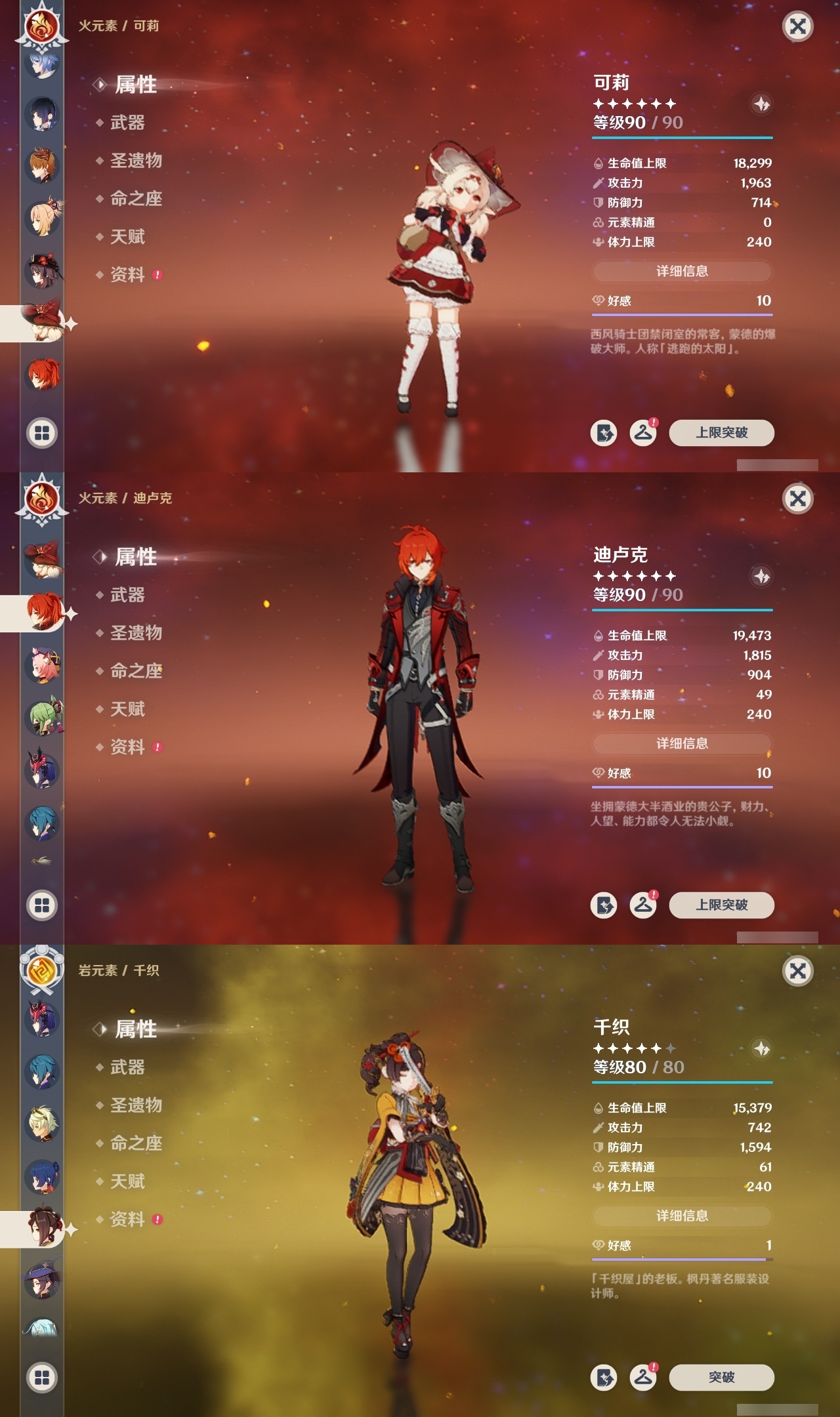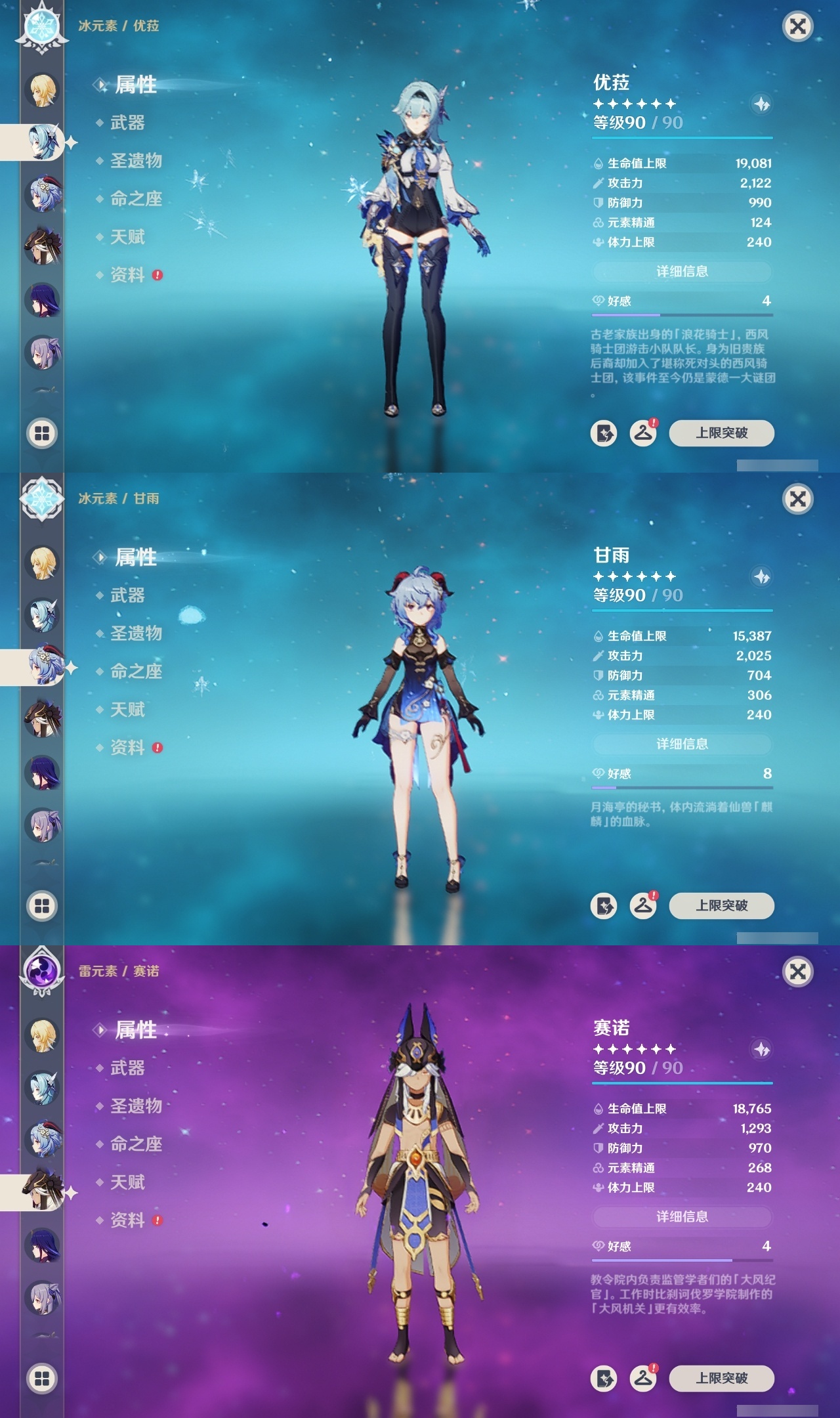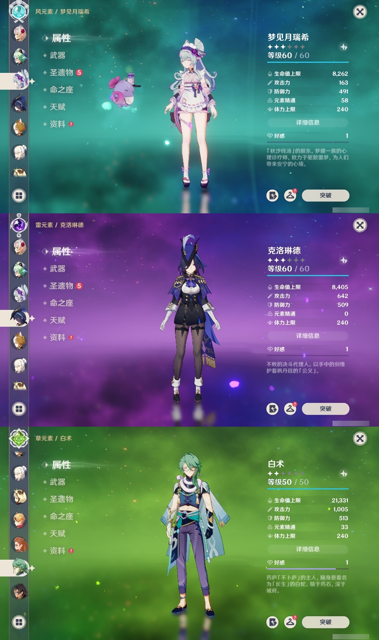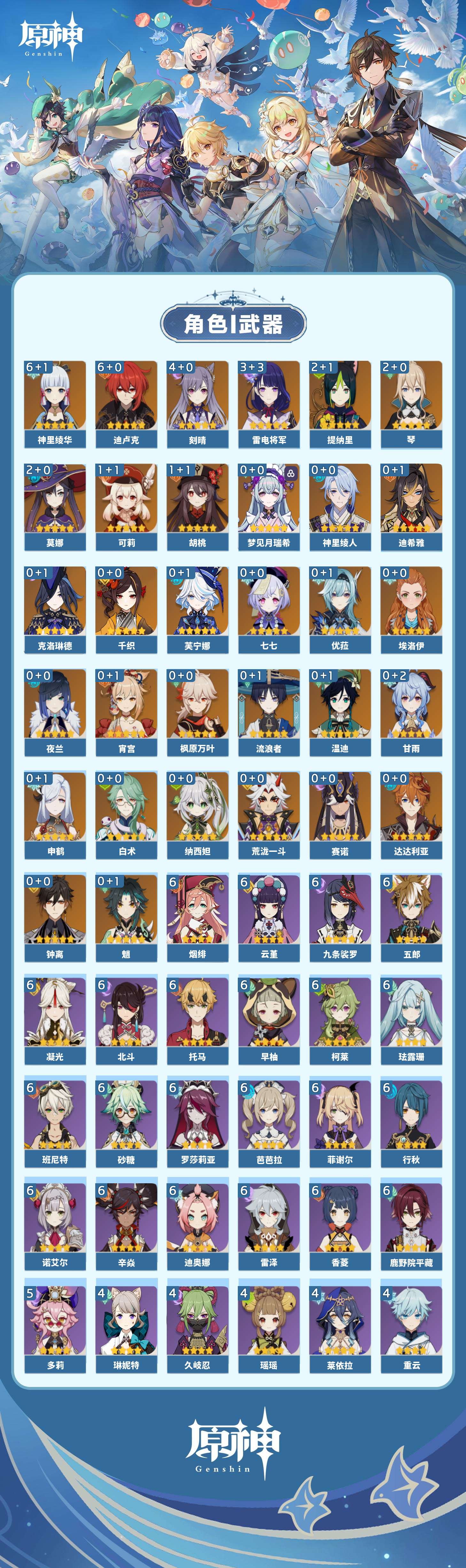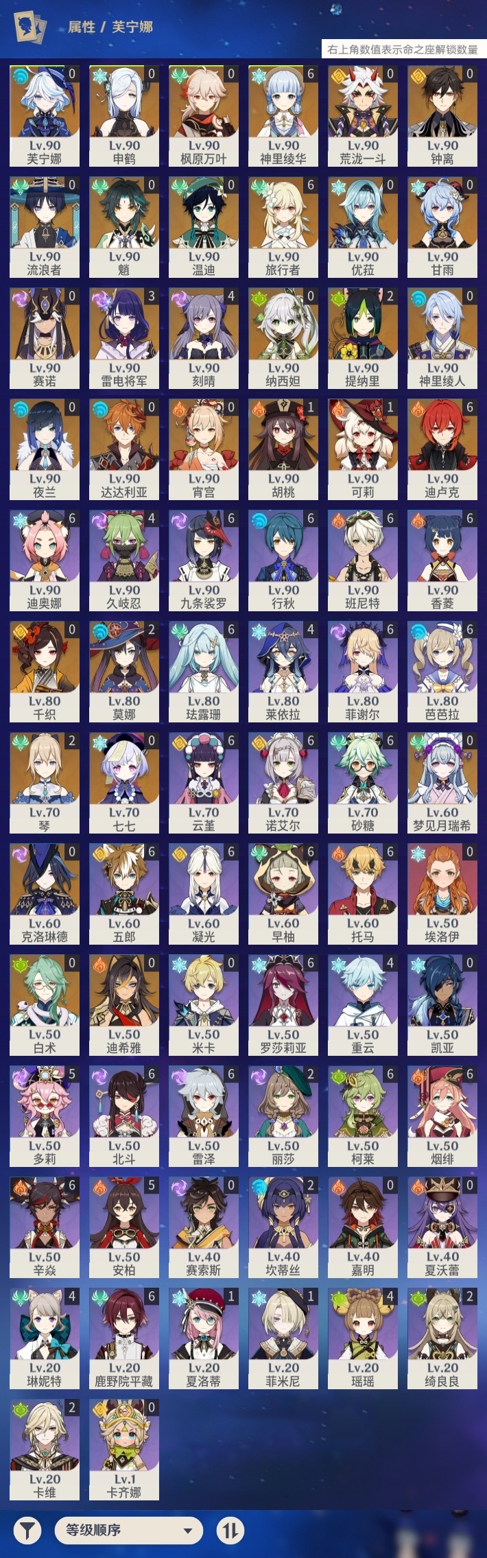 【原神】【lyys11154】冒险等级:60,五星数量:55,五星角色:迪卢克 6命神里绫华 6命刻晴 4命雷电将军 3命莫娜 2命琴 2命提纳里 2命胡桃 1命可莉 1命七七白术温迪宵宫优菈迪希雅钟离荒泷一斗达达利亚梦见月瑞希申鹤神里绫人夜兰芙宁娜千织赛诺纳西妲流浪者枫原万叶甘雨魈克洛琳德__五星武器:天空之傲 4精薙草之稻光 3精阿莫斯之弓 2精苇海信标万世流涌大典静水流涌之辉鹤鸣余音图莱杜拉的回忆飞雷之弦振风鹰剑和璞鸢护摩之杖四风原典松籁响起之时天空之卷天空之刃天空之翼无工之剑雾切之回光终末嗟叹之诗息灾猎人之径赦罪__四星角色:班尼特 6命行秋 6命九条裟罗 6命香菱 6命鹿野院平藏 6命珐露珊 6命凝光 6命迪奥娜 6命砂糖 6命柯莱 6命芭芭拉 6命云堇 6命早柚 6命托马 6命五郎 6命烟绯 6命辛焱 6命诺艾尔 6命罗莎莉亚 6命雷泽 6命菲谢尔 6命北斗 6命多莉 5命久岐忍 4命瑶瑶 4命莱依拉 4命重云 4命琳妮特 4命绮良良 2命坎蒂丝 2命卡维 2命菲米尼 1命夏洛蒂 1命埃洛伊卡齐娜米卡夏沃蕾嘉明赛索斯