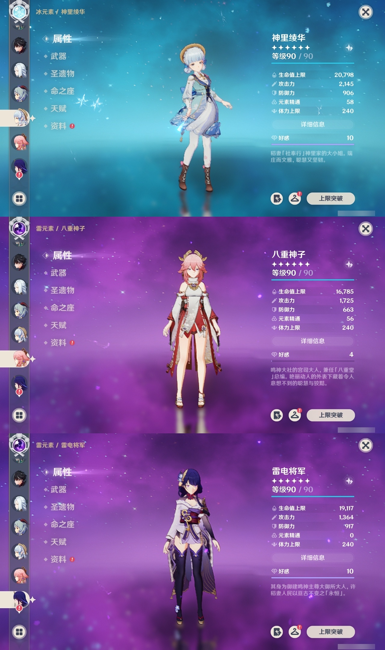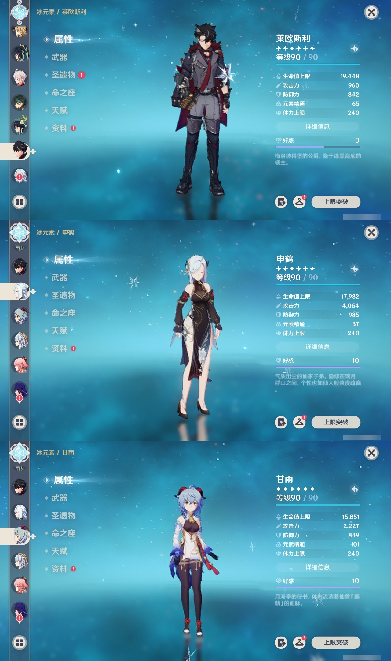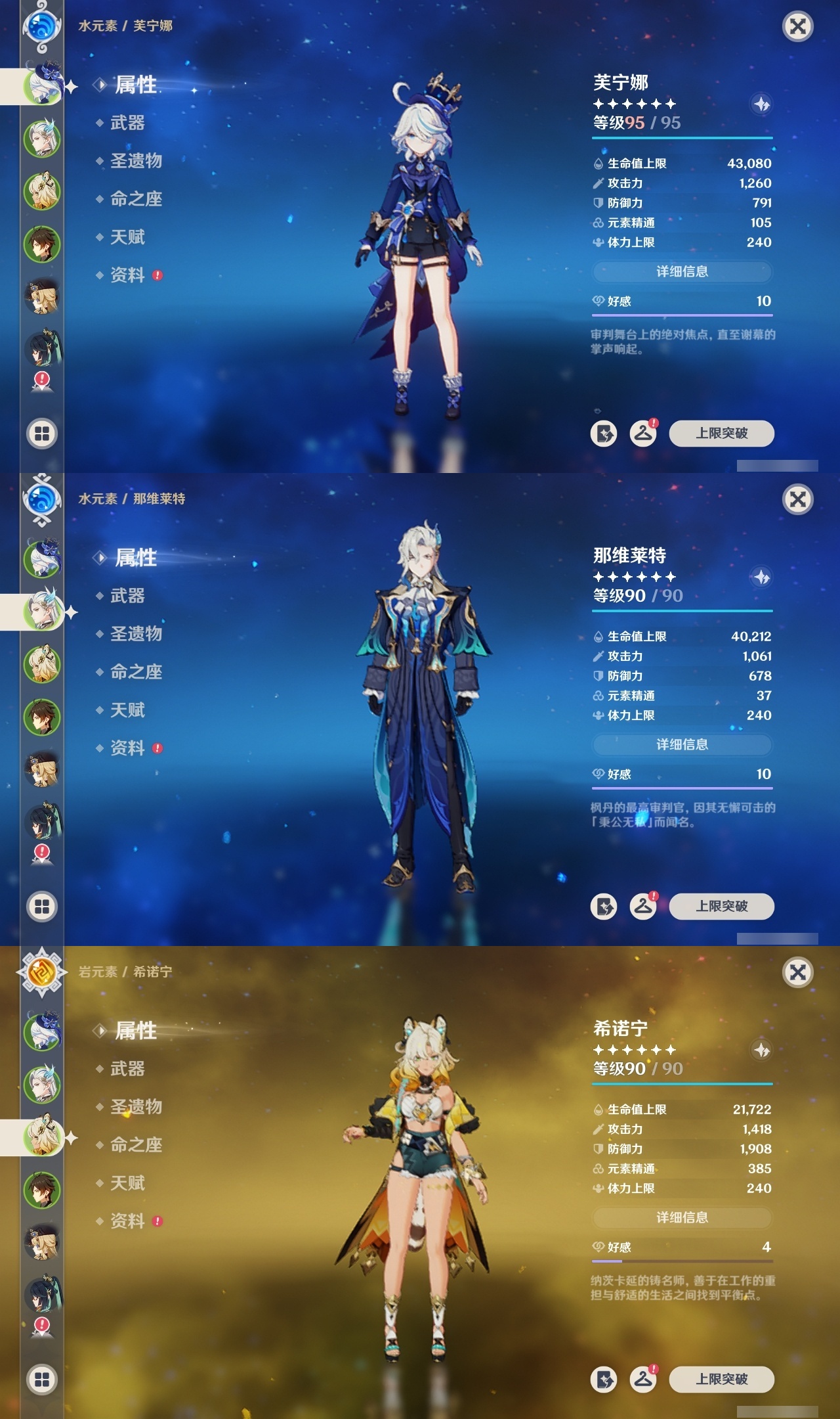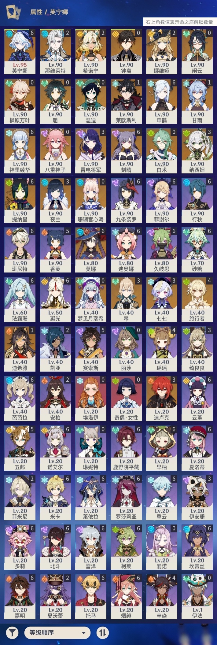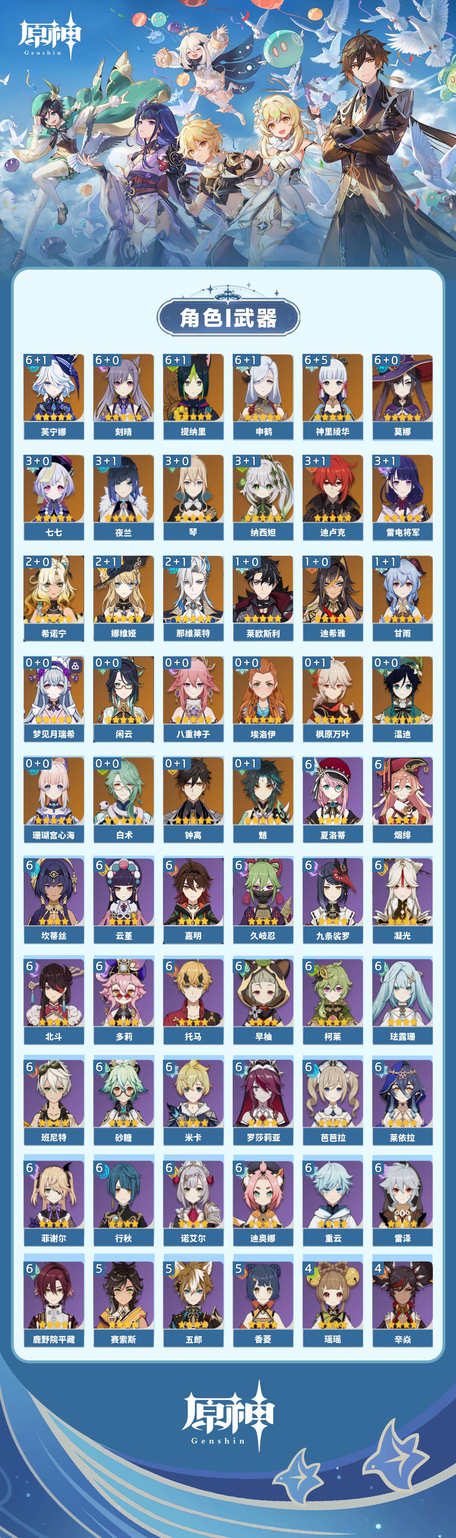 【原神】满命,冒险等级:60,五星数量:50,五星角色:芙宁娜 6命刻晴 6命莫娜 6命神里绫华 6命申鹤 6命提纳里 6命迪卢克 3命雷电将军 3命七七 3命琴 3命夜兰 3命纳西妲 3命希诺宁 2命那维莱特 2命娜维娅 2命迪希雅 1命莱欧斯利 1命甘雨 1命珊瑚宫心海白术温迪钟离梦见月瑞希八重神子闲云枫原万叶魈__五星武器:雾切之回光 5精天空之卷 2精天空之翼 2精万世流涌大典静水流涌之辉裁断阿莫斯之弓苍古自由之誓风鹰剑和璞鸢狼的末路四风原典天空之傲天空之脊无工之剑薙草之稻光息灾贯虹之槊若水猎人之径千夜浮梦__四星角色:班尼特 6命行秋 6命九条裟罗 6命久岐忍 6命鹿野院平藏 6命珐露珊 6命凝光 6命迪奥娜 6命砂糖 6命莱依拉 6命米卡 6命坎蒂丝 6命多莉 6命柯莱 6命芭芭拉 6命云堇 6命早柚 6命托马 6命烟绯 6命重云 6命诺艾尔 6命罗莎莉亚 6命雷泽 6命菲谢尔 6命北斗 6命夏洛蒂 6命嘉明 6命香菱 5命五郎 5命赛索斯 5命瑶瑶 4命辛焱 4命绮良良 3命伊安珊 3命菲米尼 2命夏沃蕾 2命埃洛伊奇偶·女性琳妮特伊法爱诺