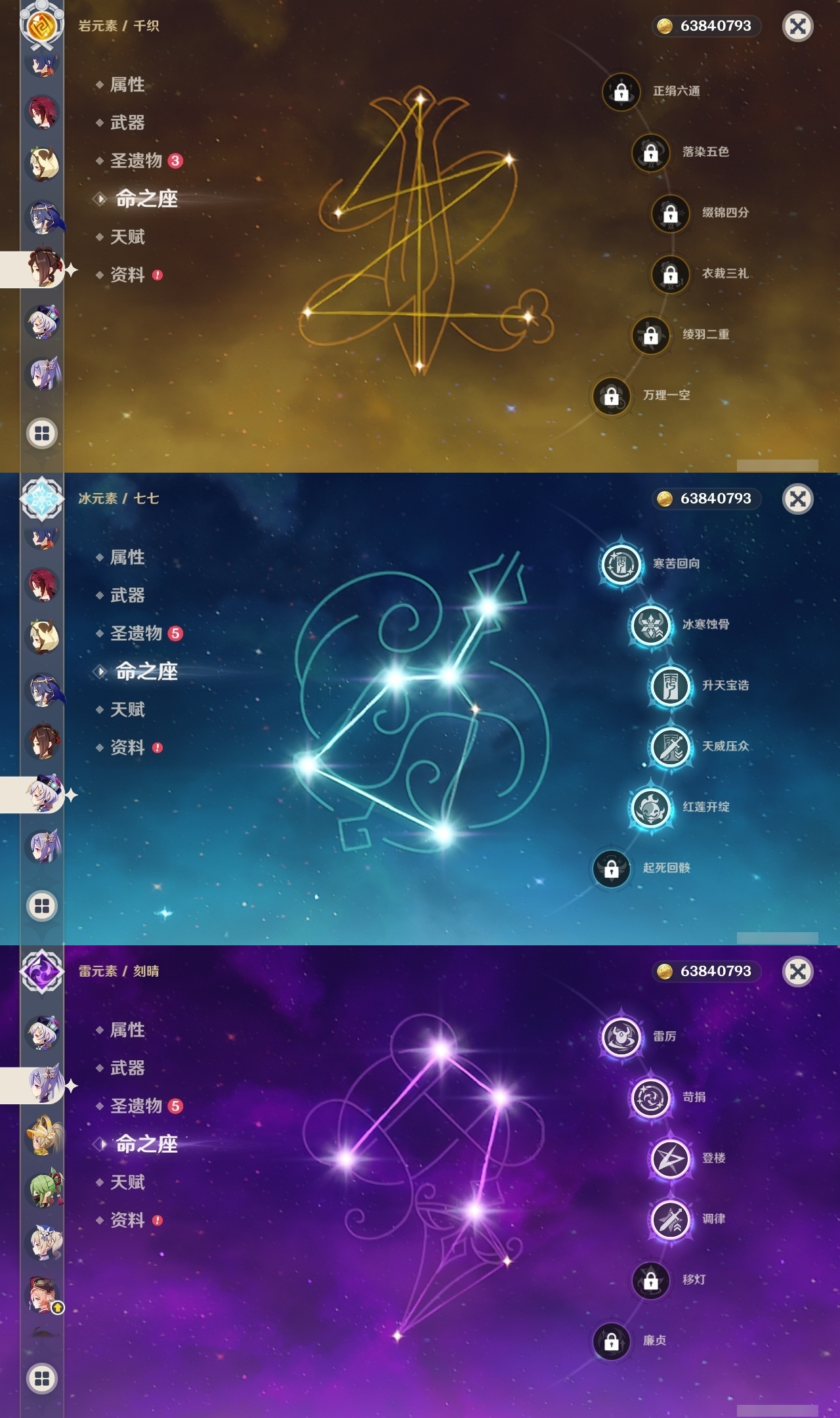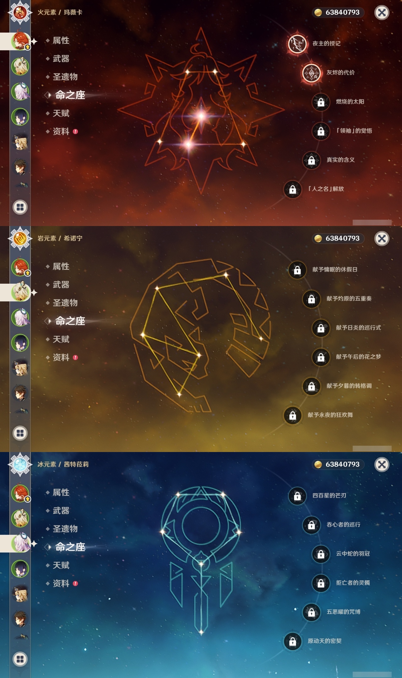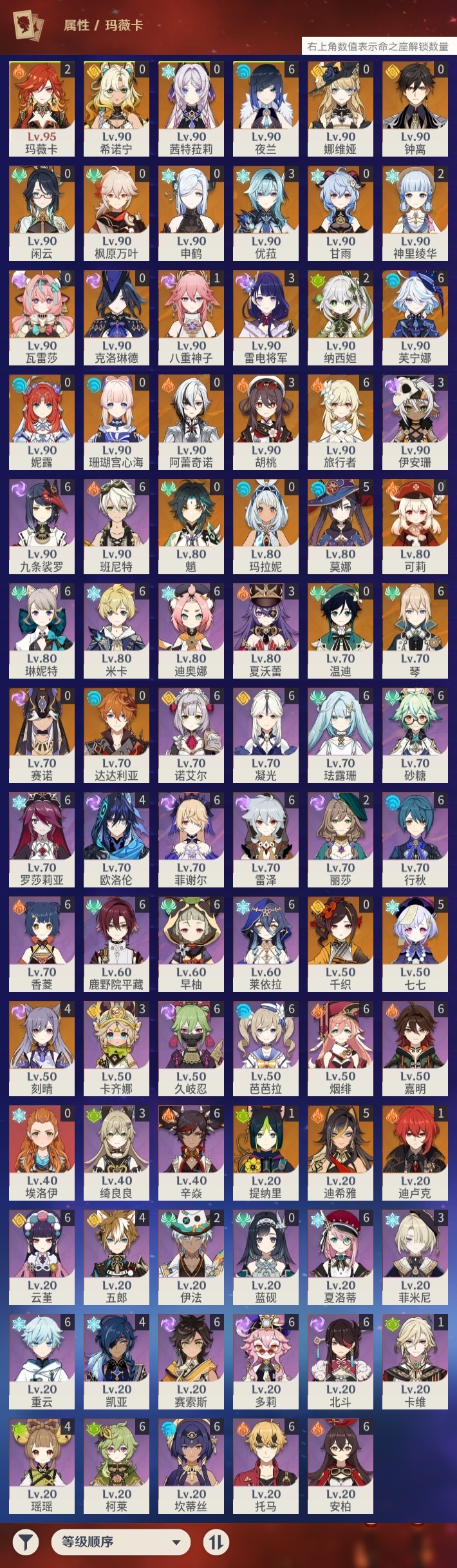 【原神】满命,冒险等级:60,五星数量:58,五星角色:芙宁娜 6命琴 6命夜兰 6命迪希雅 5命莫娜 5命七七 5命刻晴 4命胡桃 3命雷电将军 3命优菈 3命玛薇卡 2命神里绫华 2命纳西妲 2命迪卢克 1命八重神子 1命提纳里 1命玛拉妮珊瑚宫心海希诺宁温迪茜特菈莉钟离达达利亚申鹤瓦雷莎娜维娅闲云千织赛诺阿蕾奇诺妮露枫原万叶甘雨魈克洛琳德可莉__五星武器:天空之脊 5精狼的末路 3精和璞鸢 2精四风原典 2精终末嗟叹之诗 2精柔灯挽歌焚曜千阳静水流涌之辉裁断鹤鸣余音阿莫斯之弓苍古自由之誓护摩之杖松籁响起之时天空之傲天空之卷雾切之回光薙草之稻光波乱月白经津若水赤沙之杖__四星角色:班尼特 6命行秋 6命九条裟罗 6命香菱 6命久岐忍 6命鹿野院平藏 6命珐露珊 6命凝光 6命迪奥娜 6命砂糖 6命莱依拉 6命米卡 6命坎蒂丝 6命多莉 6命柯莱 6命芭芭拉 6命云堇 6命早柚 6命托马 6命烟绯 6命重云 6命辛焱 6命诺艾尔 6命罗莎莉亚 6命雷泽 6命菲谢尔 6命北斗 6命琳妮特 6命夏洛蒂 6命嘉明 6命赛索斯 6命瑶瑶 4命欧洛伦 4命五郎 4命卡齐娜 3命绮良良 3命菲米尼 3命夏沃蕾 3命伊安珊 3命伊法 2命卡维 1命埃洛伊蓝砚